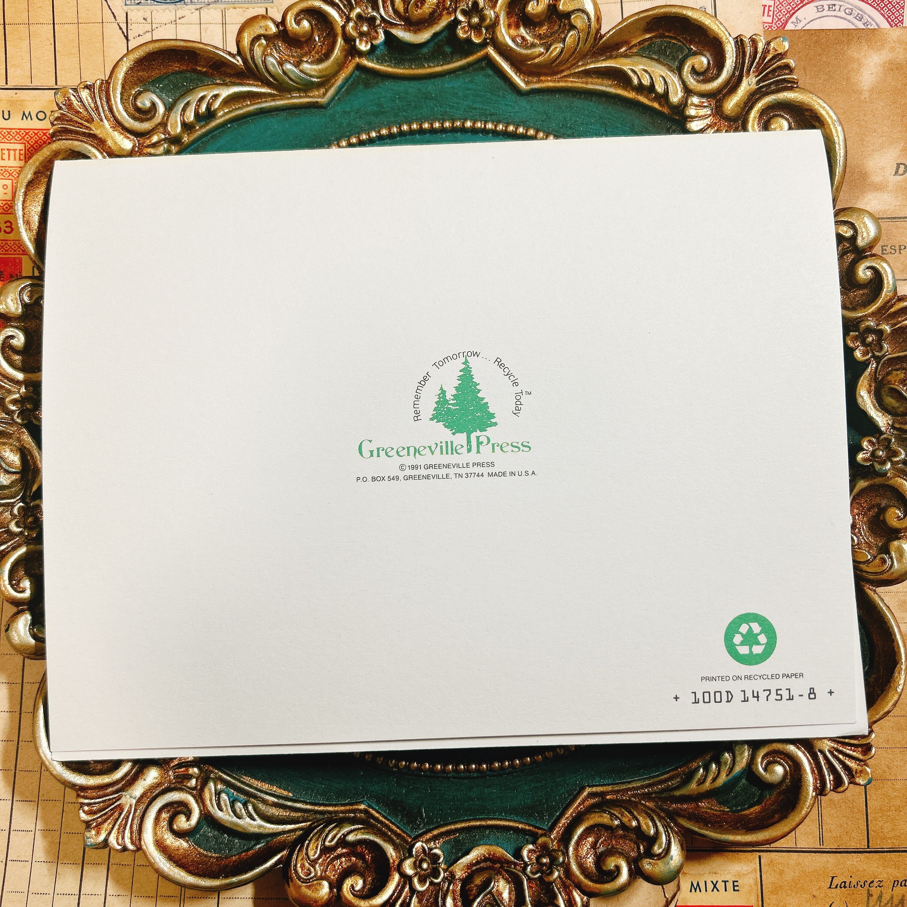 裏面にはGreeneville Pressのロゴと「Printed on recycled paper」の表記があり、1998年製造の印が確認できます。環境に配慮したリサイクル紙が用いられており、手触りの優しい質感も魅力。額装やディスプレイにも映える、静謐で気品あふれるクリスマスカードです。