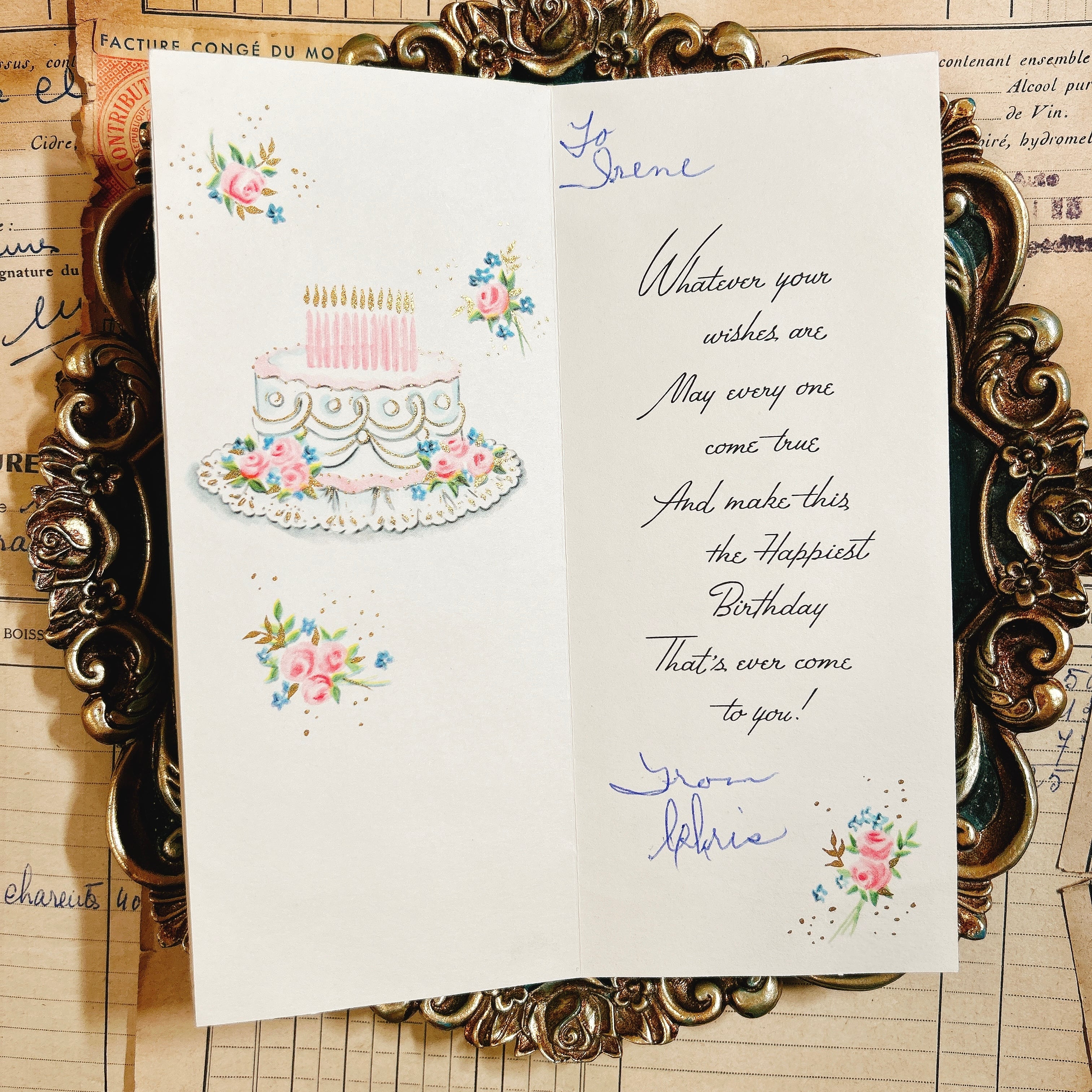 カードを開くと、左側にも同じくバースデーケーキのイラストが施され、右側には「Whatever your wishes are, May every one come true…」と美しい筆記体で祝福の言葉が綴られています。宛名と送り主の手書きサインが残っており、当時のぬくもりを感じる一点ものです。