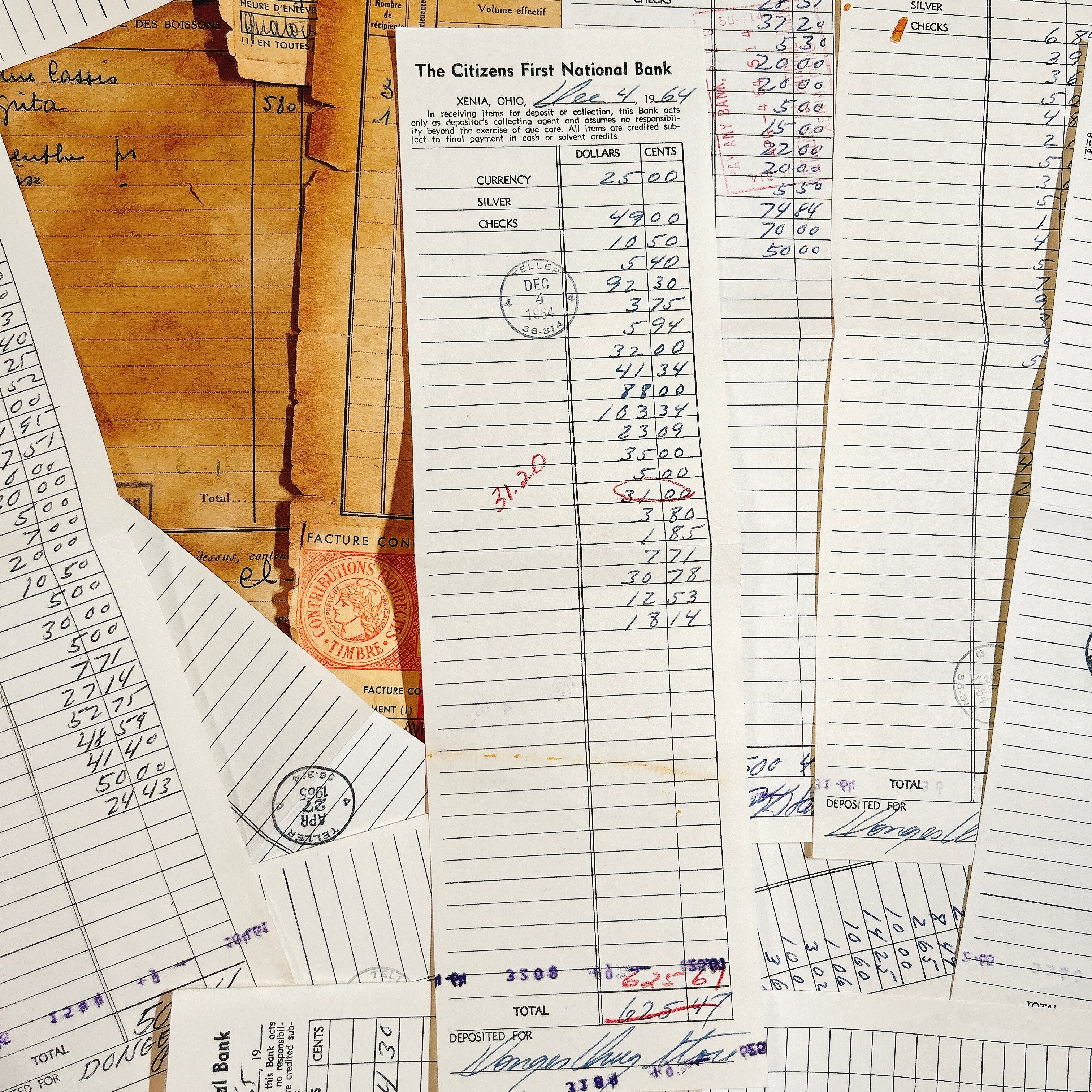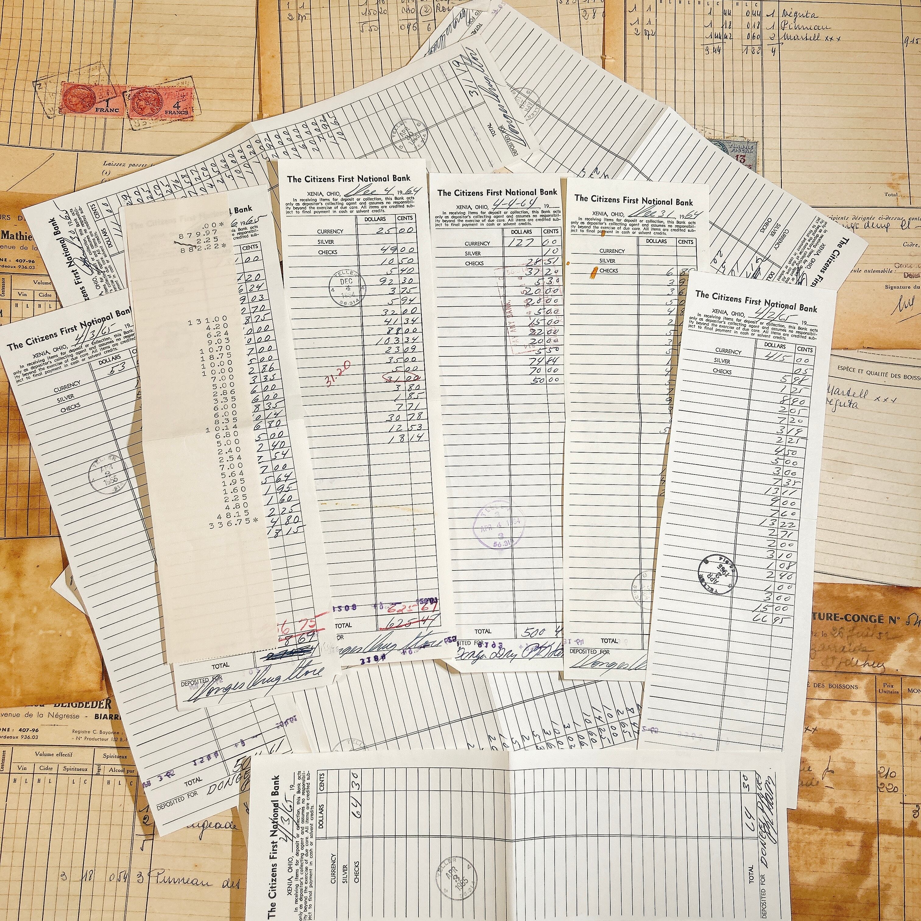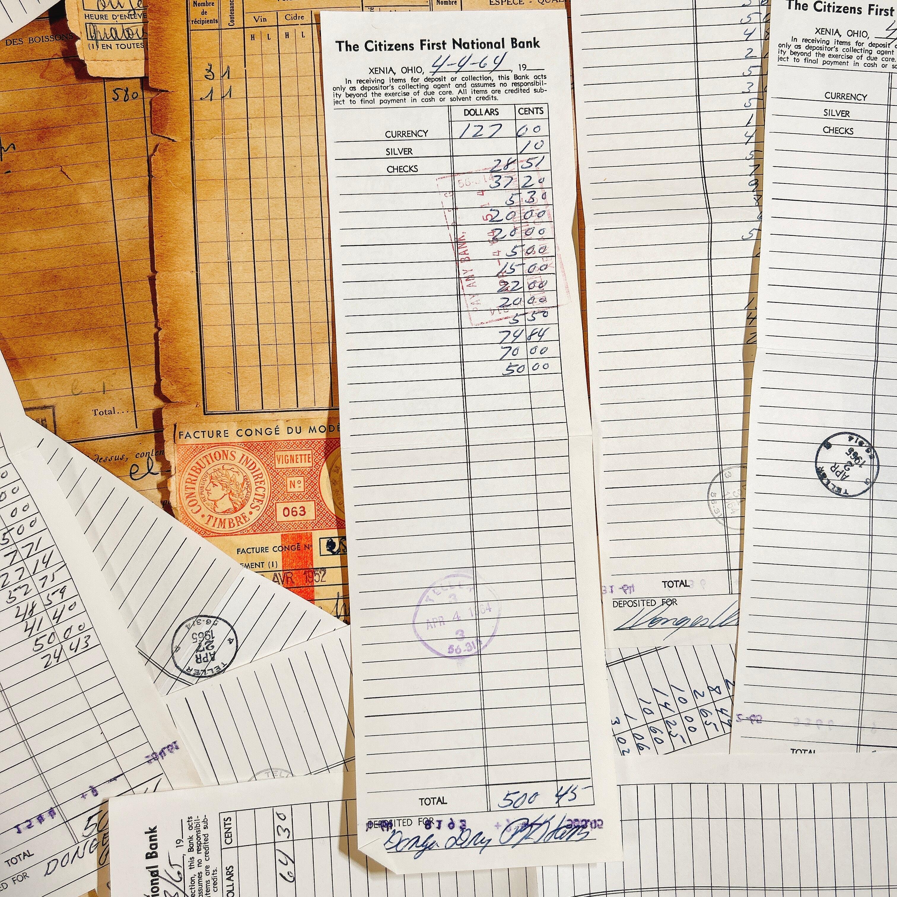アメリカ・オハイオ州にある「The Citizens First National Bank」の入金伝票がまとまった20グラムセットです。画像に見られるように、1960年代のものを中心に使用済みの記録で、青インクで丁寧に数字や署名が書き込まれています。スタンプも押されており、当時の銀行業務の空気を感じられる資料的価値の高いアイテムです。