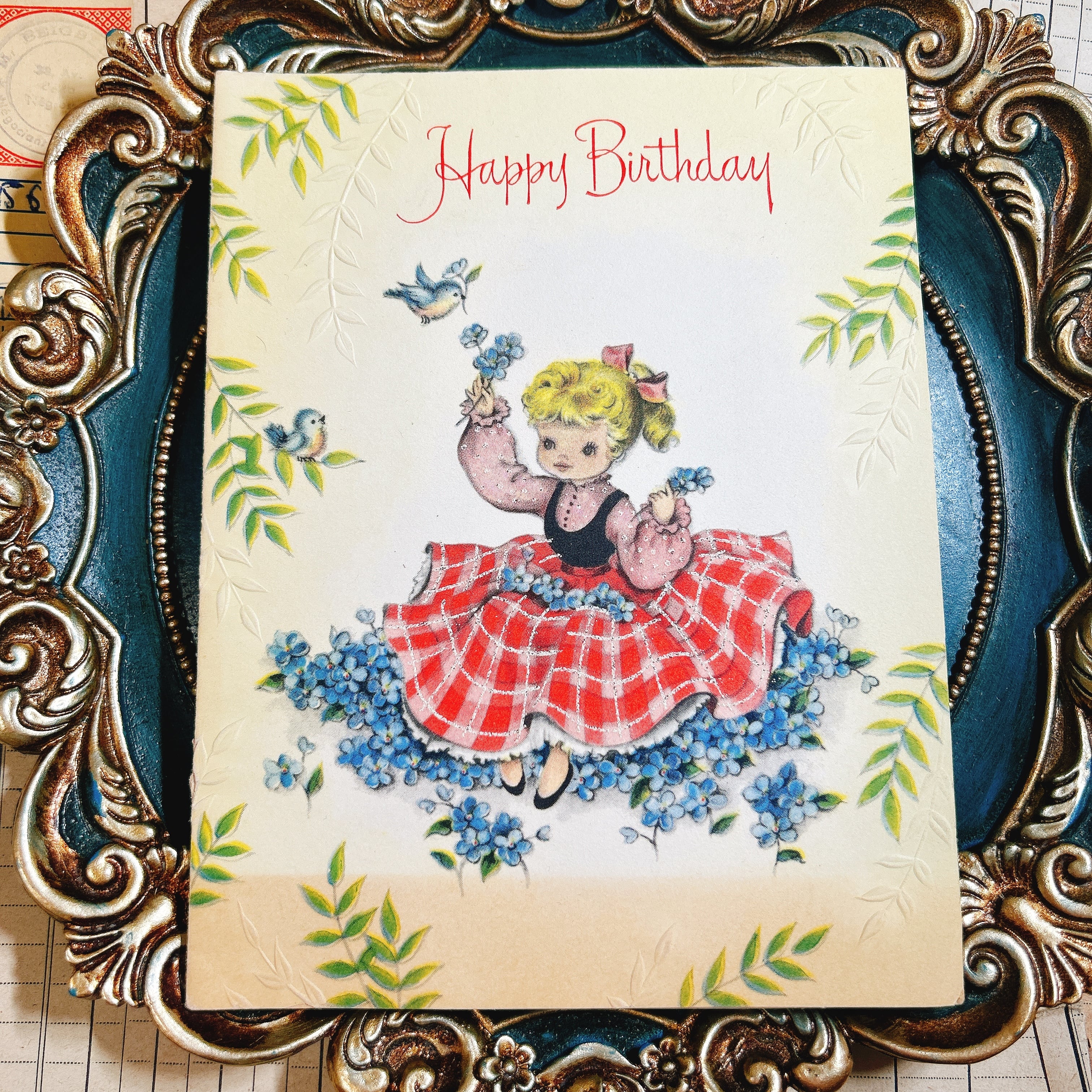 こちらは、アメリカ「Forget-Me-Not」社製のヴィンテージバースデーカードです。表紙には、ブロンドの女の子が赤いチェックのスカートを広げ、小鳥たちと共にブルーの花々に囲まれて座っている、愛らしいイラストが描かれています。柔らかな色合いと繊細な葉のエンボス加工が施されており、古き良き時代の温もりが感じられる一枚です。