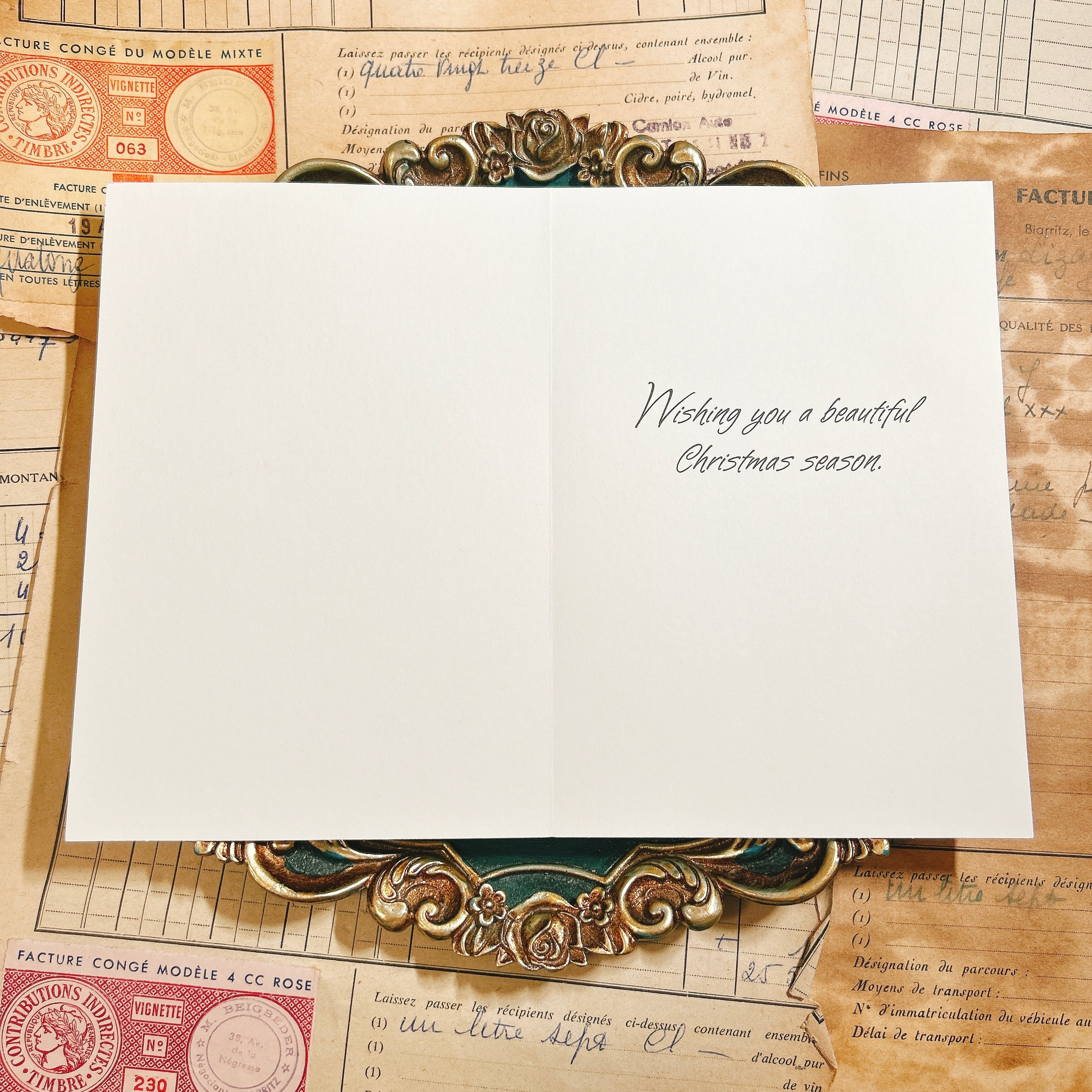 カードを開くと、右ページに「Wishing you a beautiful Christmas season.」というシンプルで上品なメッセージが印刷されており、贈る相手を選ばず幅広いシーンで使える一枚です。左ページは白紙のため、自由にメッセージを書き込むことができます。上質な紙に印刷されたこのカードは、手に取ると程よい厚みと滑らかな質感があり、高級感があります。