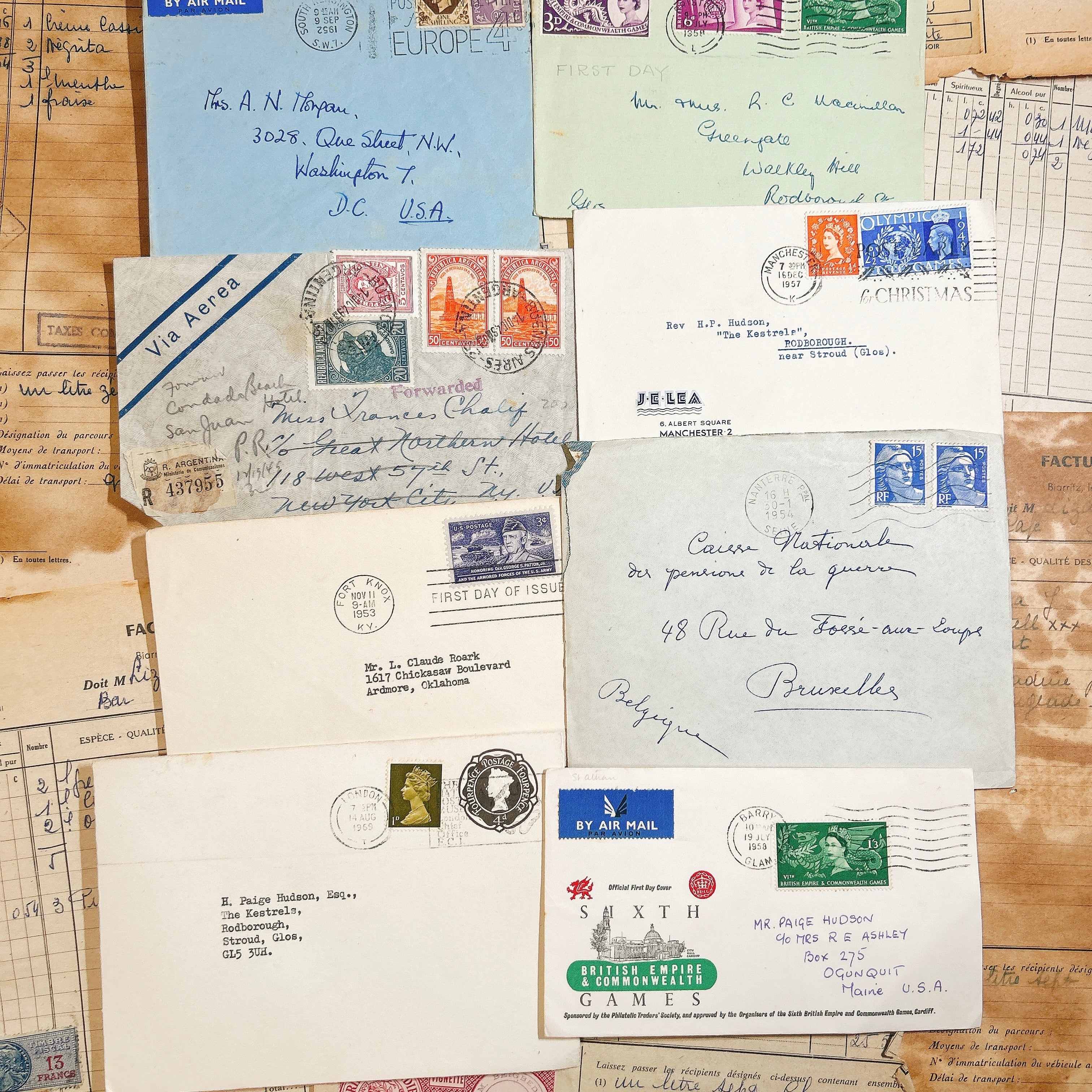 中には、エアメール用の独特なデザインの封筒や、華やかな切手が添えられたものも含まれており、当時の郵便事情や国際交流を垣間見ることができます。エレガントな書体の宛名や、イギリスの伝統的な郵便スタンプが組み合わさった封筒もあり、それぞれが個性豊かで異なる物語を語りかけてきます。