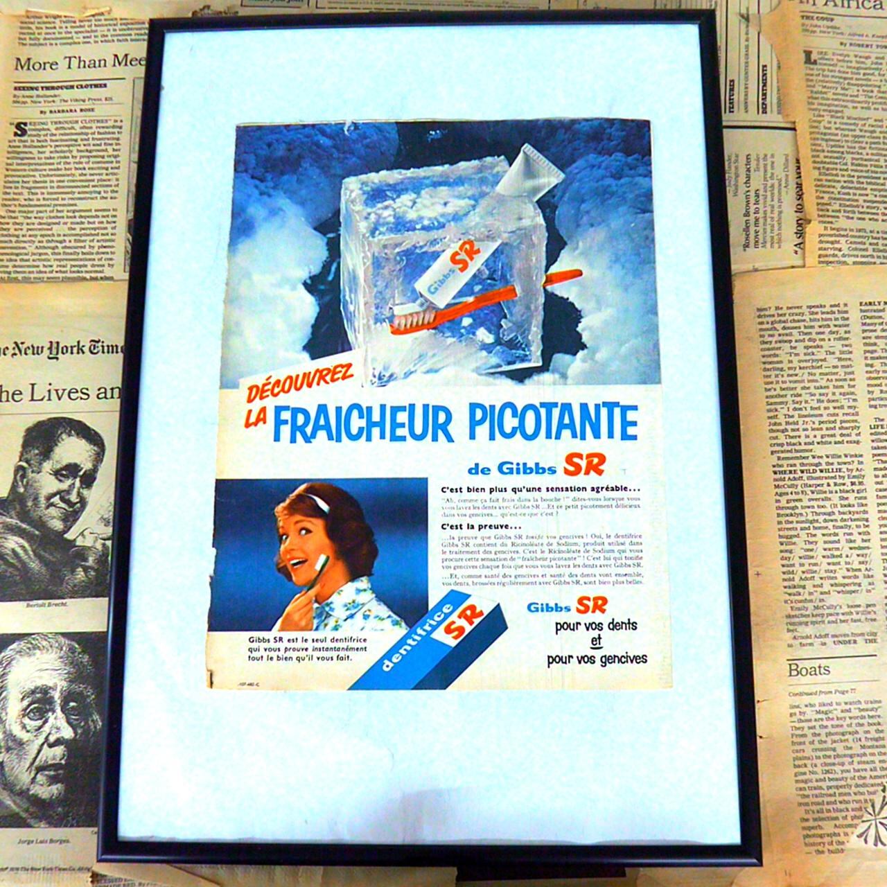 Gibbsは、主に歯磨き粉やパーソナルケア製品を展開していたフランス発祥のブランドです。20世紀中盤には特に、その斬新な広告展開と、清涼感や効果の高さを強調した商品開発でヨーロッパを中心に広く認知されました。Gibbsの歯磨き粉は、当時としては先進的な成分配合やデザイン性にも優れ、特に歯と歯茎の健康を訴求する商品が主力でした。この広告では、氷のイメージを用いることで、使用後の爽快感やピリッとした清涼感を視覚的に伝えています。Gibbsは、長年にわたりオーラルケア分野で信頼されるブランドとして、現代の歯磨き粉市場の礎を築いた存在です。