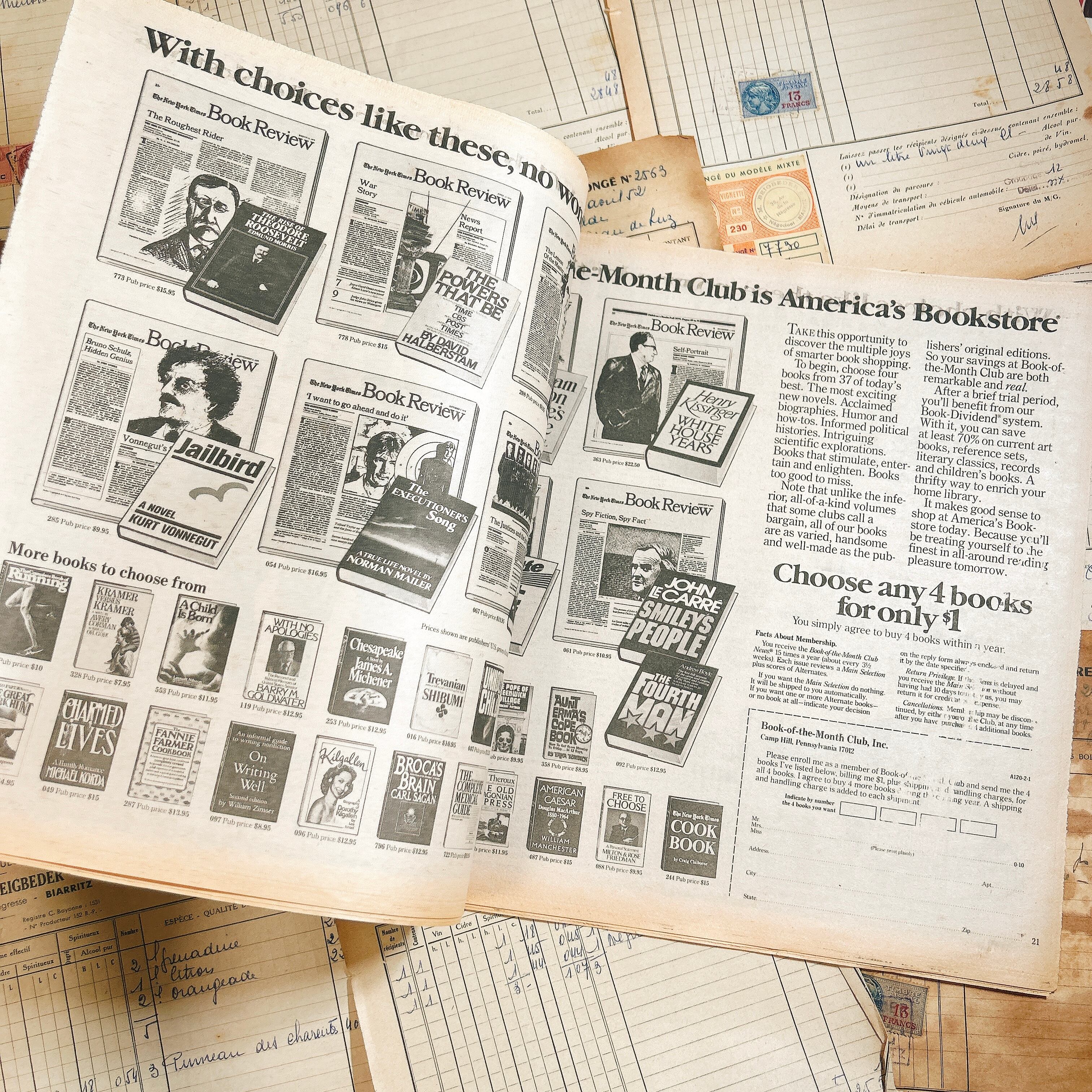 こちらは1980年代『The New York Times Book Review』のヴィンテージ新聞1冊です。ニューヨーク・タイムズが毎週日曜日に発行しているブックレビュー専門の別冊紙で、文学やノンフィクションを中心にした評論や特集が豊富に掲載されています。1980年当時の知的文化を色濃く反映した内容が紙面を彩ります。