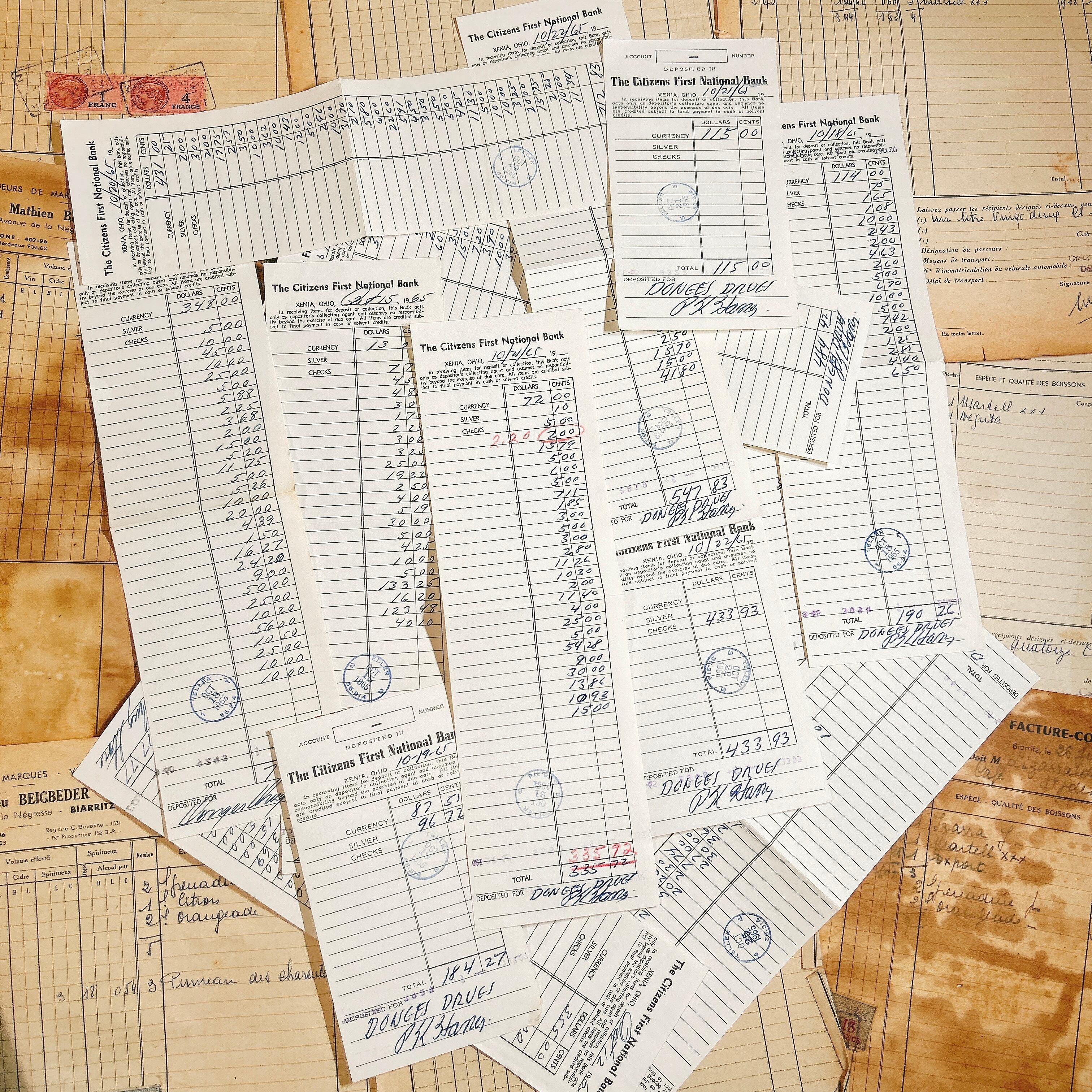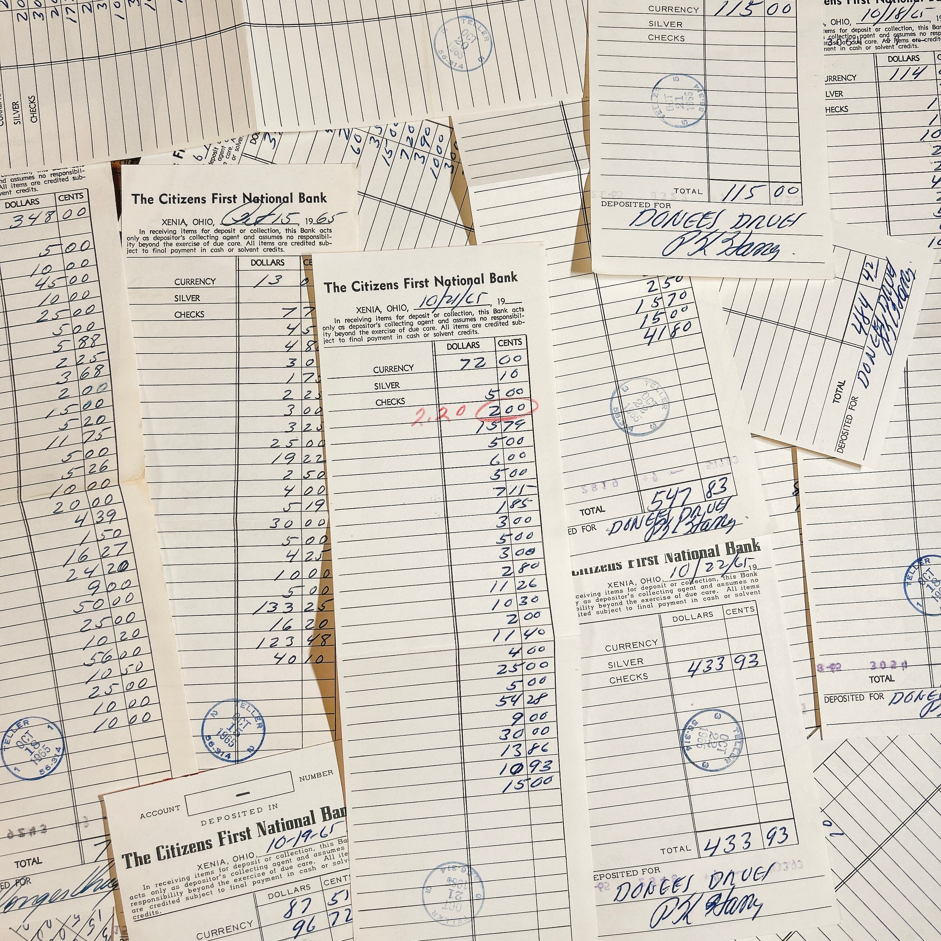 アメリカ・オハイオ州にある「The Citizens First National Bank」の入金伝票がまとまった20グラムセットです。画像に見られるように、1960年代のものを中心に使用済みの記録で、青インクで丁寧に数字や署名が書き込まれています。スタンプも押されており、当時の銀行業務の空気を感じられる資料的価値の高いアイテムです。