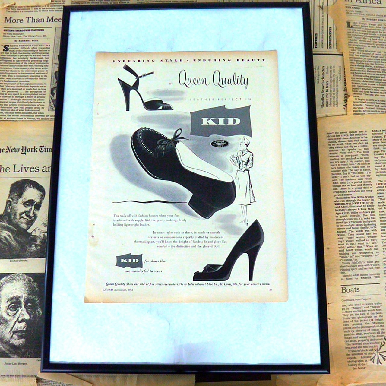 International Shoe Co.は、20世紀前半から中盤にかけてアメリカを代表する大手靴メーカーのひとつとして知られていました。高品質なレザーシューズや婦人靴をはじめ、幅広い種類の靴を展開しており、特に機能性とデザイン性の両立を重視した靴作りが特徴です。婦人靴ブランド『Queen Quality』などを展開し、多くの消費者に愛用されていました。当時の広告には、伝統と革新を融合した靴づくりへのこだわりや、上質な素材選びへの自信がうかがえます。時代を超えたスタイルと快適さを提供し続ける姿勢が、多くの人に支持されていた企業です。