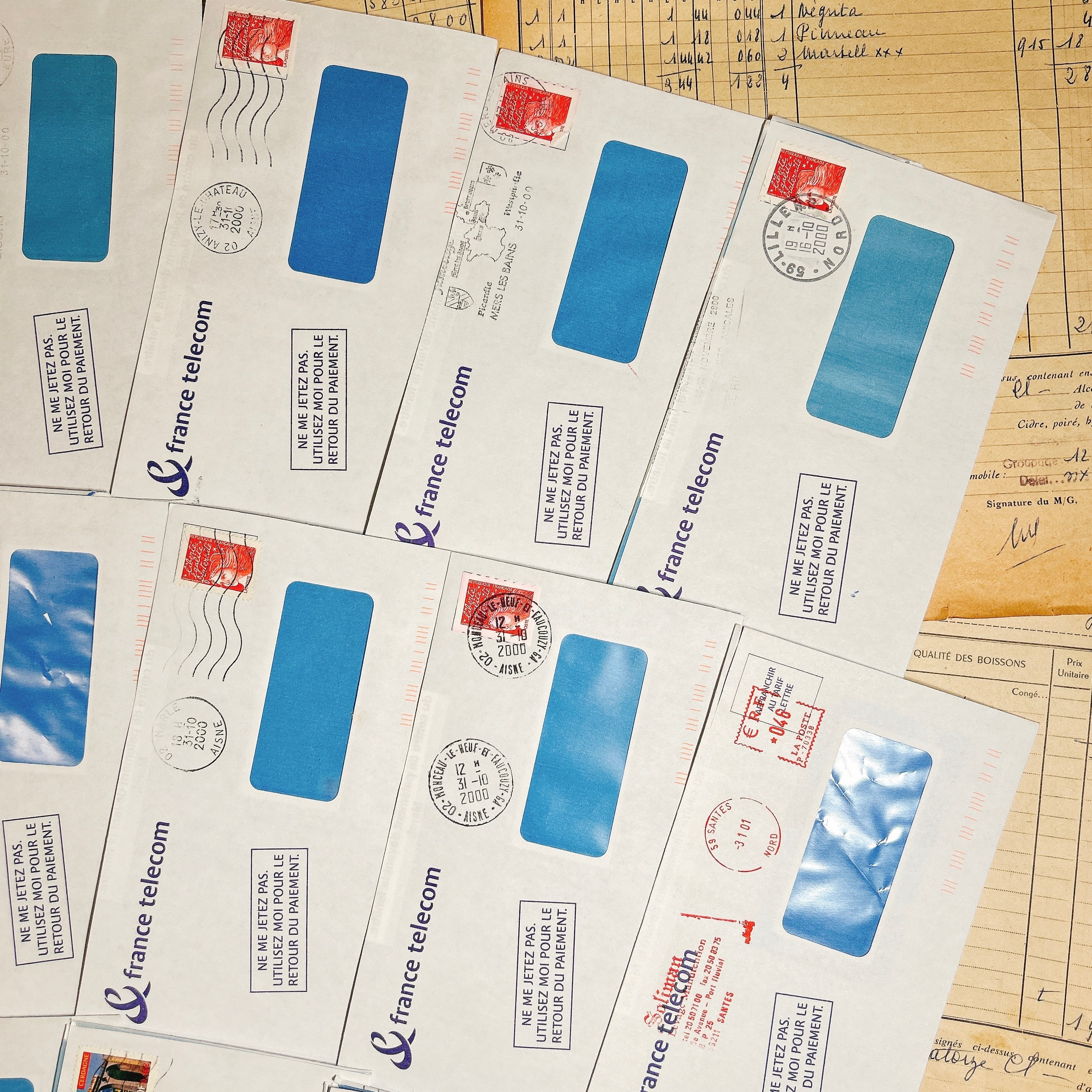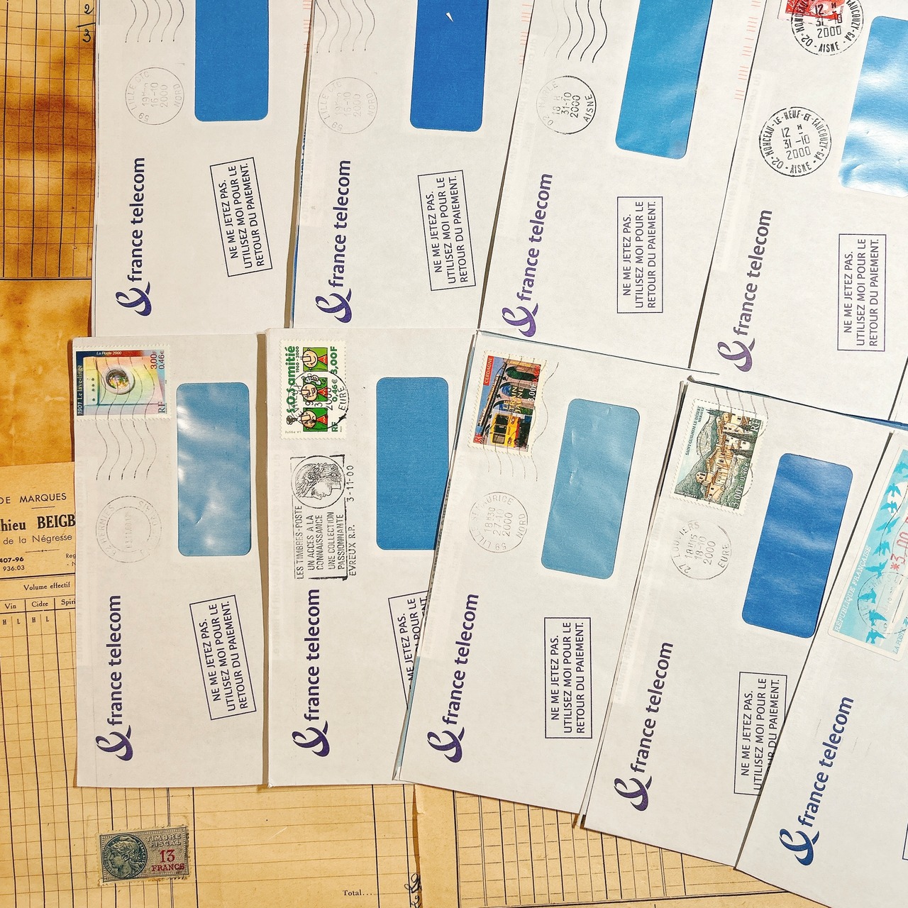 こちらは、フランスの通信会社「France Telecom」から送られた実際の郵便封筒15枚セットです。封筒はいずれもウィンドウ付きの定型サイズで、1990年代後半から2000年代初頭にかけて使用されたものと思われます。経年感や消印、切手のバリエーションが、当時の生活感や通信文化を物語っています。
