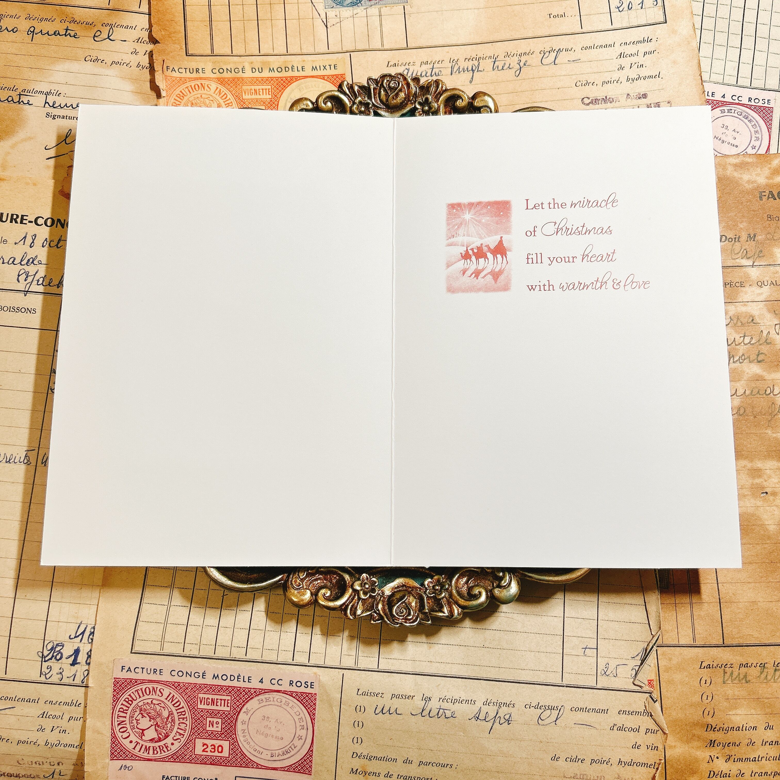 内側には「Let the miracle of Christmas fill your heart with warmth & love」というメッセージが添えられ、小さな挿絵が優しく彩りを添えています。紙質はしっかりとしており、落ち着いた質感が手に馴染みます。