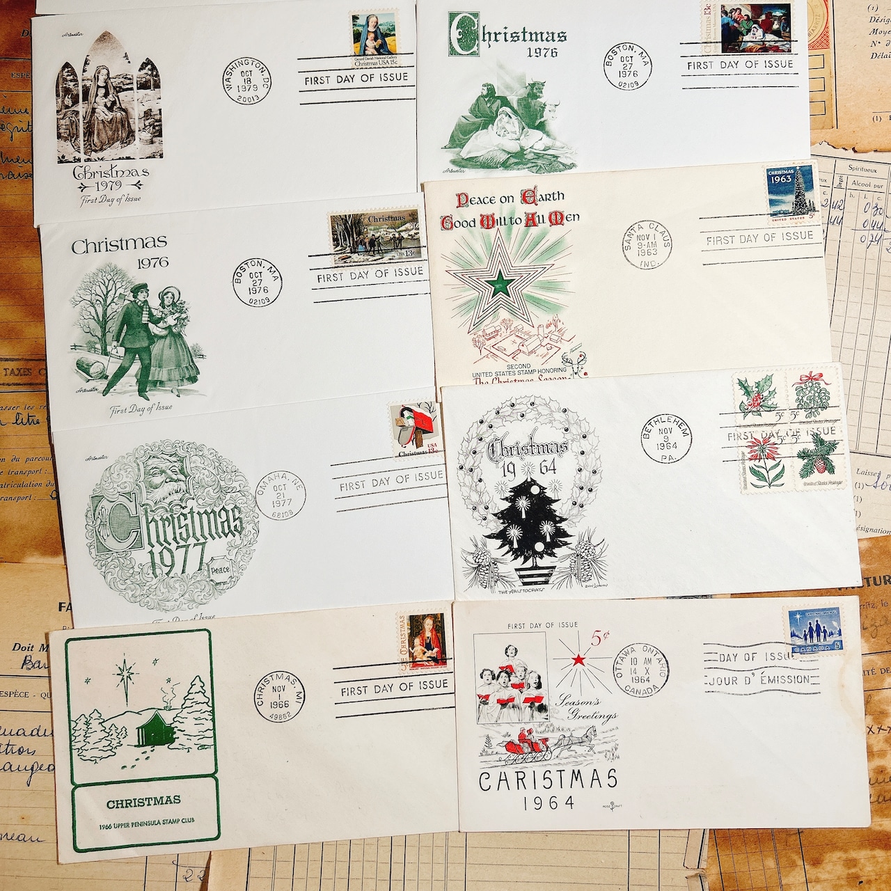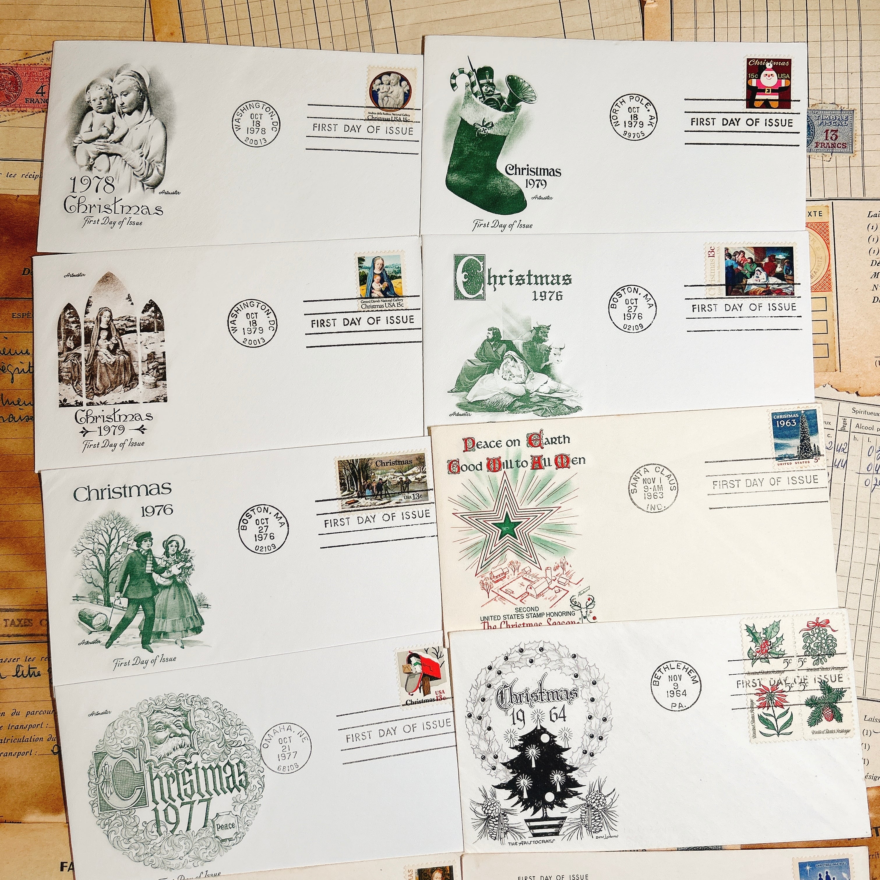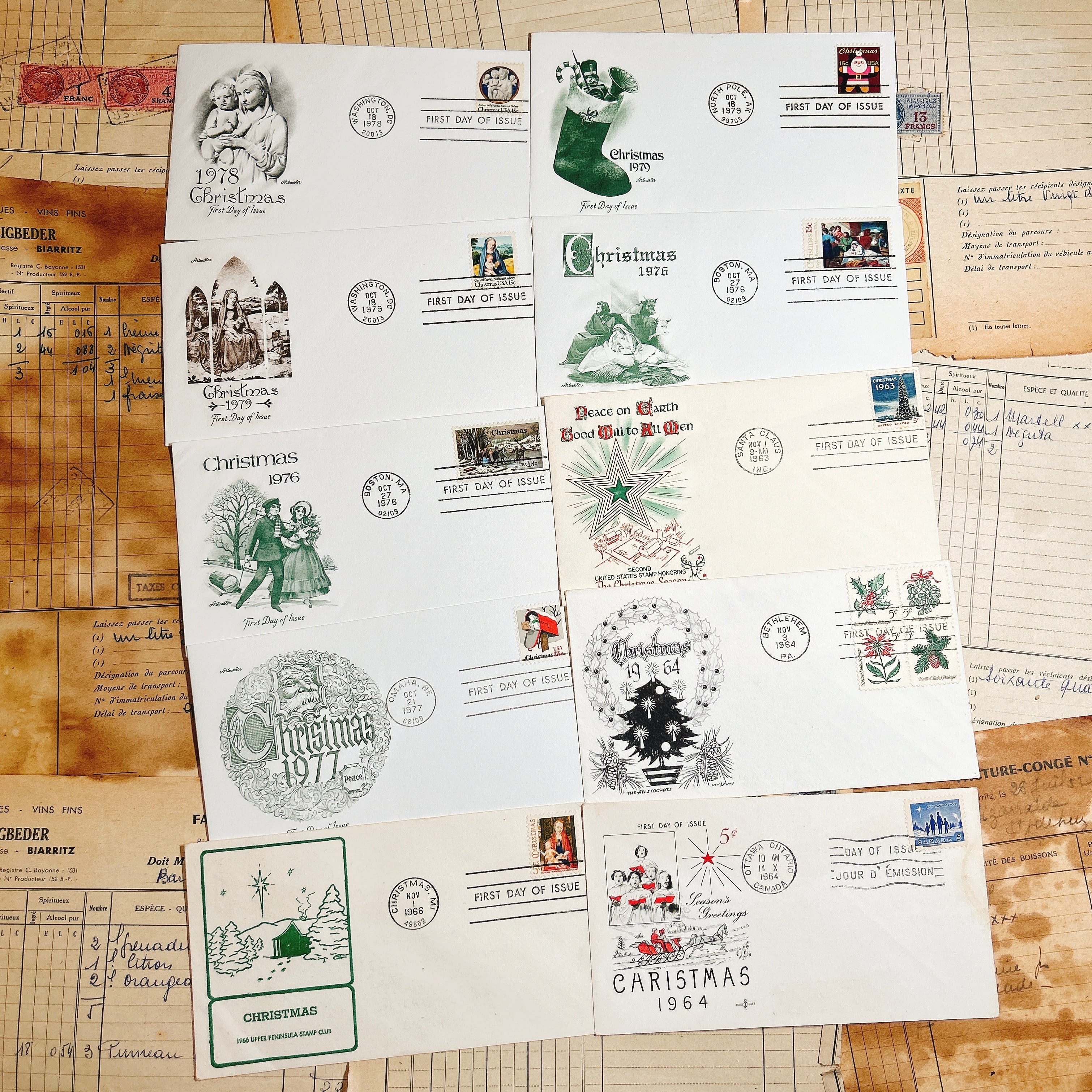 アメリカやカナダで発行された、1960〜1970年代のクリスマスをテーマにした初日カバー封筒10枚セットです。どの封筒にも「FIRST DAY OF ISSUE(初日発行)」の消印が押され、季節の祝福をモチーフにした美しいイラストが添えられています。聖母子、雪景色、星降る夜、クリスマスツリー、リースなど、当時の印刷技術ならではの繊細なタッチと彩りが魅力的です。