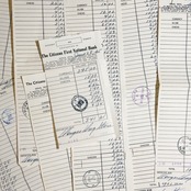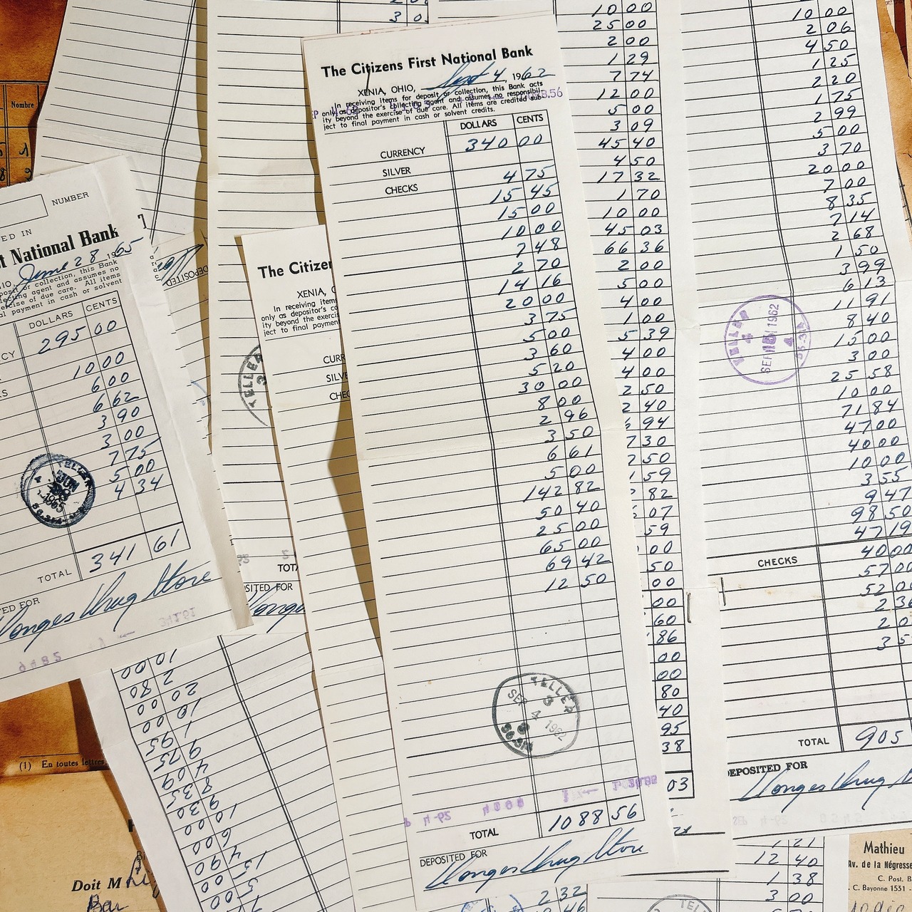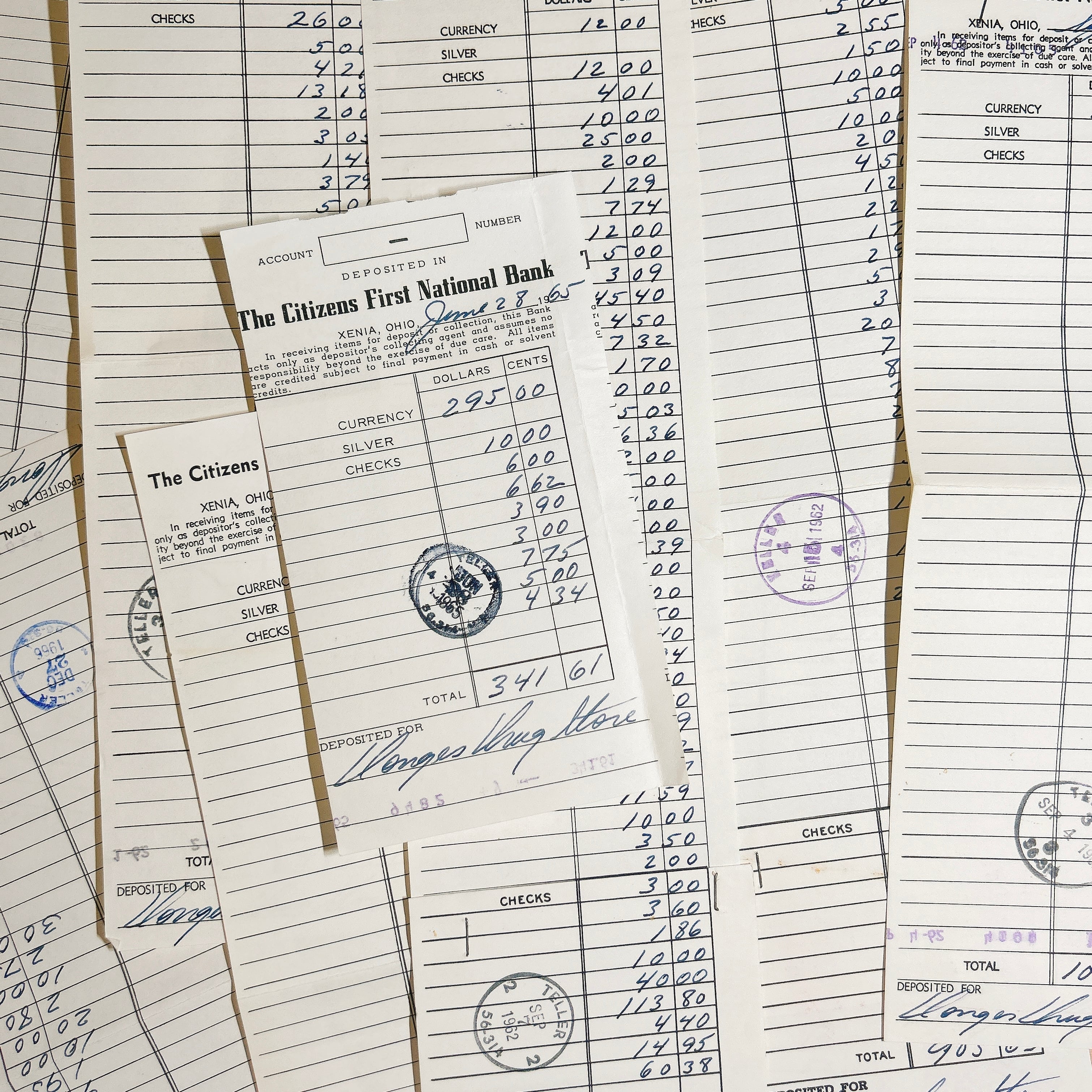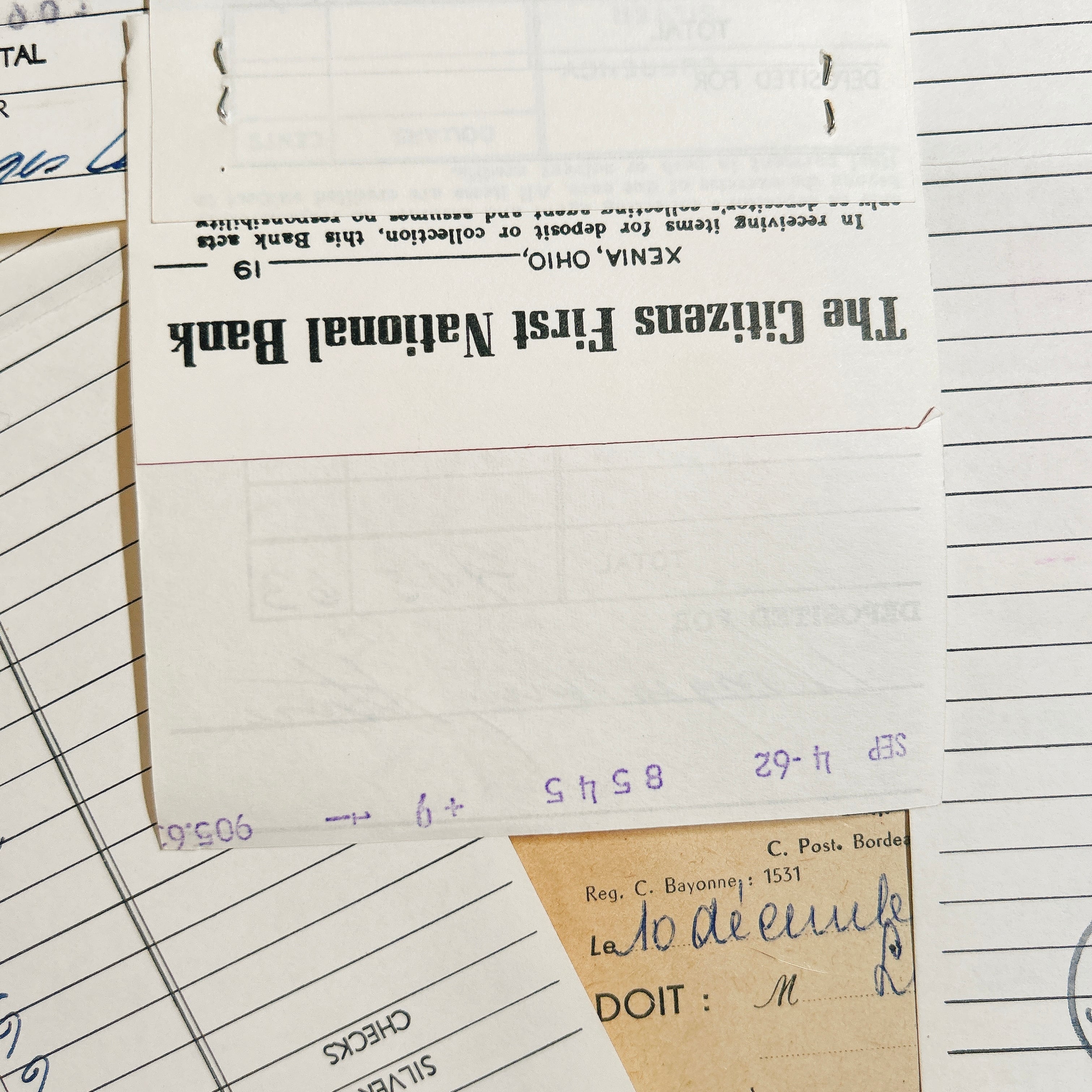 アメリカ・オハイオ州にある「The Citizens First National Bank」の入金伝票がまとまった20グラムセットです。画像に見られるように、1960年代のものを中心に使用済みの記録で、青インクで丁寧に数字や署名が書き込まれています。スタンプも押されており、当時の銀行業務の空気を感じられる資料的価値の高いアイテムです。