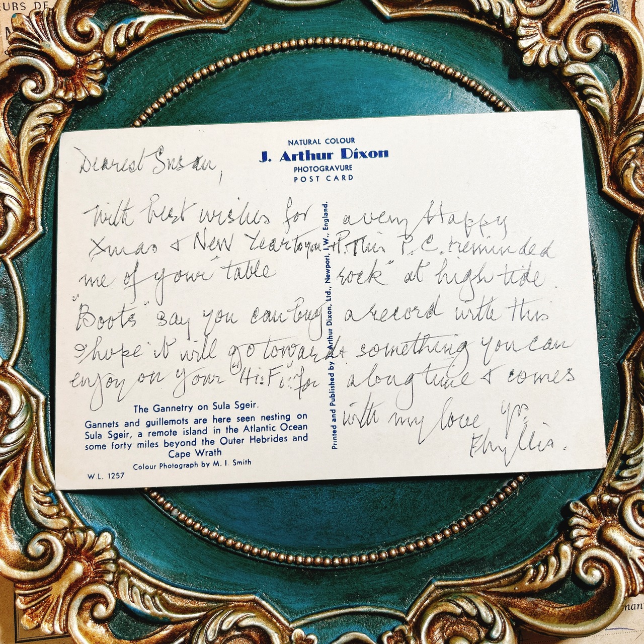 こちらは、スコットランド沖の孤島スラ・スケア(Sula Sgeir)で撮影された「The Gannetry on Sula Sgeir」のヴィンテージポストカードです。岩礁の上に無数のカツオドリが羽を休める光景が広がり、北大西洋の荒々しくも神秘的な自然をそのまま写し取った一枚です。海鳥たちの白い羽と岩肌のコントラスト、そして遠くに見える海の青が、冷たい海風や潮の香りを思わせます。