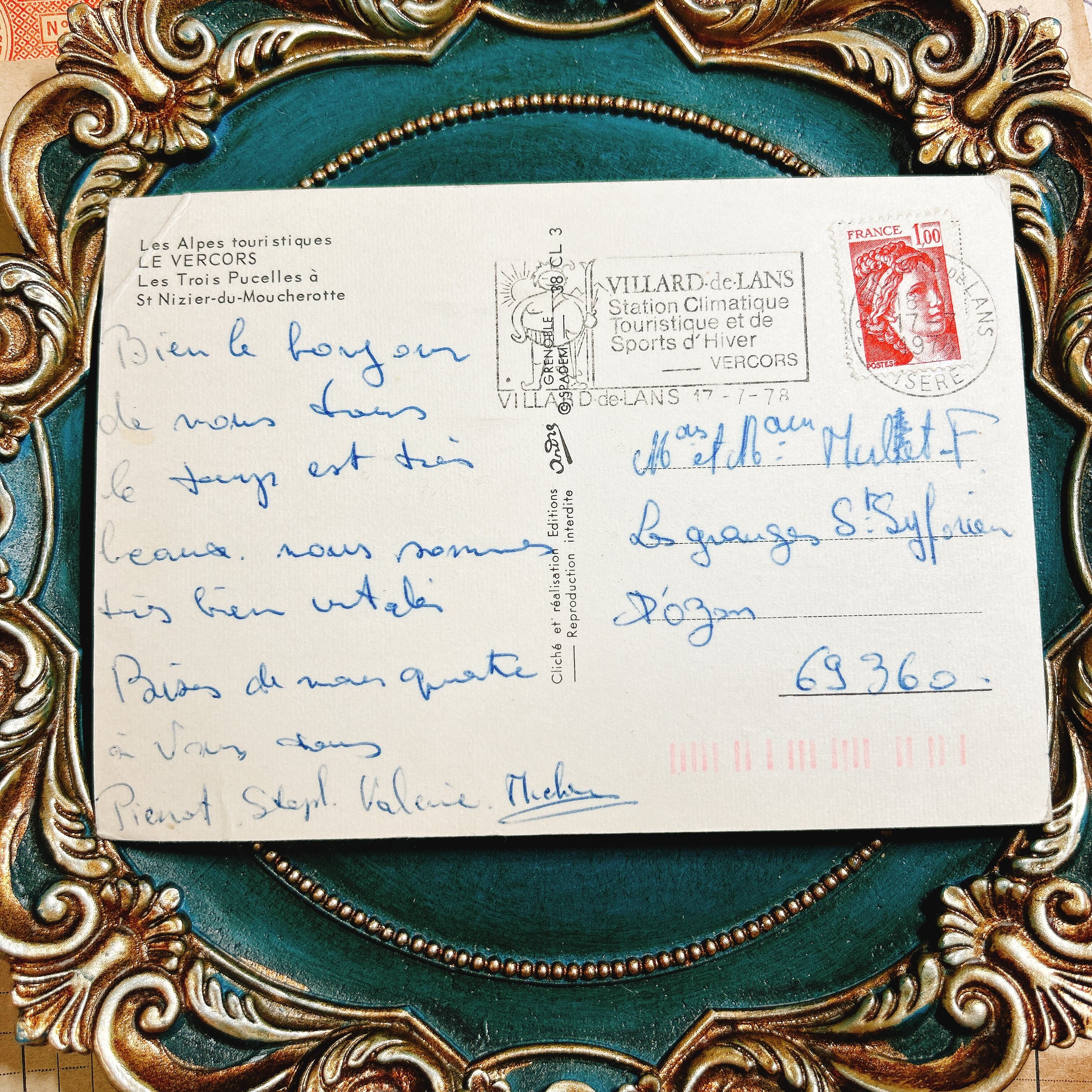 裏面には、フランス語で丁寧に書かれた手書きメッセージが残されており、旅行中の穏やかな時間と親しい人への思いが伝わります。ヴィラール=ド=ラン(Villard-de-Lans)で押された消印と、赤いマリアンヌ切手が当時の郵政文化を物語り、旅の記録としても魅力的です。
