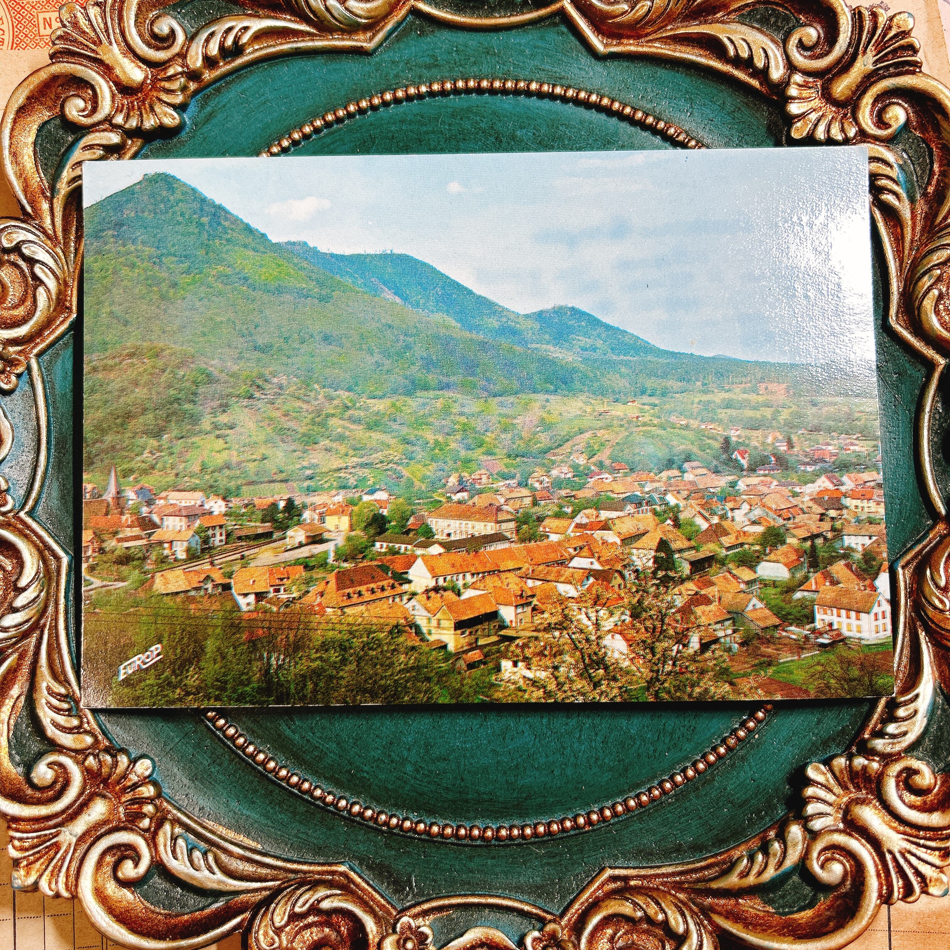 フランス東部アルザス地方、リープヴル(Lièpvre)の全景を写した1981年のヴィンテージポストカードです。赤い屋根が連なる小さな町並みと、背後にそびえる緑豊かな山々が美しいコントラストを描き、まるで童話の一場面のような静かな風景が広がっています。手前には教会の尖塔が見え、山の斜面には畑や林が点在し、アルザス地方特有ののどかな田園風景を感じさせます。
