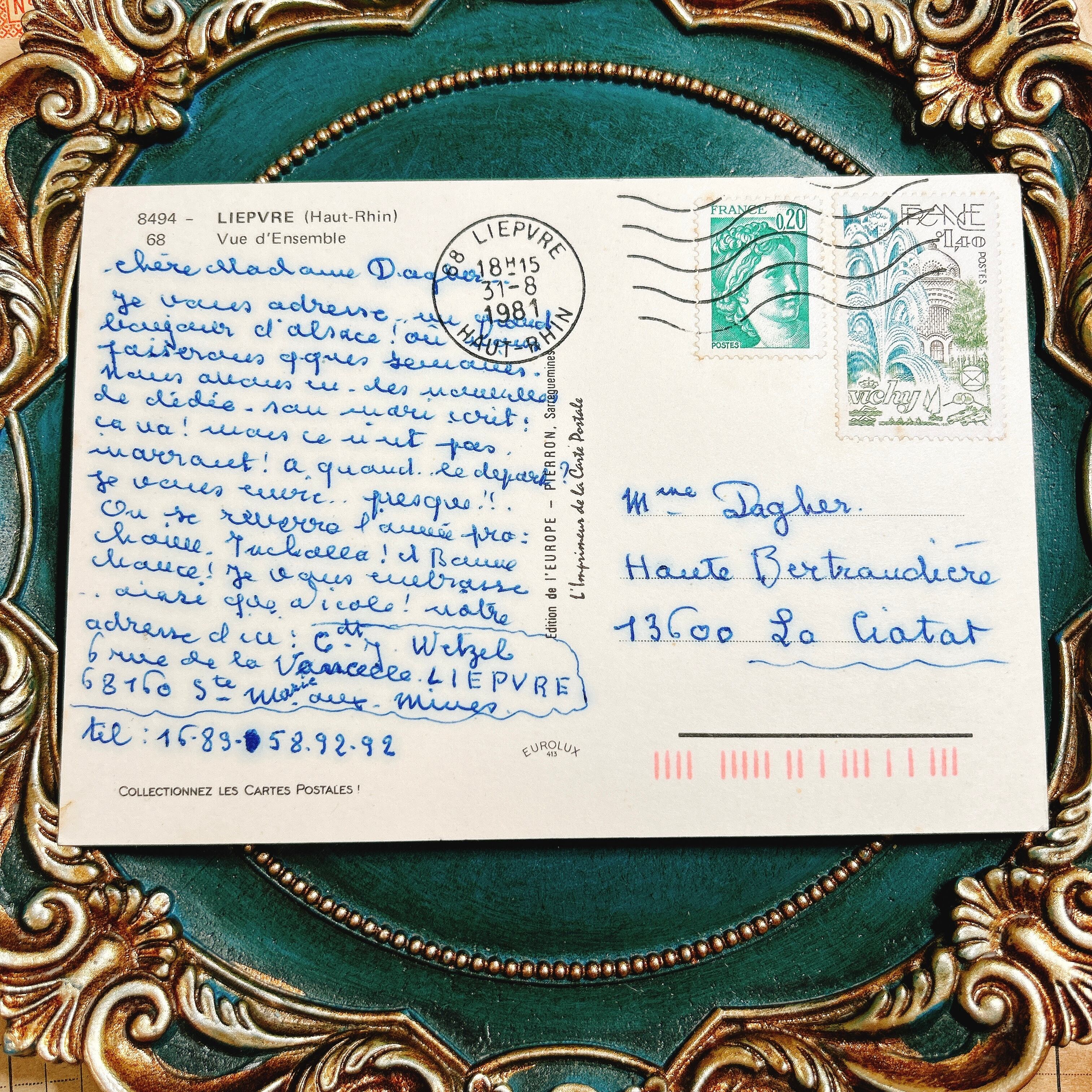 裏面には青いインクで綴られた丁寧な筆記が残り、旅先から送られた親しみのこもったメッセージがそのまま当時の空気を伝えています。切手はフランスの象徴であるマリアンヌと、ヴィシー温泉を描いた絵柄の2枚が貼付され、LIEPVREの消印が1981年8月31日の日付を示しています。