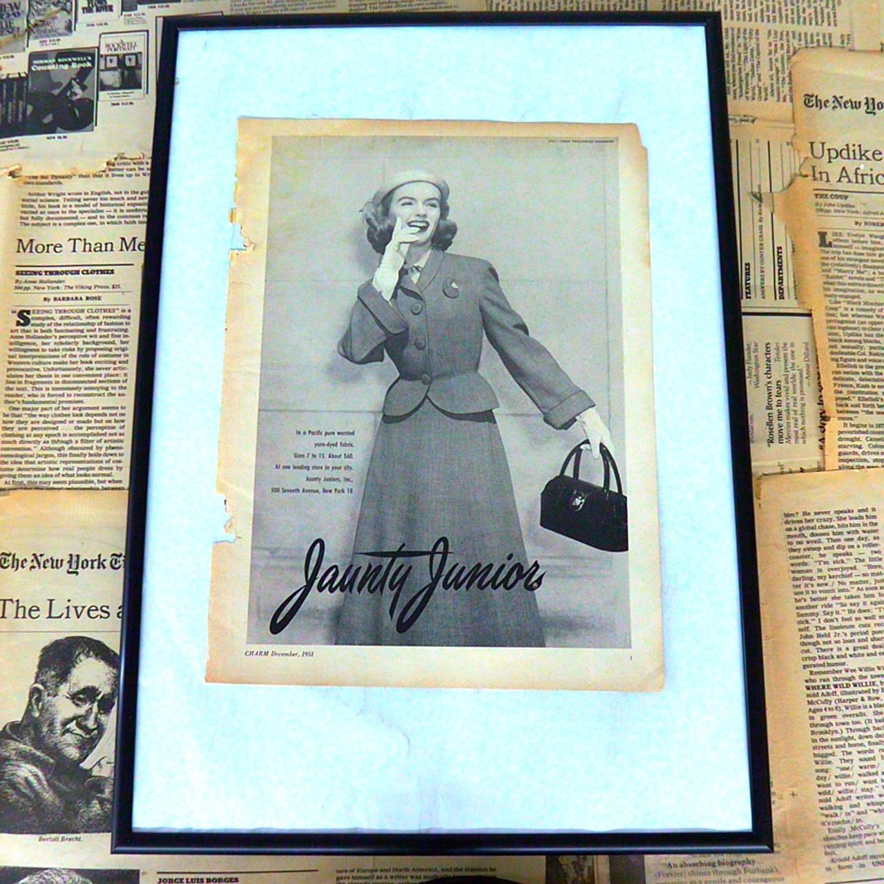 Jaunty Juniorsは、20世紀中頃にアメリカで展開されていたレディースファッションブランドです。当時の若い女性をターゲットに、洗練されたデザインと高品質な素材を用いたアパレルを提供していました。特にスーツやワンピース、コートなど、上品かつ実用的なスタイルが特徴で、都会的な女性像を象徴するブランドとして多くの雑誌広告にも登場しました。新しい女性らしさや自信、躍動感を体現したブランドイメージは、1950〜60年代のファッション文化を象徴する存在として知られています。