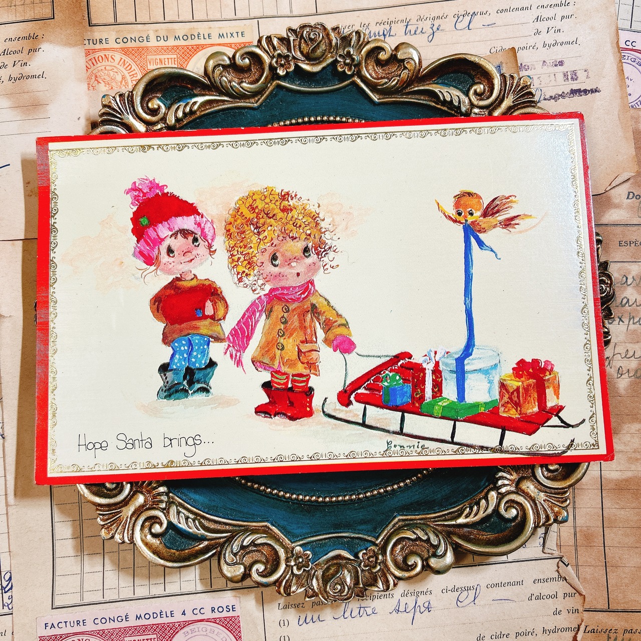 アメリカのブランド「Brooklyn Studios」によるヴィンテージクリスマスカードです。表紙には、冬の装いをした子どもたちがそりを引く可愛らしいイラストが描かれています。そりの上にはカラフルなプレゼントや青いリボンを結ばれた鳥が乗っており、柔らかなタッチと豊かな色彩で温かみのある冬の情景が表現されています。赤い縁取りと金の装飾がクラシックな雰囲気を添え、ノスタルジックな魅力を放つ一枚です。