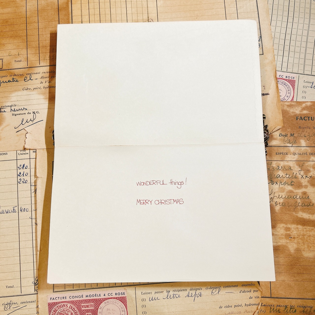 内側には赤い文字で「WONDERFUL things! MERRY CHRISTMAS」と印字されており、余白が広く取られているため、メッセージを添えて贈るのにもぴったり。紙質はやや光沢のある厚手のカードタイプで、経年による変色や汚れがほとんどなく、保存状態も良好です。