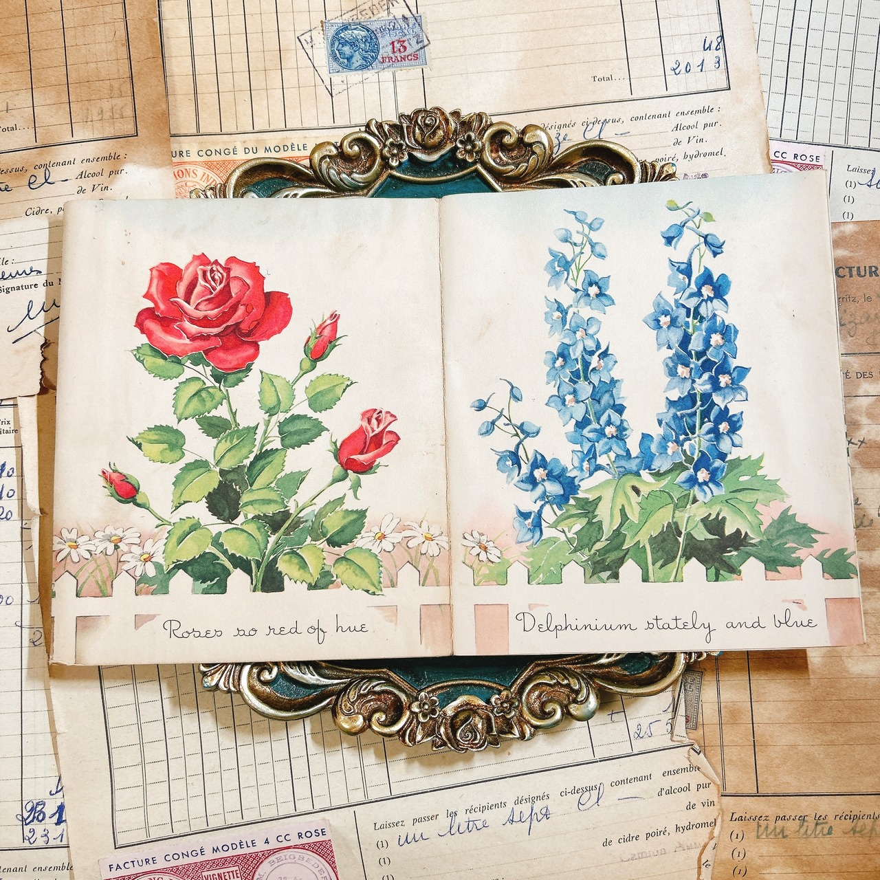 紙質はやや厚みがあり、経年による軽い変色は見られますが、印刷の発色は非常に良好。押し花やボタニカルアートがお好きな方、ヴィンテージの児童書や花の図版コレクターにもおすすめの一品です。