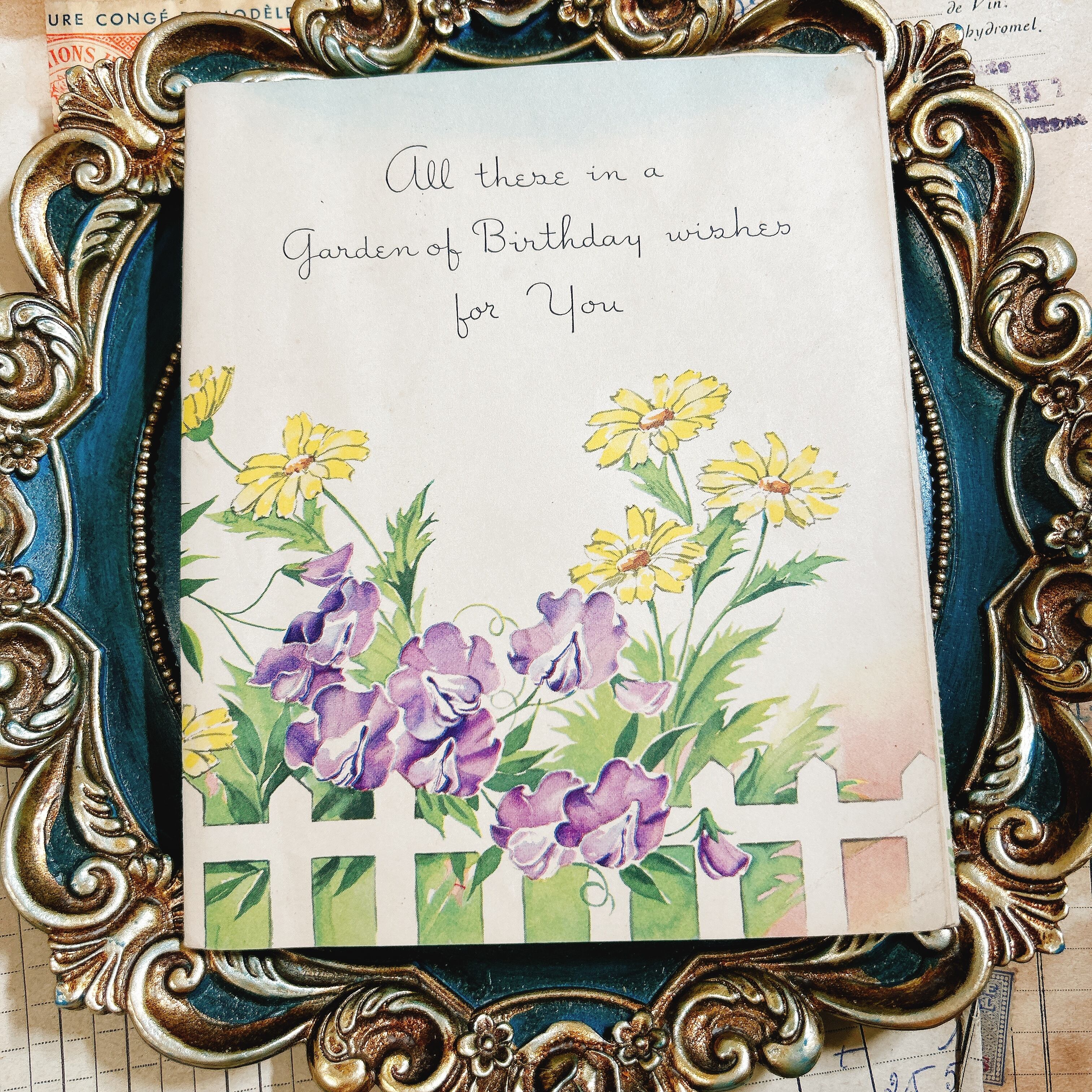 アメリカ・1930年代頃のバースデーカード「Hollyhocks so tall and bright」。庭先の白いフェンス越しに、ホリホック(立葵)やバラ、デルフィニウム、アサガオ、スイートピーなど、色とりどりの花々が描かれた一冊仕立ての美しいカードです。表紙にはピンクと黄色のホリホックが整然と咲き誇り、ページを開くと英詩とともに異なる花々が順に登場します。どの花も淡い水彩調で描かれ、柔らかいグラデーションと瑞々しい色彩が魅力的です。