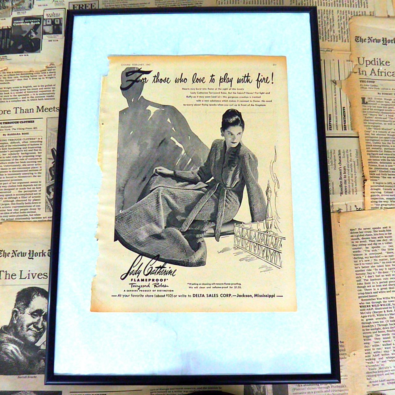 Lady Catherineは、1940年代から1950年代にかけてアメリカで展開されていたファッションブランドで、特に家庭向けのローブやナイトウェアなど、女性のための高品質な家庭着を提供していました。独自の「FLAMEPROOF(防炎)」技術を採用し、家庭内での安全性を重視した素材を用いた商品展開が特徴です。当時のアメリカ家庭では、暖炉やガスストーブなど火を使う機会が多かったため、火に強い衣服は非常に実用性が高く、人気を博しました。Lady Catherineは、洗練されたデザインと安心感を両立させるブランドとして、多くの家庭で愛用されていました。