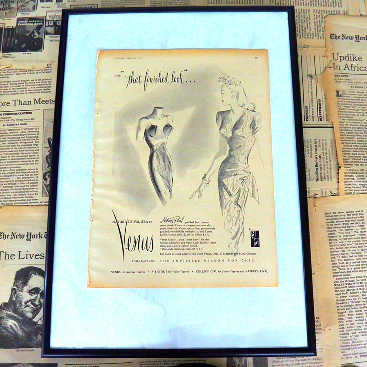 Venusは、主に女性用インナーウェア、とりわけ補正下着やブラジャーの分野で知られるブランドです。1940年代から1950年代にかけてアメリカを中心に展開され、スタイリッシュで洗練されたデザインと、女性のボディラインを美しく見せる機能性が高く評価されていました。当時のVenusは、「自然な魅力を引き出す補正下着」をコンセプトに掲げており、日常使いからフォーマルシーンまで幅広いニーズに応える商品展開を行っていました。その広告やカタログは、エレガントなイラストや洗練されたキャッチコピーで、時代を象徴する女性像を描き出し、ファッションに敏感な女性たちの憧れの的となっていました。