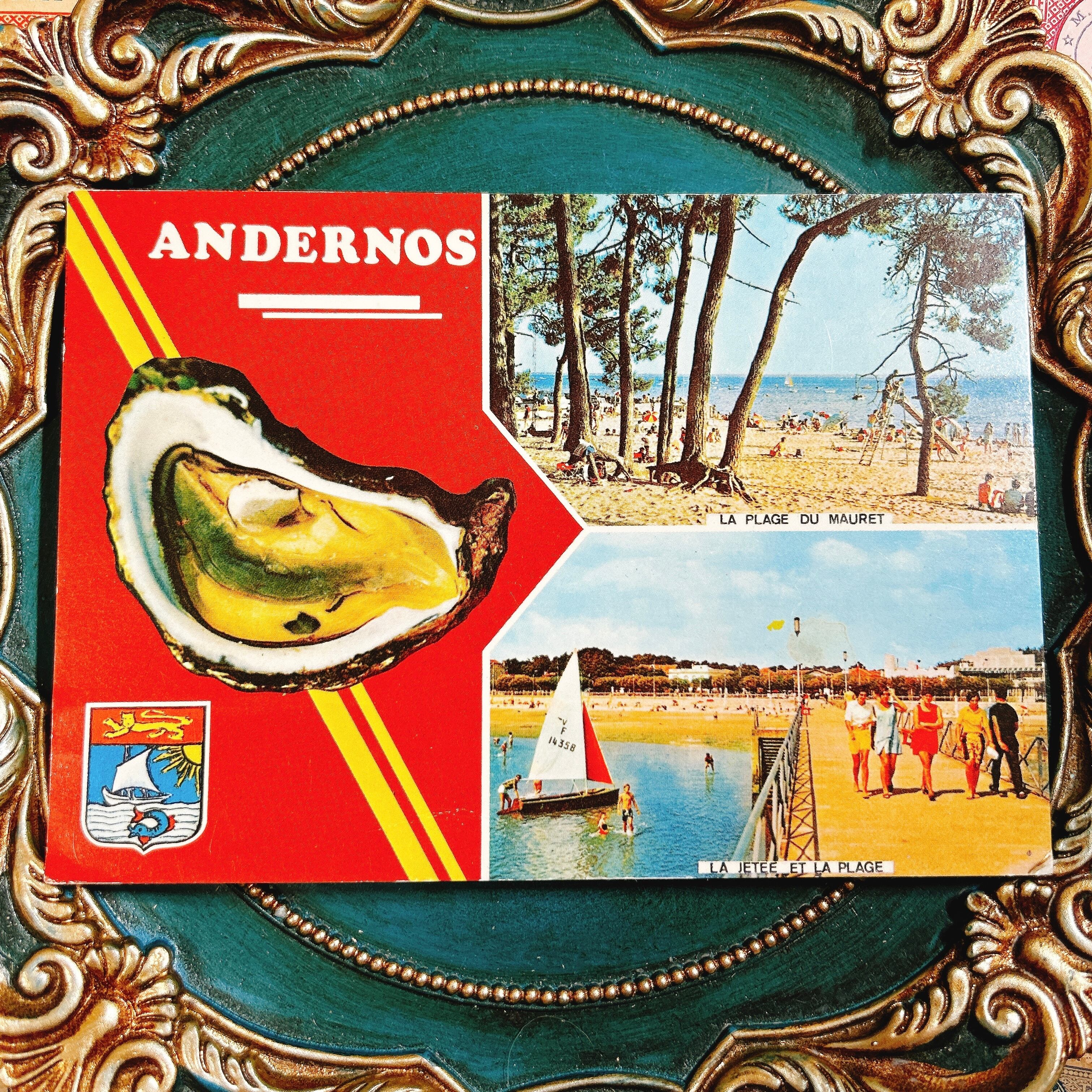 鮮やかな赤を基調に、大きな牡蠣の写真が印象的なフランス・アンダルノス=レ=バン(Andernos-les-Bains)のヴィンテージ絵葉書です。左側には市の紋章と共に、地元名産である牡蠣が大胆に配置され、右側には海辺の風景写真が2枚レイアウトされています。上段には松林の間から見えるマウレ海岸(La Plage du Mauret)、下段には桟橋とヨットが行き交う活気ある浜辺(La Jetée et la Plage)が広がり、南仏特有の明るい空気と夏の歓声がそのまま封じ込められた一枚です。
