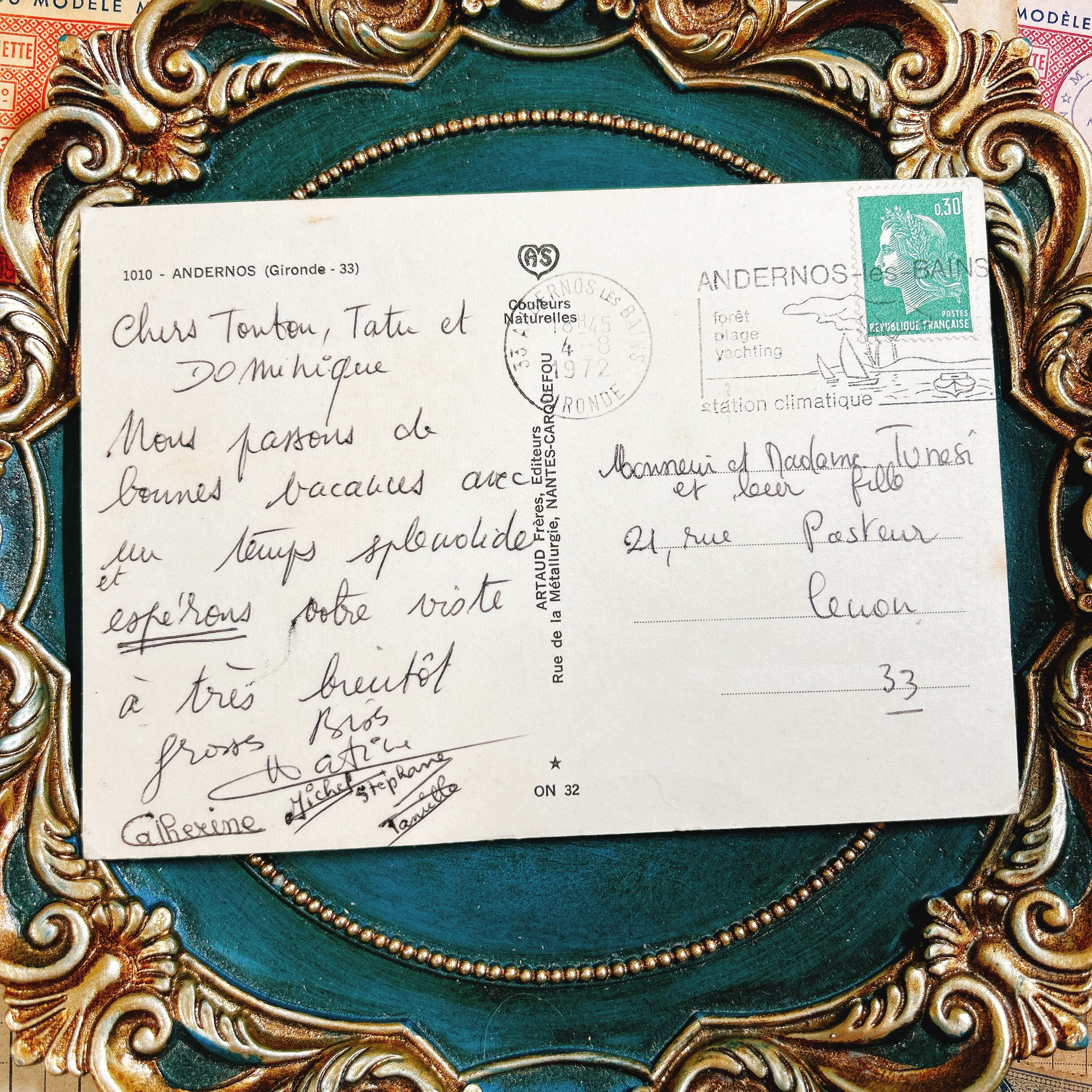 裏面には1974年8月15日の消印が押されており、フランス製の切手が貼付。筆記はインクの風合いもそのままに残され、当時の旅行者が親族に宛てて「素晴らしい天気の中、楽しい休暇を過ごしています」と綴っています。その筆跡や宛名書きには、手書きの温かみと時代の空気が感じられます。
