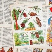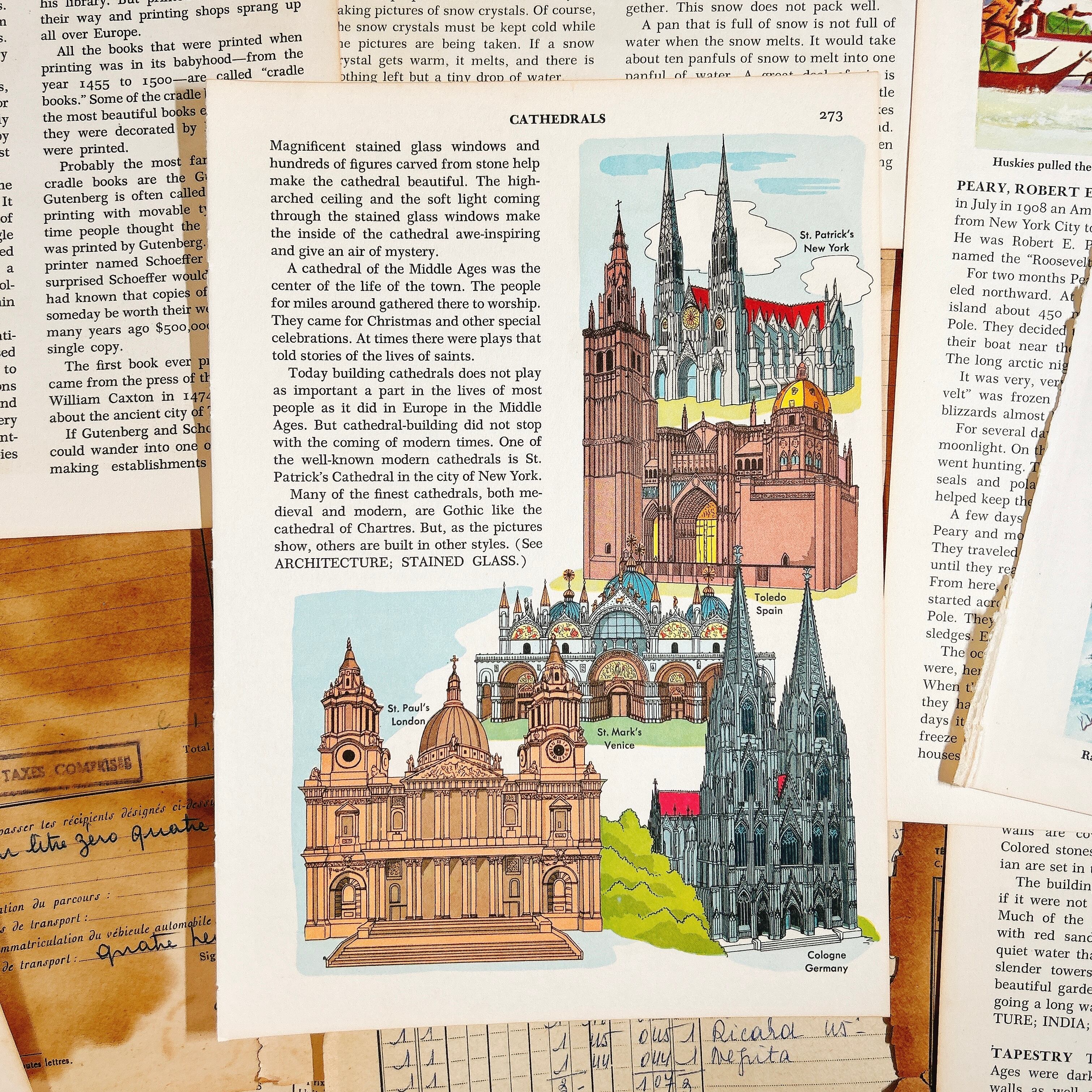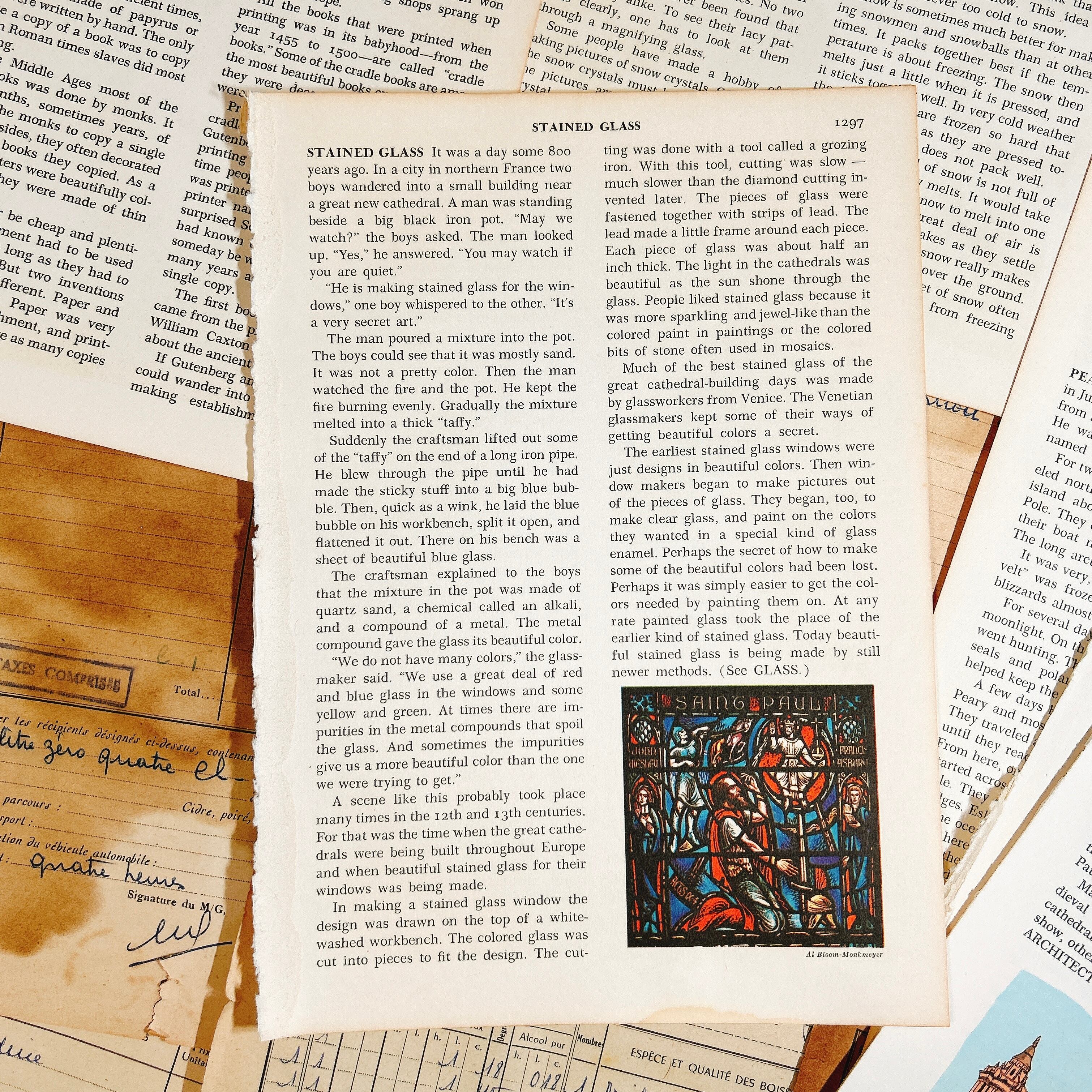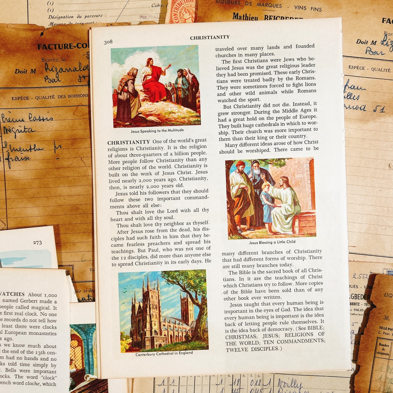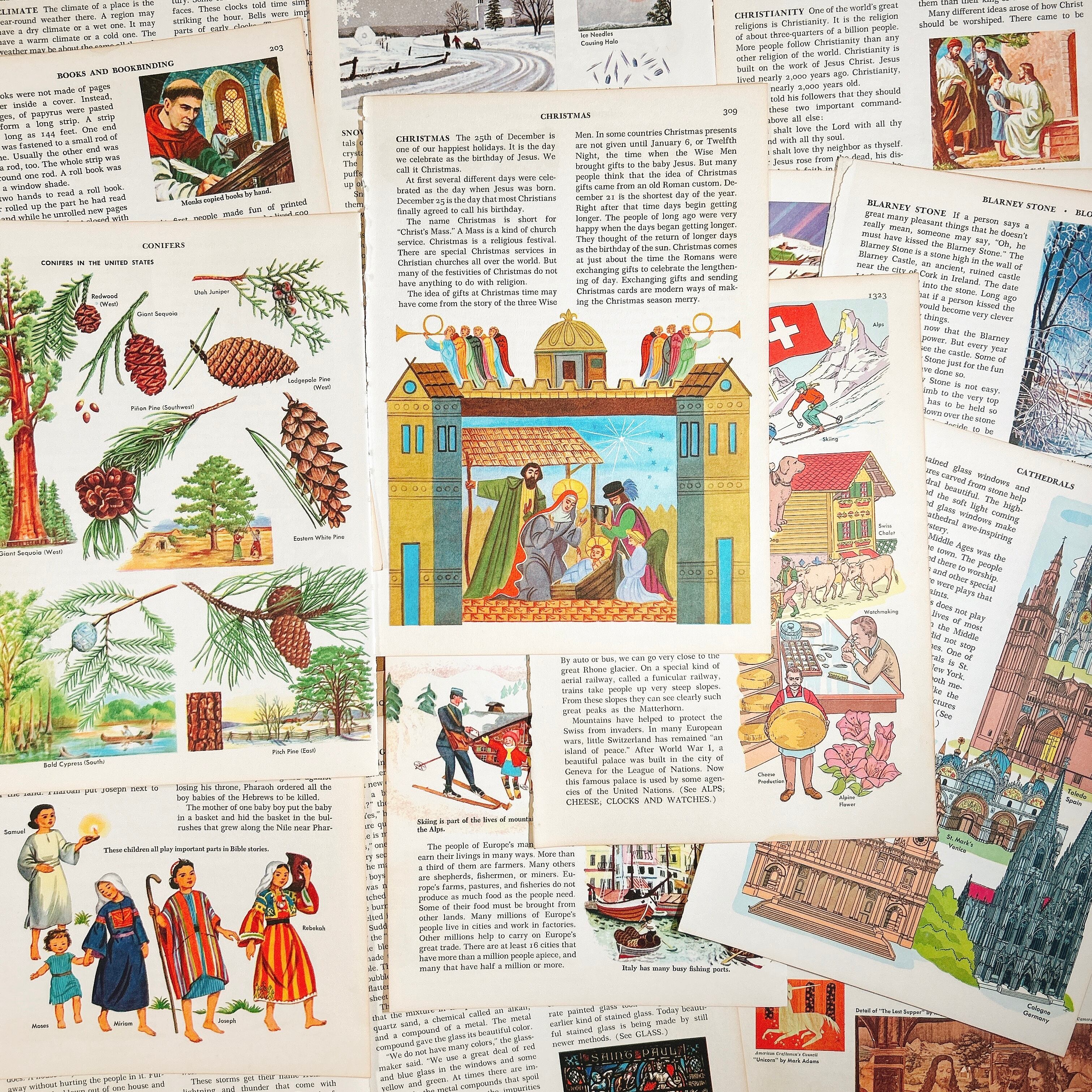 1950〜60年代頃の児童百科事典から切り離した洋書ページ10枚セットです。テーマは「クリスマスと冬」。イエスの誕生を描いた宗教画風の挿絵、雪景色やスキーを楽しむ人々、針葉樹やヨーロッパの地図、ステンドグラスや大聖堂など、冬の季節と文化を感じさせるページを厳選しました。温かみのある色合いとレトロな印刷の風合いが魅力で、1枚1枚がまるで絵画のようです。