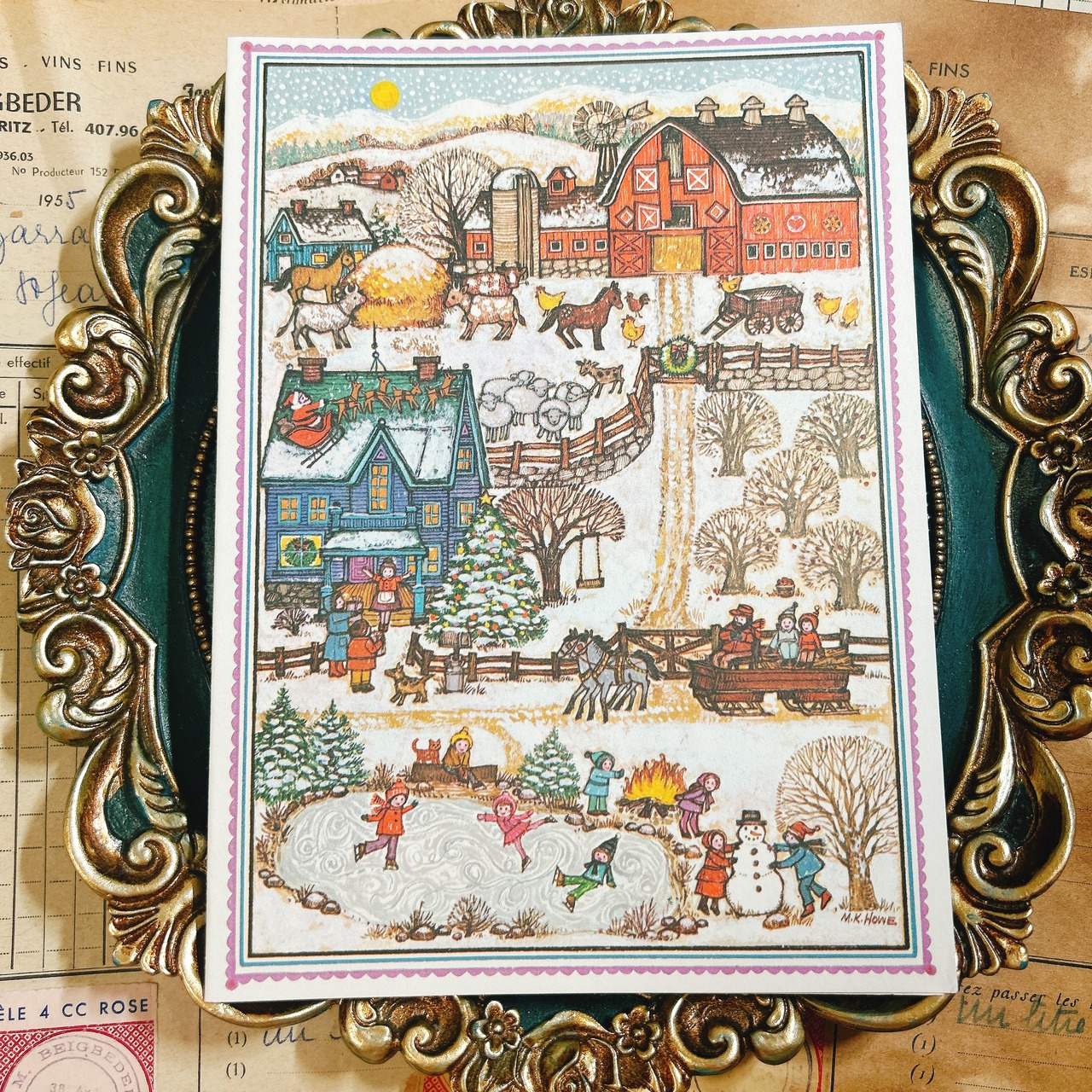 こちらは、アメリカ・コロラド州の文具ブランド「Current, Inc.」が手がけたヴィンテージのクリスマスカードです。雪に包まれた田舎町の風景が、まるで絵本の1ページのように丁寧に描かれています。赤い納屋、青い家、馬車やスケートを楽しむ子どもたちなど、1950〜60年代のアメリカンカントリーの温かみを感じさせる一枚です。