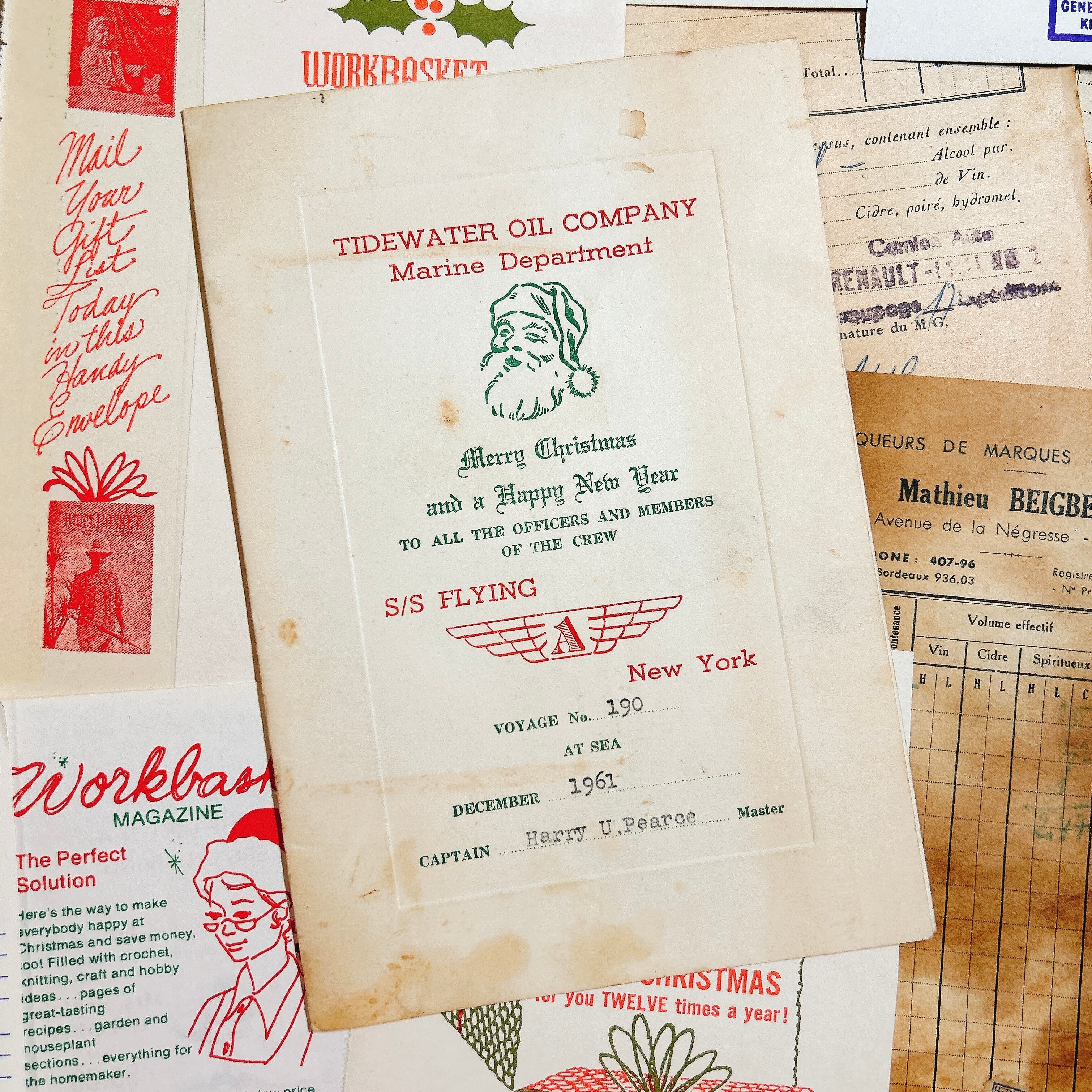 1950〜60年代のアメリカから届いた、クリスマスをテーマにしたヴィンテージ紙もの10枚セットです。最も印象的なのは、1961年「TIDEWATER OIL COMPANY」の豪華客船で配られたクリスマスディナーメニュー。表紙には航海名や船長名が印字され、開くと七面鳥やハム、パンプキンパイなど、当時の洋上ディナーの献立が英文で並びます。軽いシミや焼けも含め、まるで海を越えて時を経た“本物の記録”のような存在感があります。
