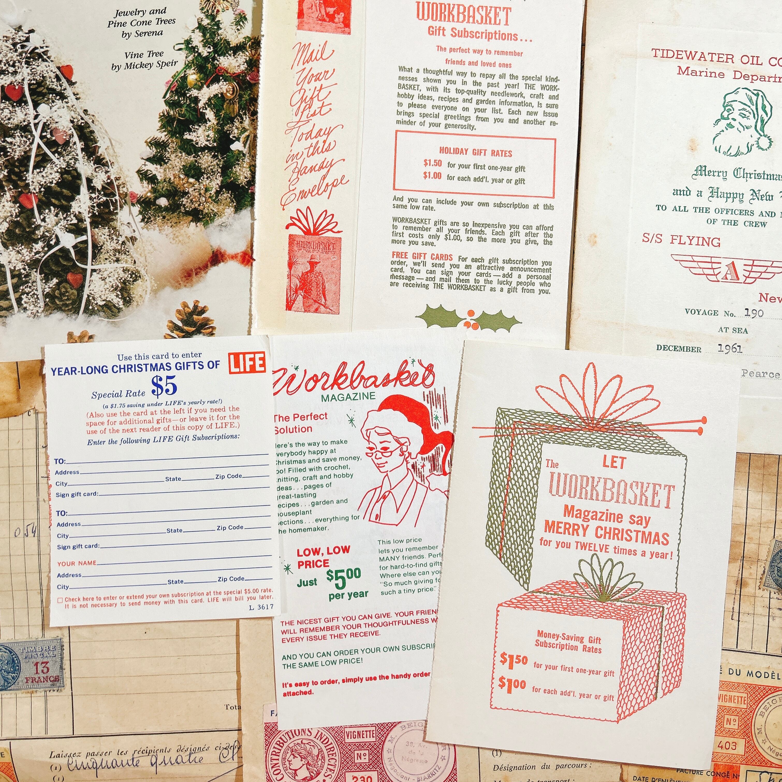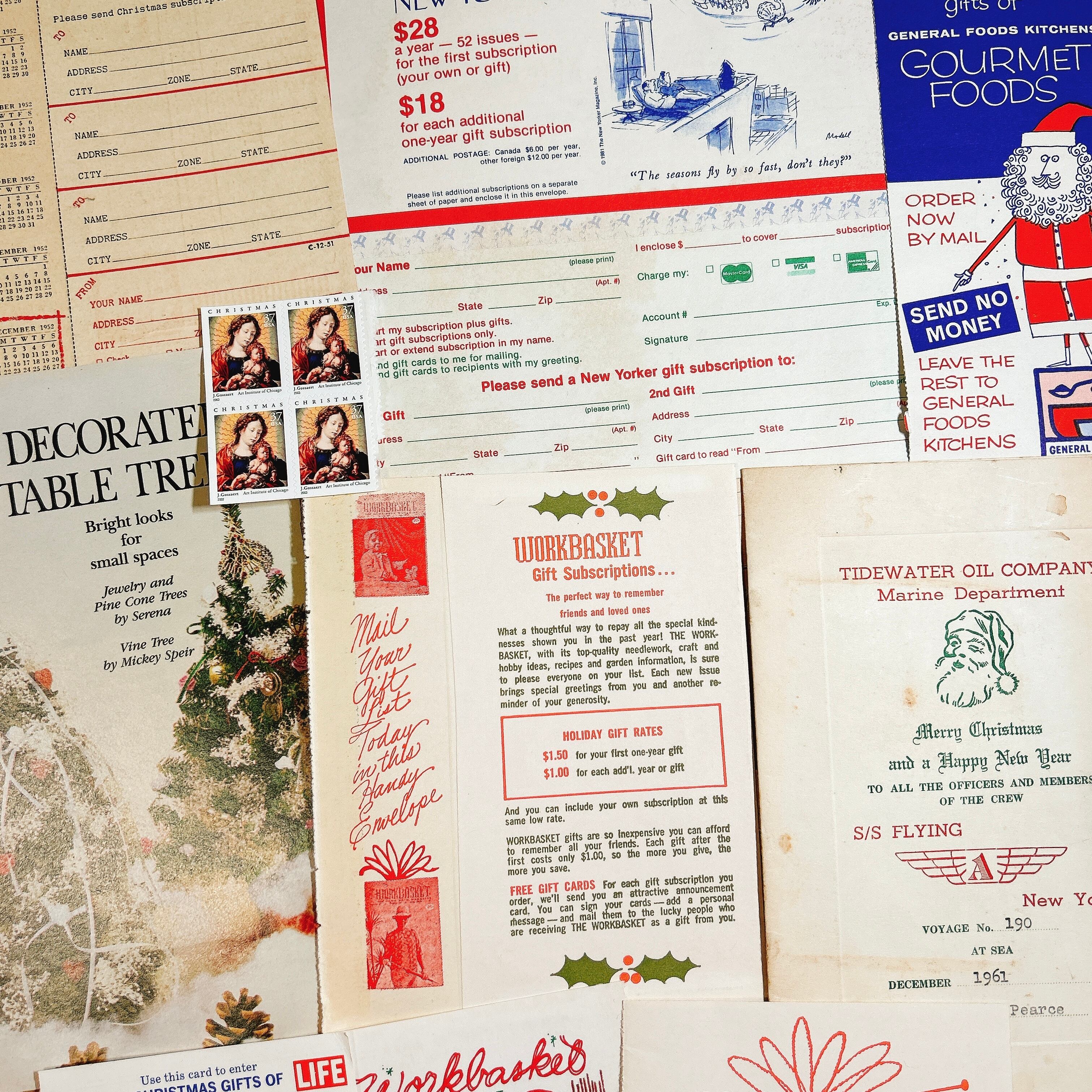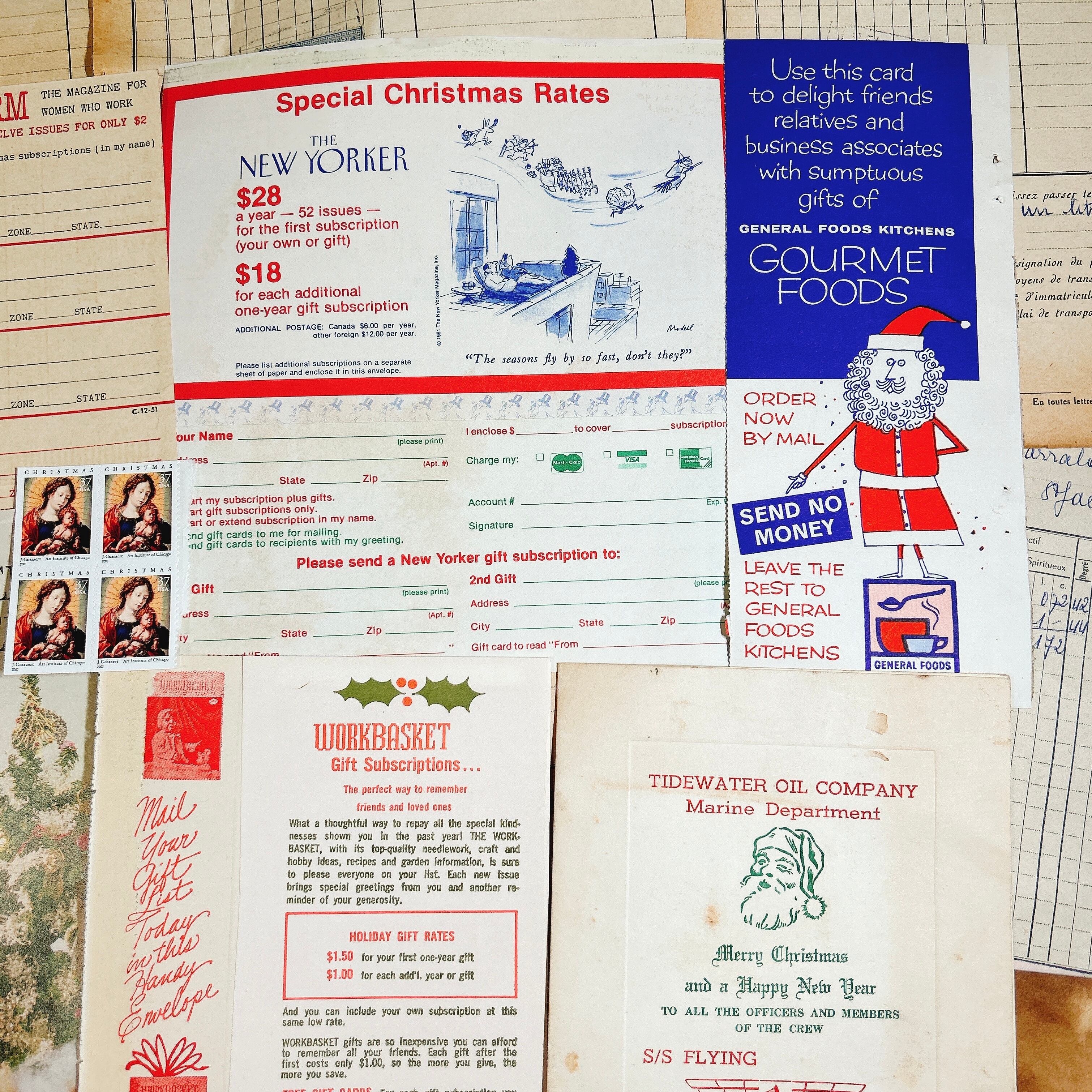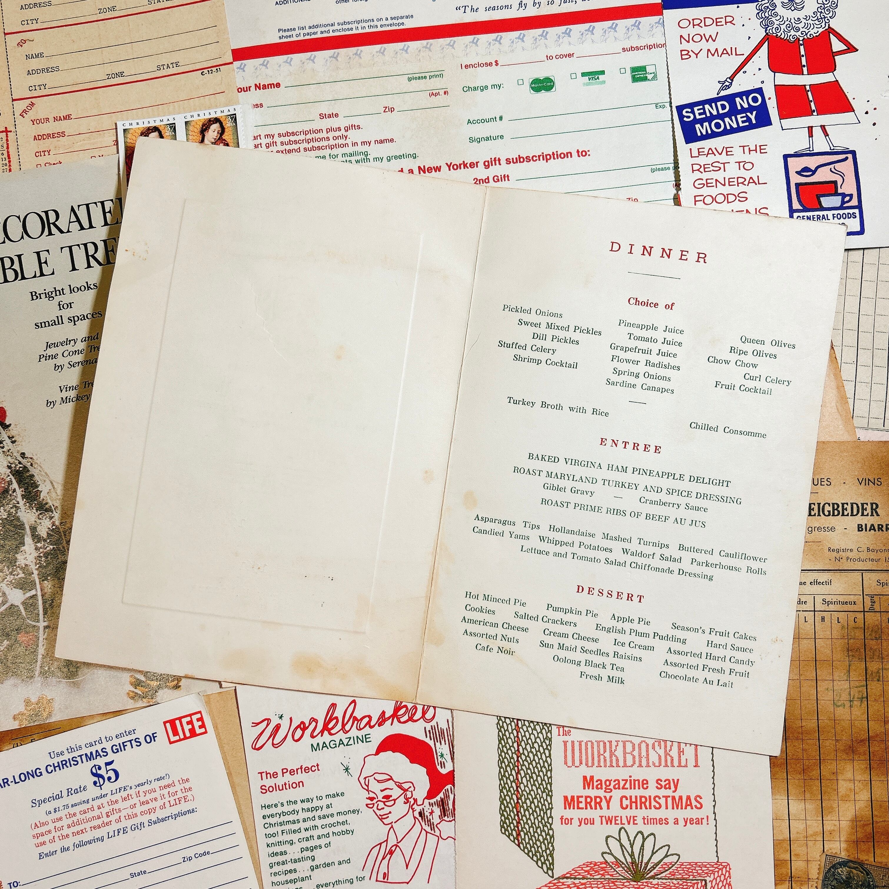 そのほか、「The New Yorker」や「LIFE」などの雑誌のギフト申込用紙、ツリーを飾るためのアイデアが載った「Decorated Table Trees」の切り抜き、ベティ・クロッカーやGeneral Foodsの広告など、どれもアメリカの家庭が楽しみにしていたホリデーシーズンの空気を感じられるデザインばかりです。