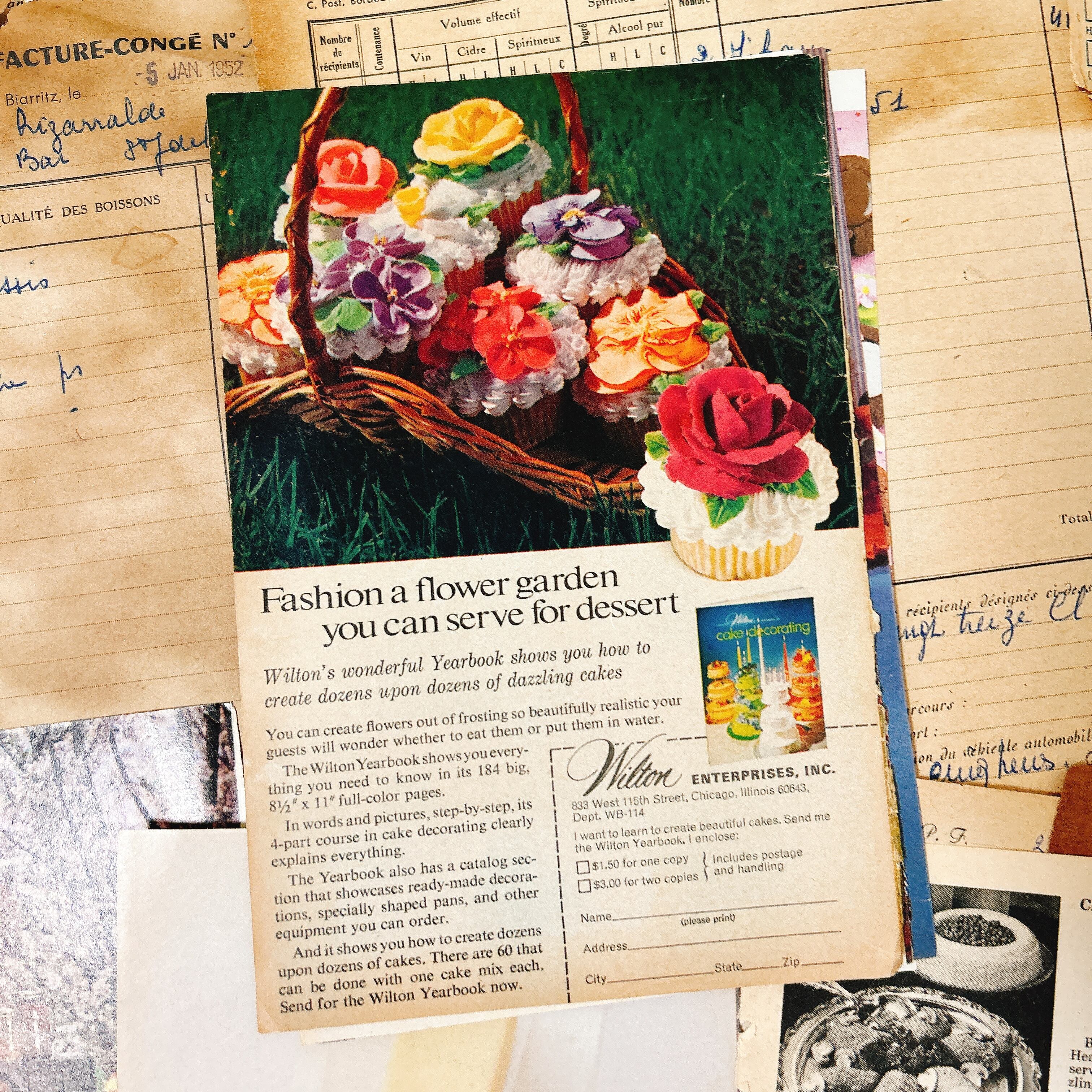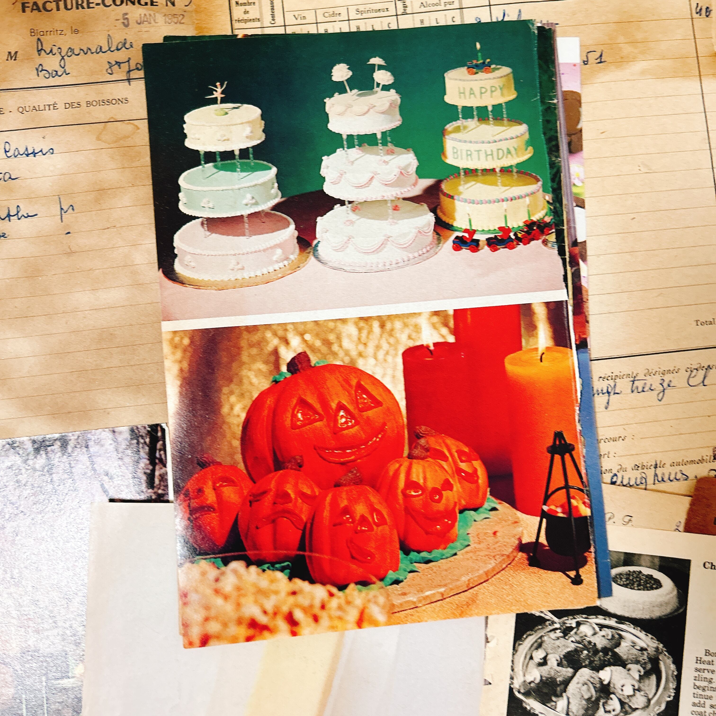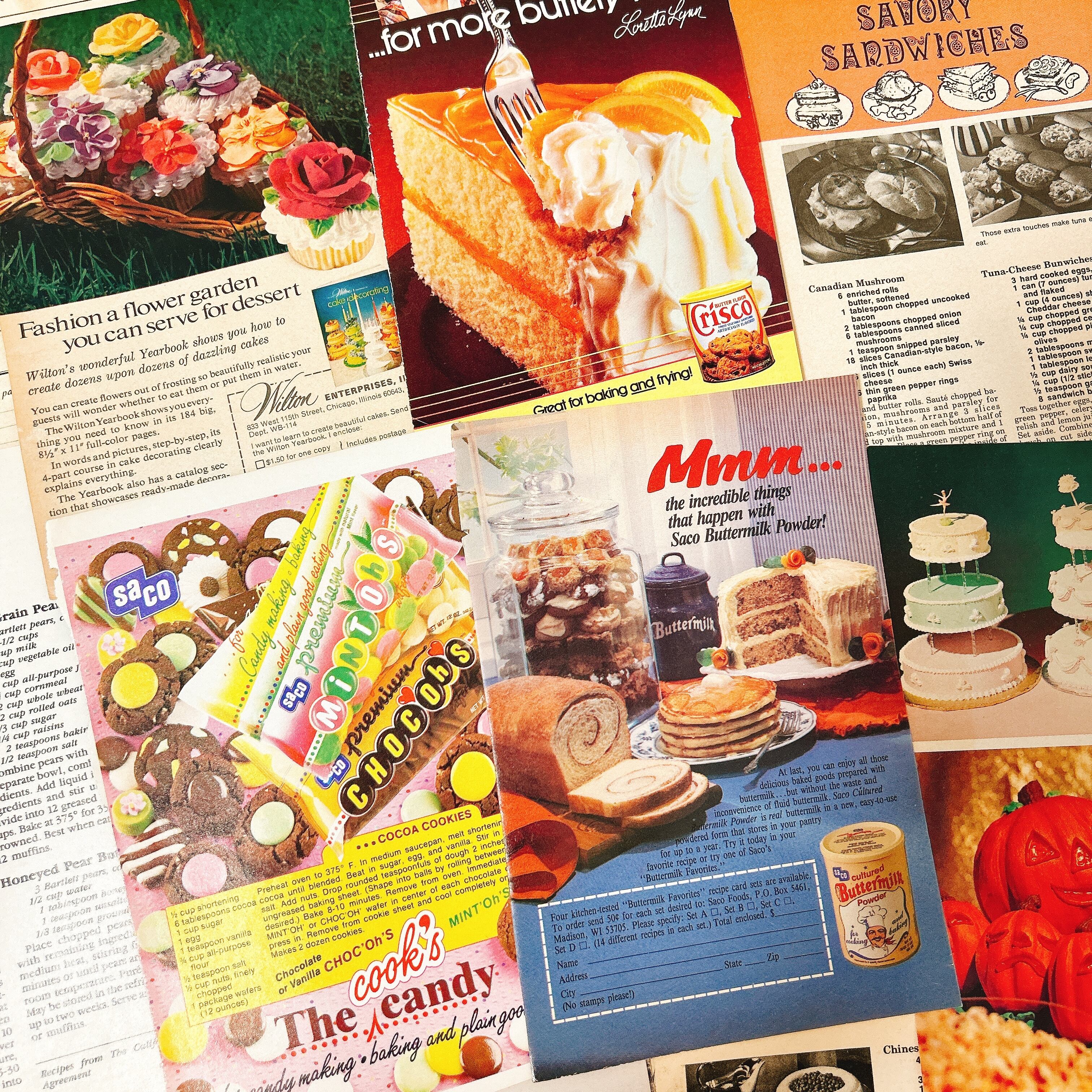 1960〜70年代アメリカの雑誌から切り離された、フード系ヴィンテージペーパー10枚セットです。色鮮やかな印刷で、バターミルクパウダーやCrisco、キャンディー広告、ケーキやサンドイッチのレシピページなど、当時の食卓を彩ったレトロなデザインが揃います。花のようなカップケーキやハロウィンのパンプキンケーキなど、見ているだけで楽しいモチーフばかりです。紙質は軽く、経年による焼けやインクのにじみも味わいとして残っています。チョキチョキ切ってコラージュ素材としても、額装して飾っても素敵です。サイズは20.2×13.5cm。どのページにも50年代〜70年代のアメリカらしい陽気な色使いと、当時の暮らしの温もりが感じられる一品です。