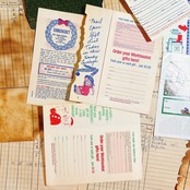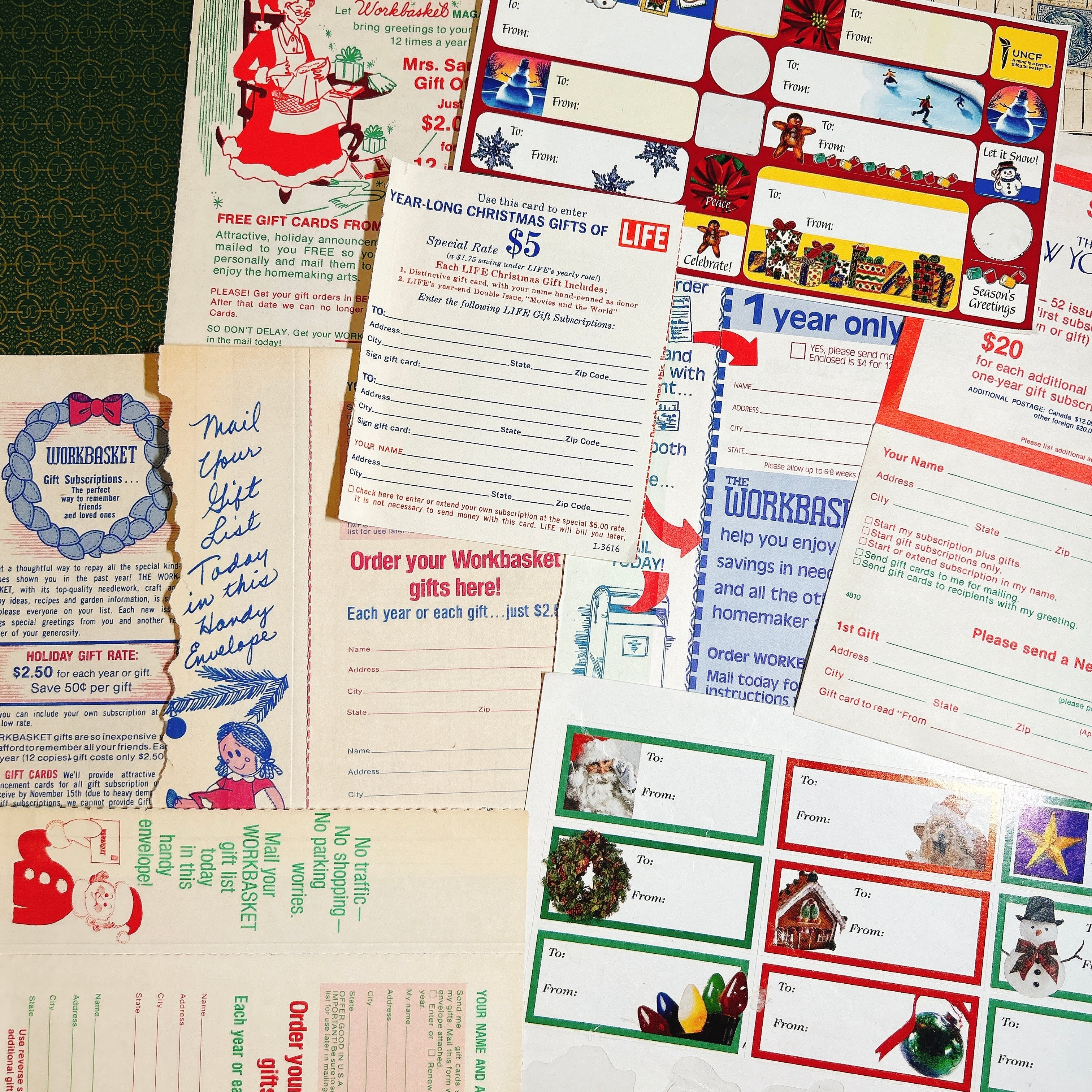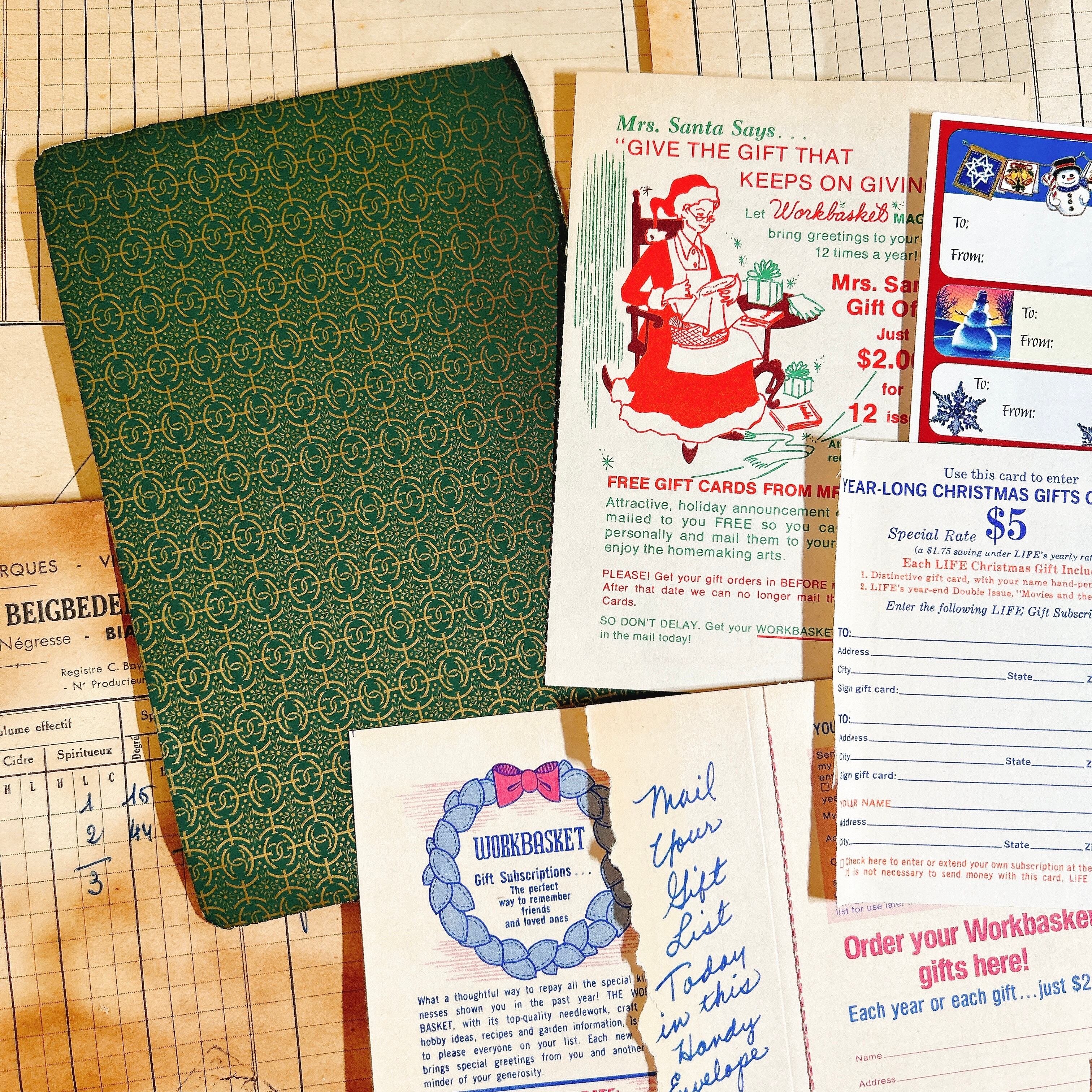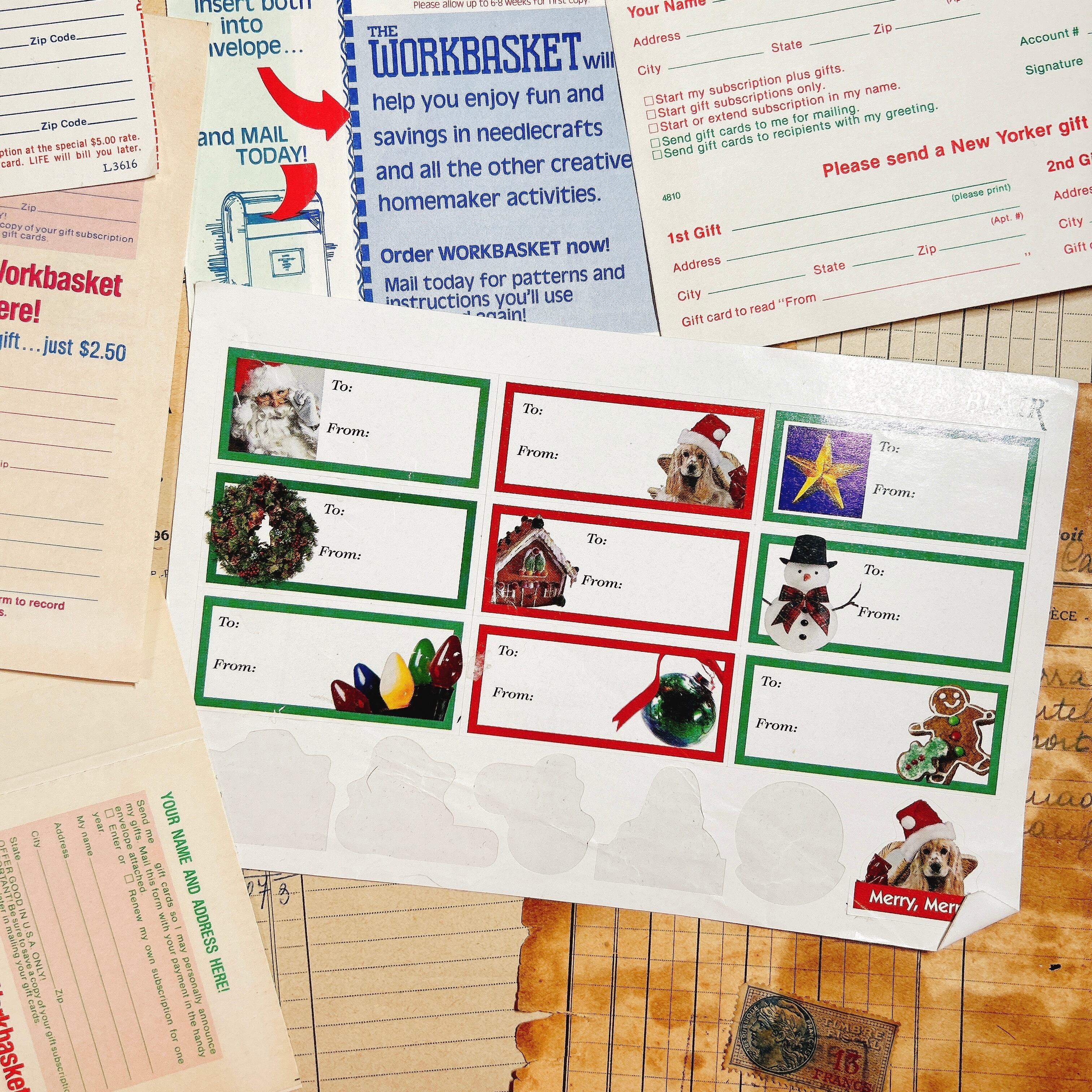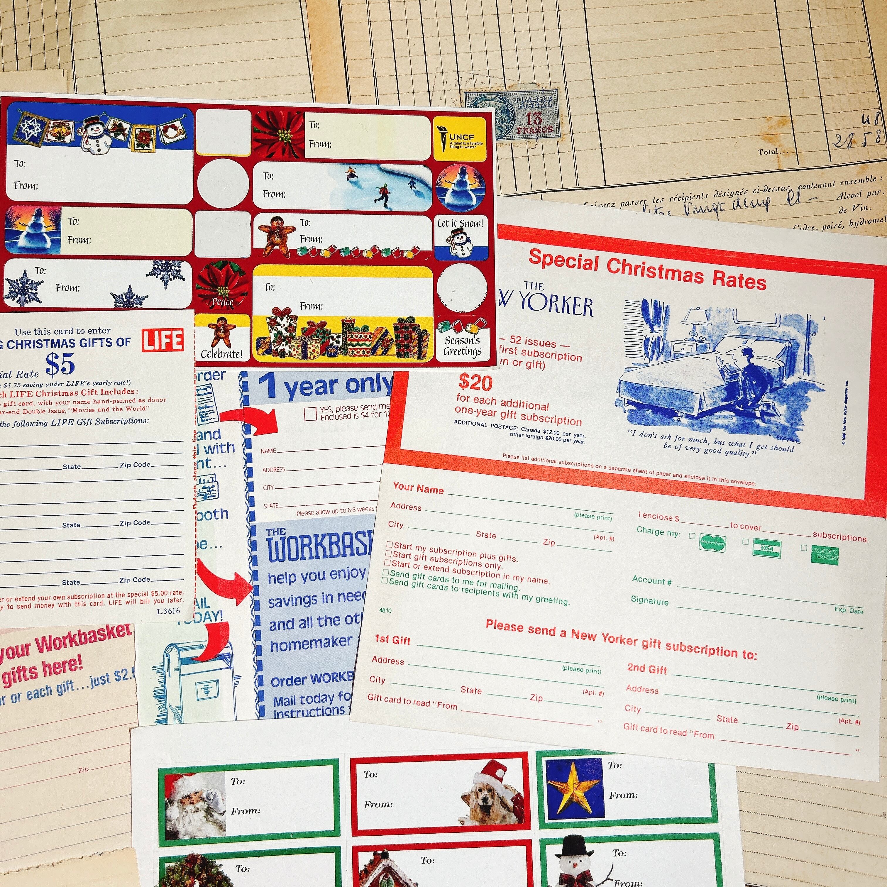 1950〜70年代アメリカの雑誌から切り離された、クリスマス関連の小さなヴィンテージ紙もの10枚セットです。サンタクロースやリース、雪だるま、犬が描かれたギフトステッカーや、The New YorkerやLIFE誌などのホリデーギフト申込書など、当時のグラフィックデザインが詰まったセットになっています。