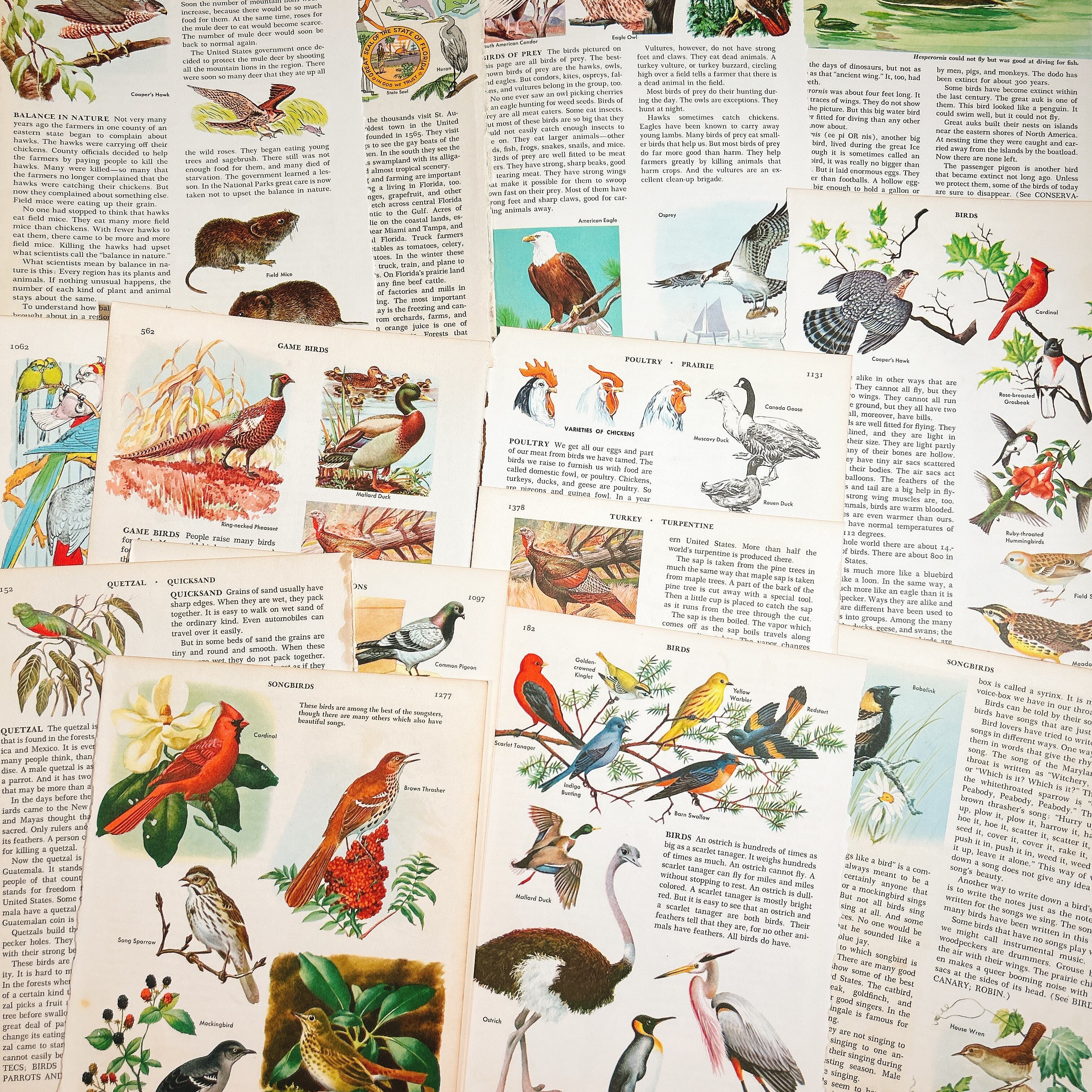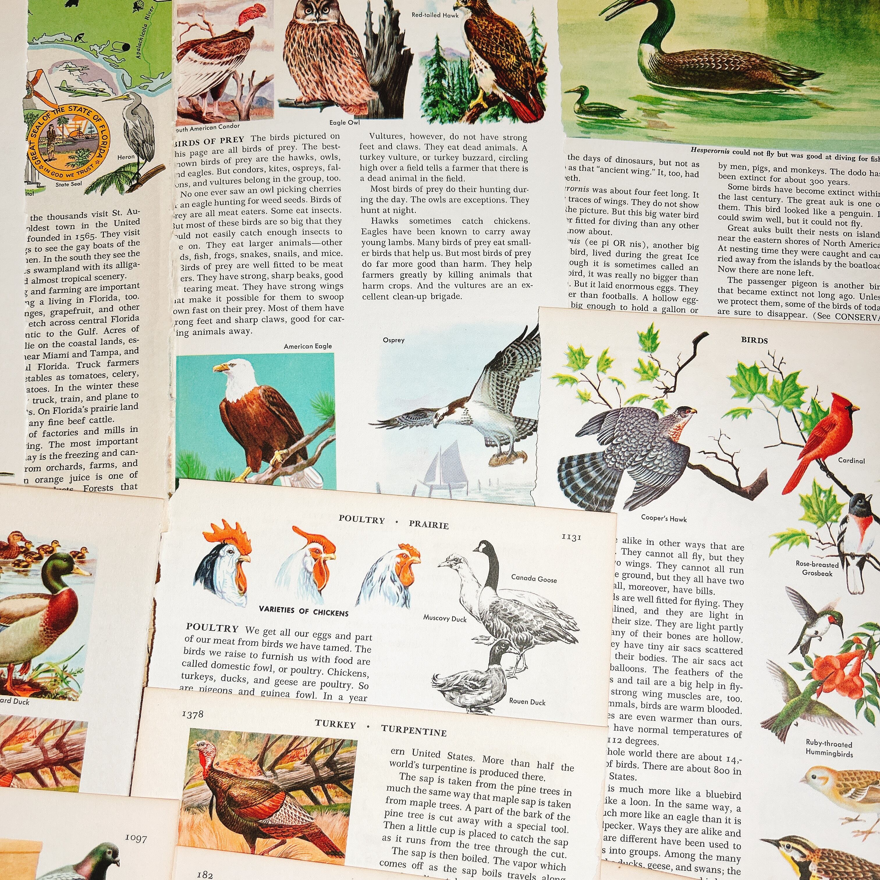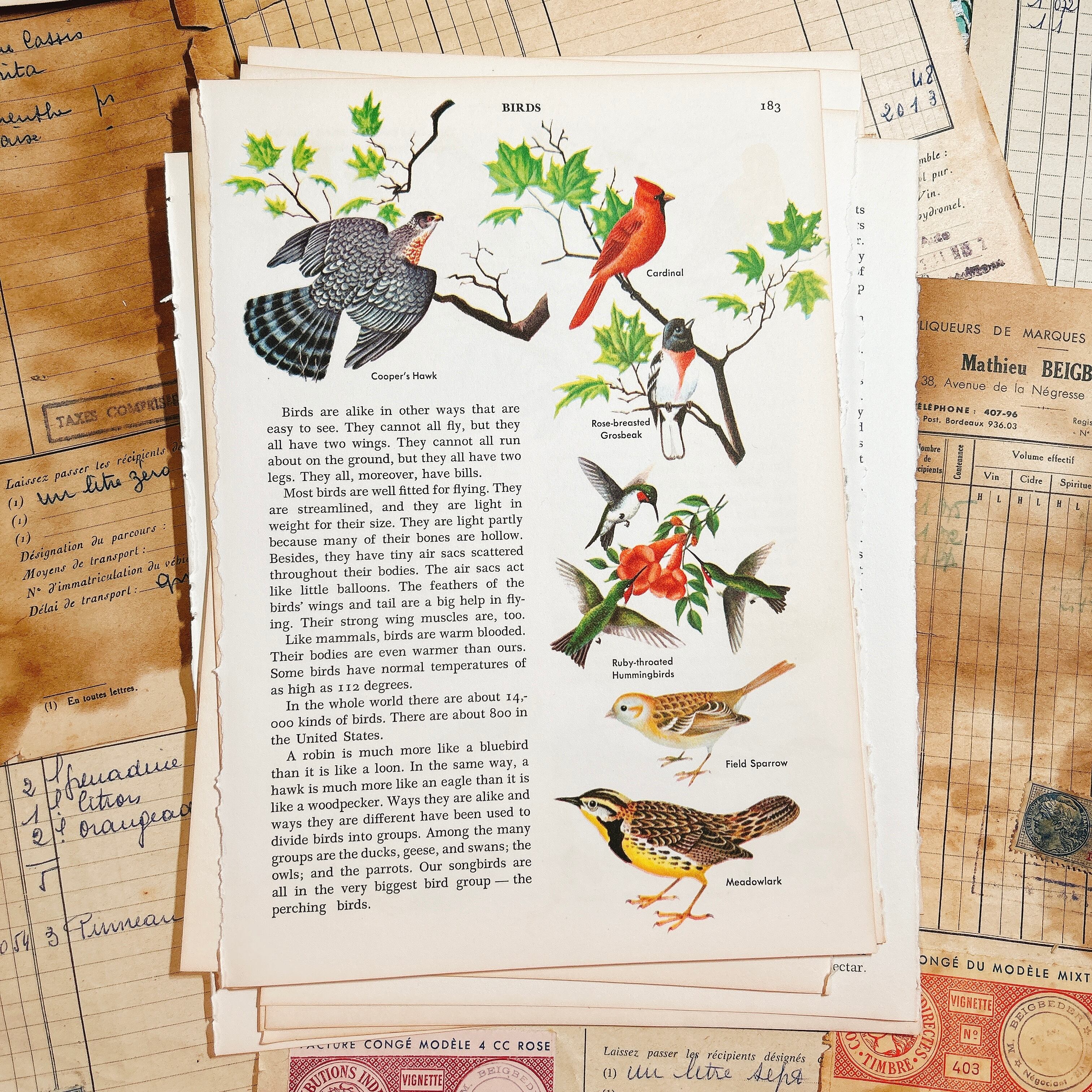 1950〜70年代頃のアメリカ洋書から切り離された、鳥類をテーマにしたヴィンテージページ14枚セットです。挿絵はすべて当時の印刷によるもので、カーディナルやツバメ、オウム、ダチョウ、白鳥など、多彩な鳥たちが色鮮やかに描かれています。印刷インク特有の深みある発色や、経年により少し焼けた紙の風合いが相まって、温かみのある雰囲気を漂わせています。