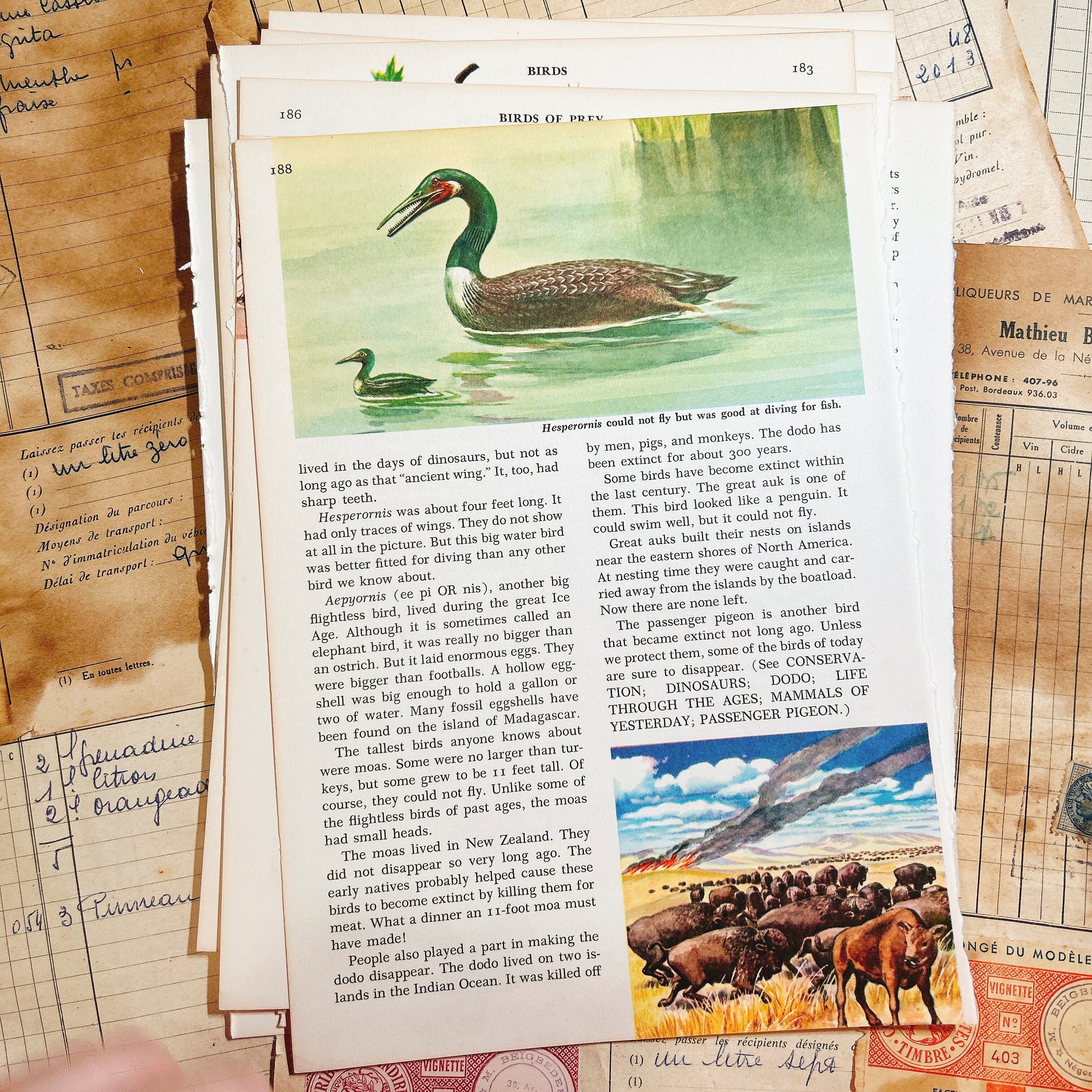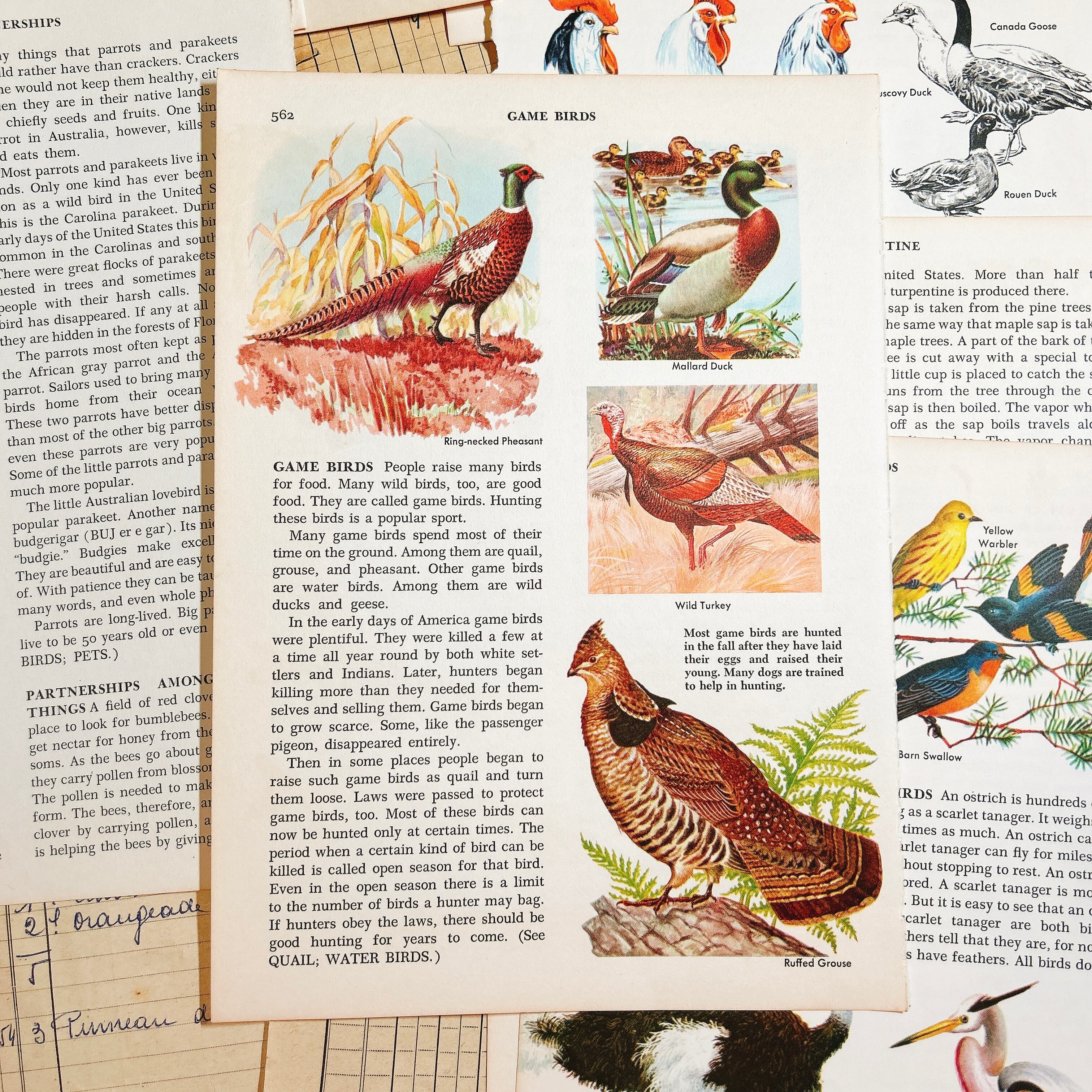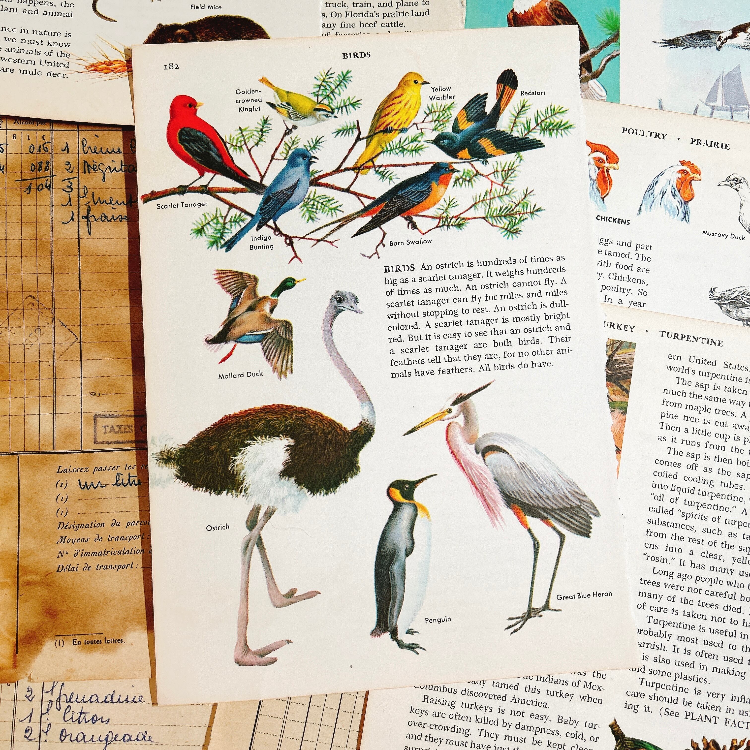 1950〜70年代頃のアメリカ洋書から切り離された、鳥類をテーマにしたヴィンテージページ14枚セットです。挿絵はすべて当時の印刷によるもので、カーディナルやツバメ、オウム、ダチョウ、白鳥など、多彩な鳥たちが色鮮やかに描かれています。印刷インク特有の深みある発色や、経年により少し焼けた紙の風合いが相まって、温かみのある雰囲気を漂わせています。