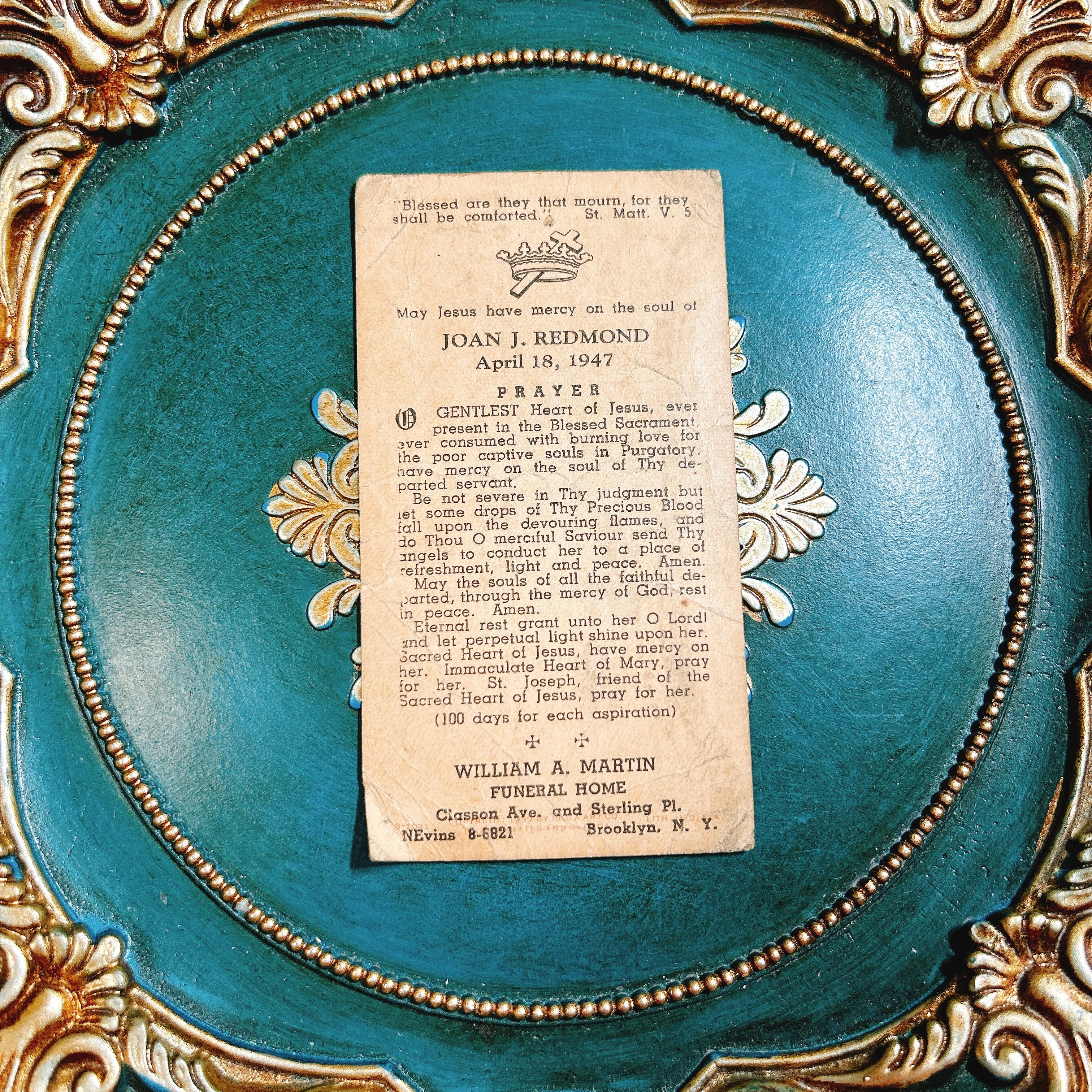 裏面には、亡き人の魂の安らぎを祈るための祈祷文が印刷されています。冒頭には聖書の一節「Blessed are they that mourn, for they shall be comforted(悲しむ者は幸いなり、その人たちは慰められるであろう)」が引用され、続く祈りの文では「May Jesus have mercy on the soul of Joan J. Redmond」と、故人ジョアン・J・レッドモンドの名が記されています。