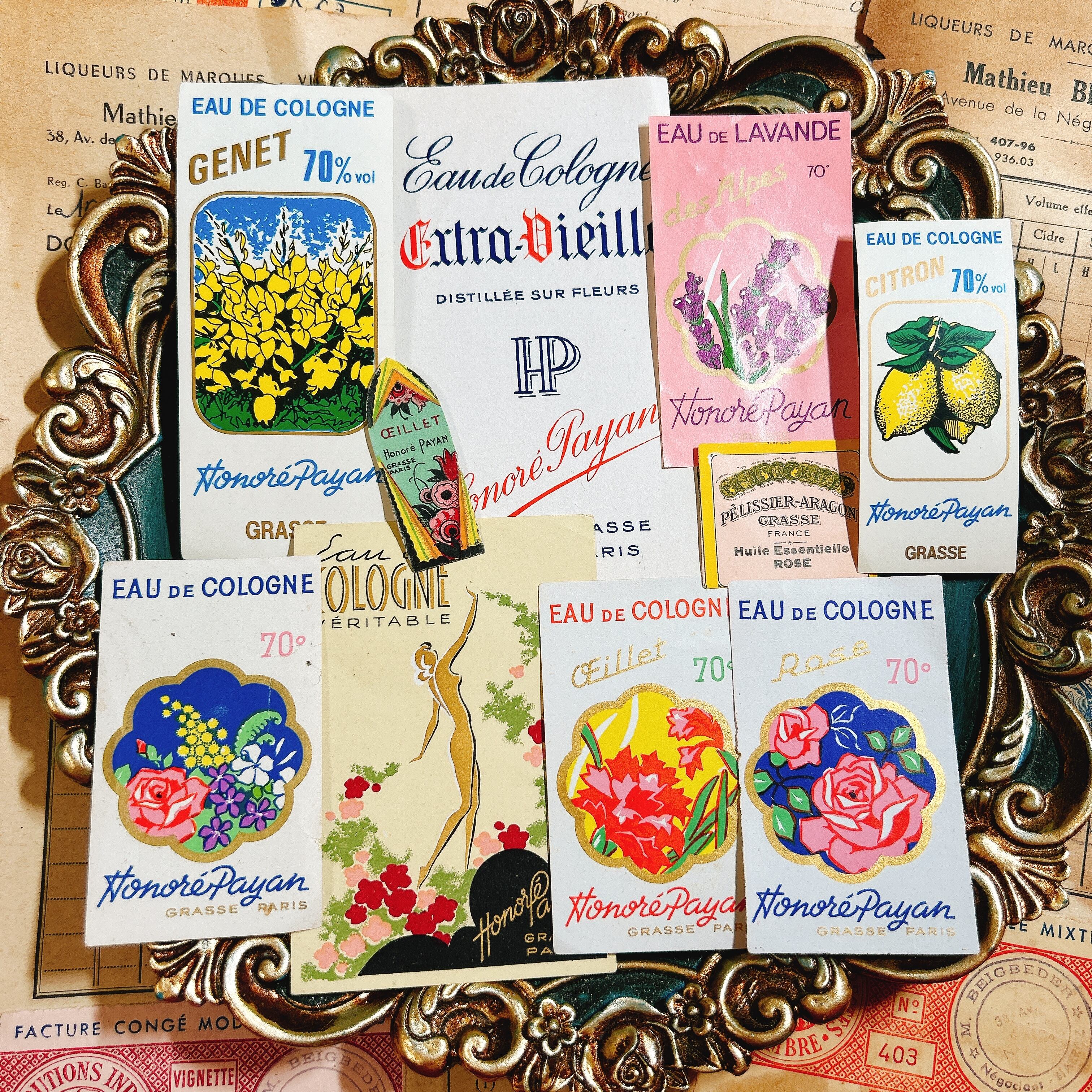 フランス・グラースの老舗香水ブランド、Honoré Payanをはじめとするヴィンテージパフュームラベル10枚セットです。色鮮やかな花々や女性のシルエット、繊細な金文字が美しく、20世紀中期の香り文化とアールデコのエスプリを感じさせます。紙質は当時ならではの軽やかで上品な風合い。印刷のかすれや経年の色味が、コレクションとしての魅力をさらに深めています。