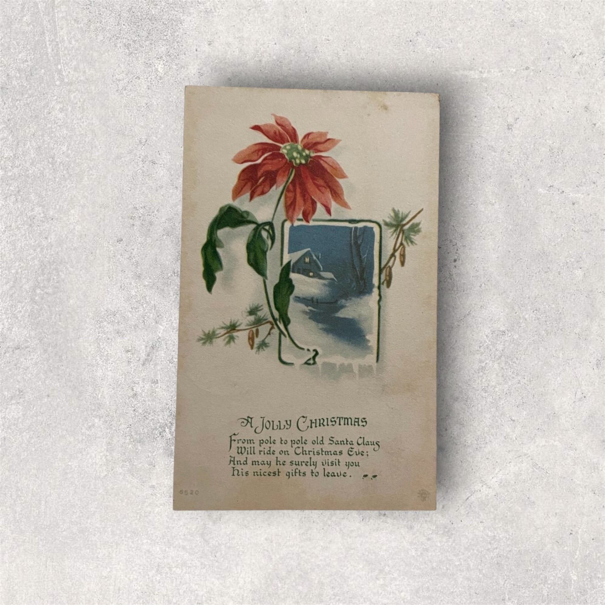 1918年、アメリカ・オハイオ州スワントンから投函された、アンティークのクリスマスポストカードです。深紅のポインセチアが描かれたクラシカルなデザインで、背景には雪に包まれた家と冬の夜空が淡く描かれています。優しいタッチのリトグラフ印刷が施され、100年以上前の季節の温もりを今に伝えています。