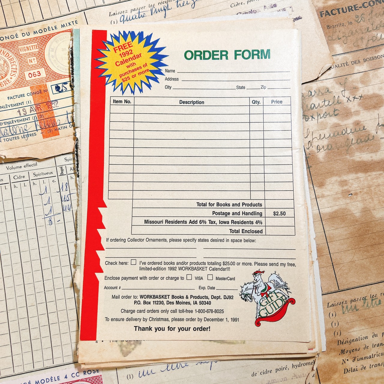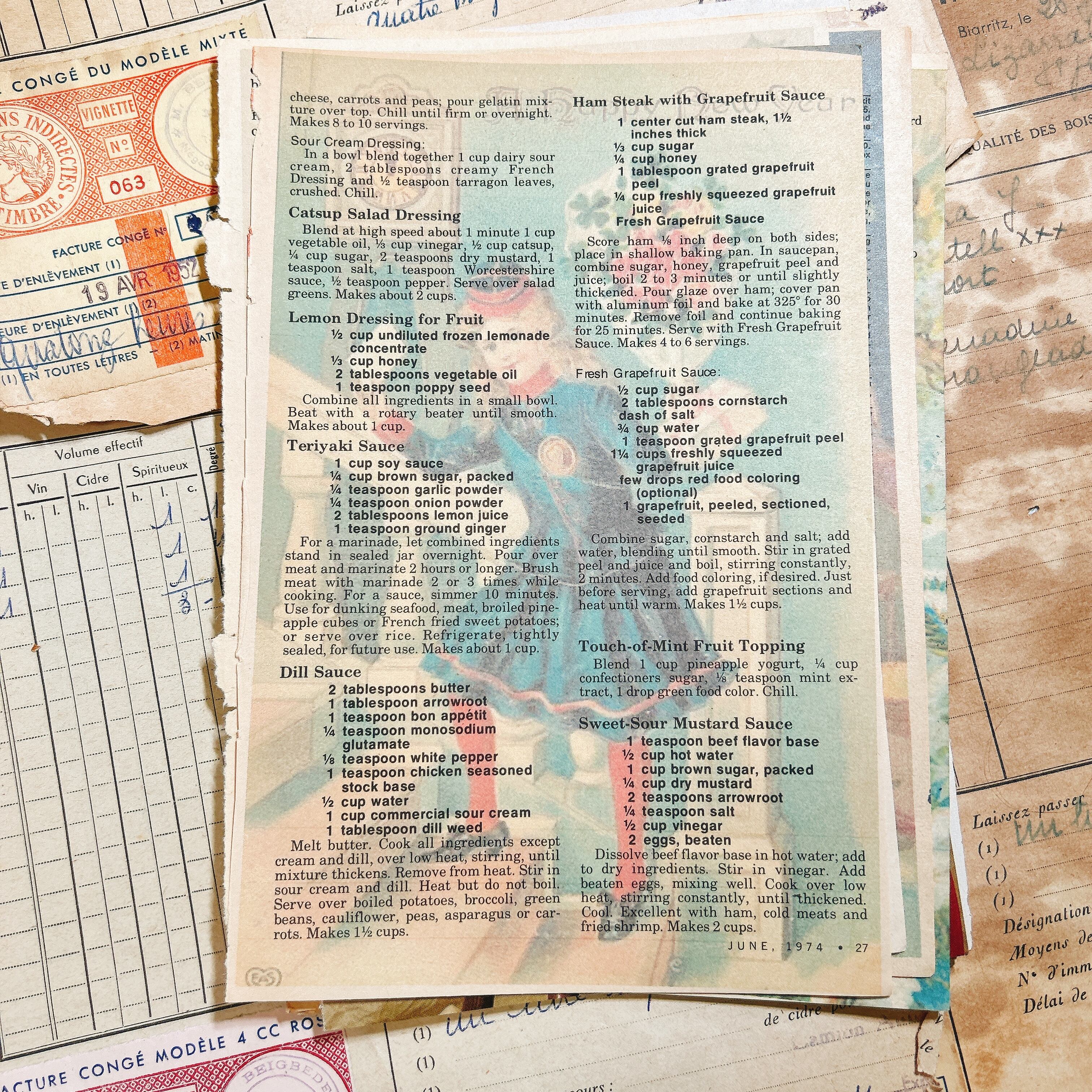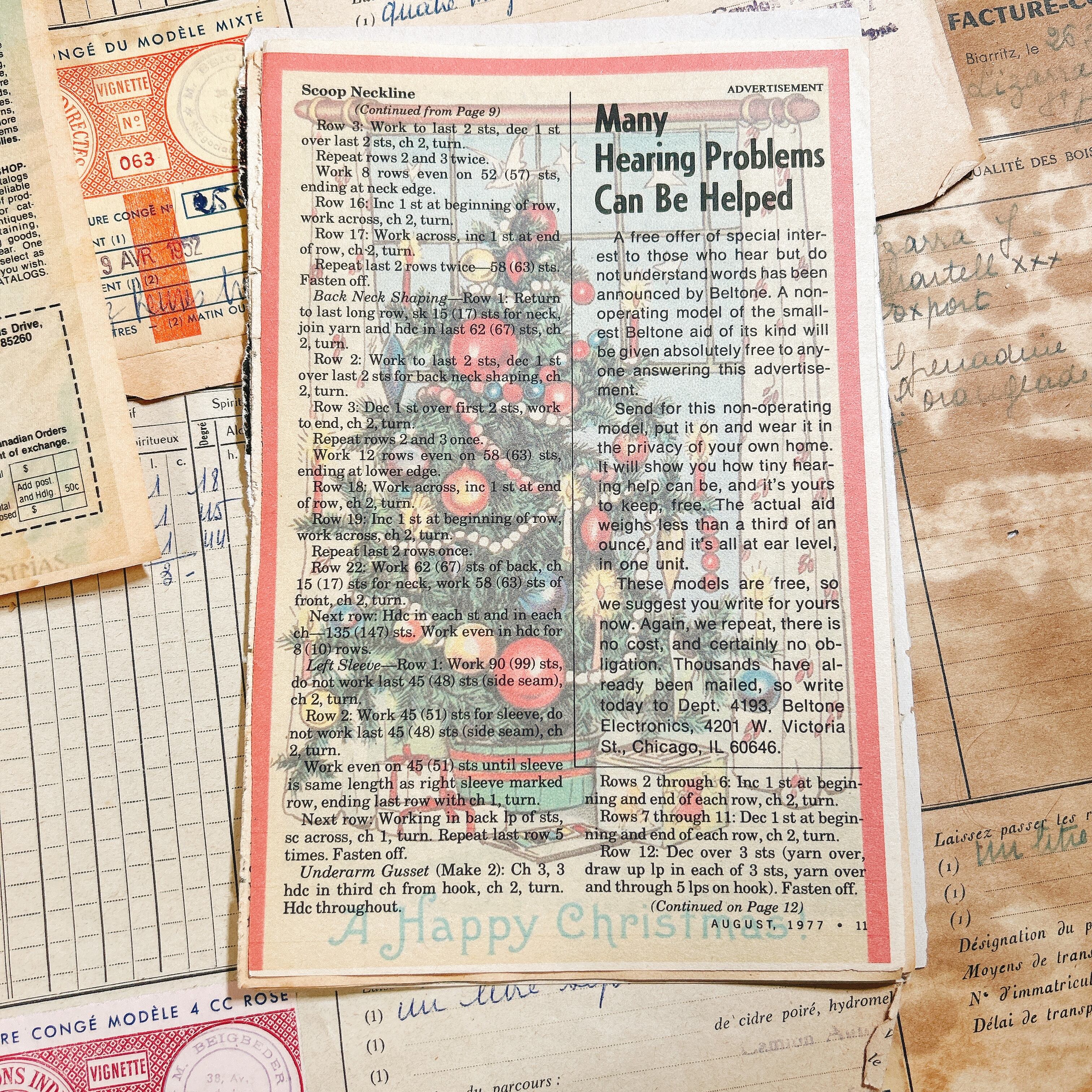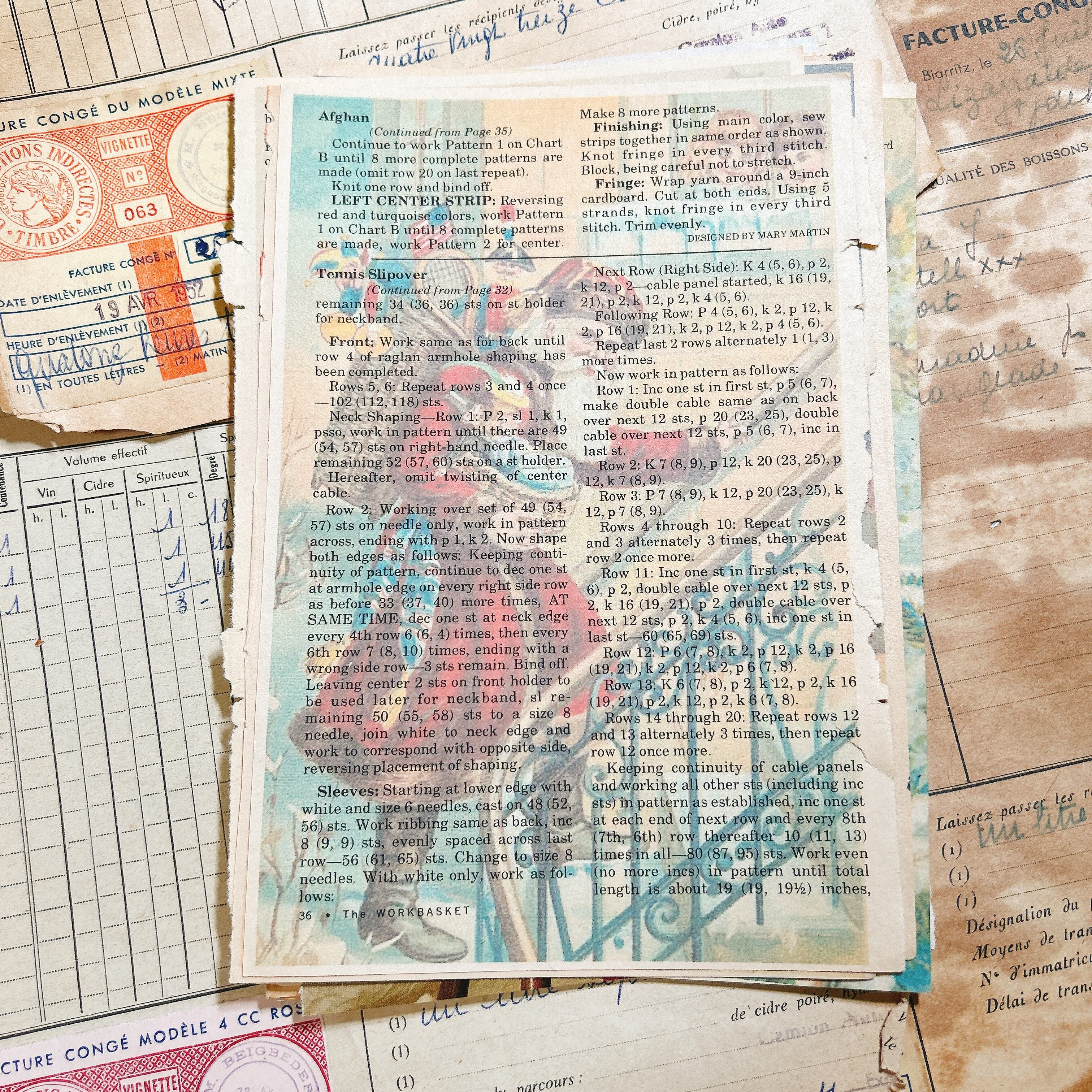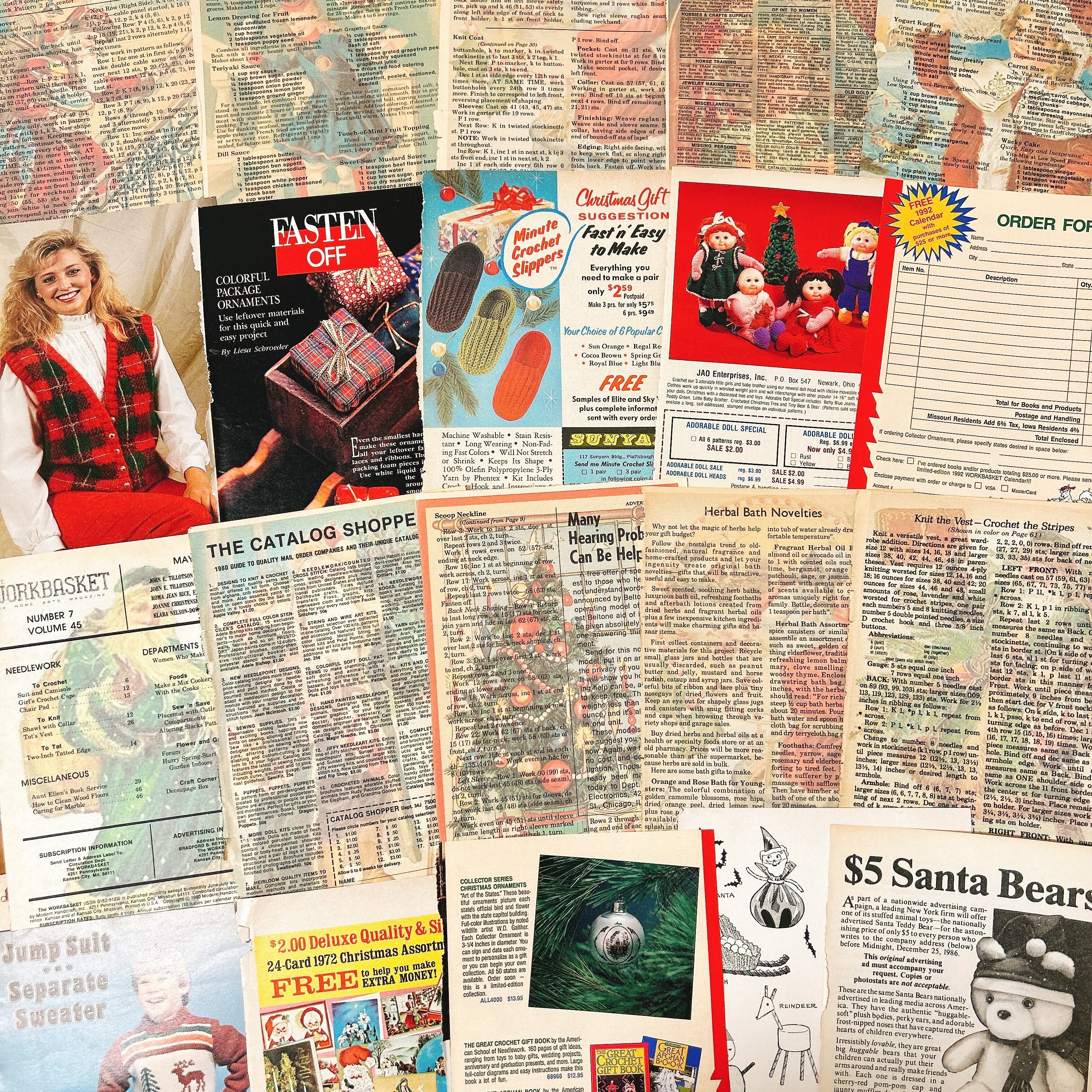 1950〜80年代にアメリカで発行された雑誌『The Workbasket』や家庭用ハンドクラフト誌から切り出した、本物のヴィンテージペーパー20枚セットです。ニットやクロシェ、刺繍、料理、手芸など家庭のぬくもりをテーマにしたページが多く、温かく優しい紙面デザインが魅力です。誌面の多くは当時の印刷技法そのままのざらりとした紙質で、経年による焼けやインクのかすれも味わいとして残っています。広告ページには当時のミシン、糸、家庭用品などが並び、アメリカの主婦たちがどんな暮らしをしていたのかを感じさせてくれます。