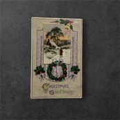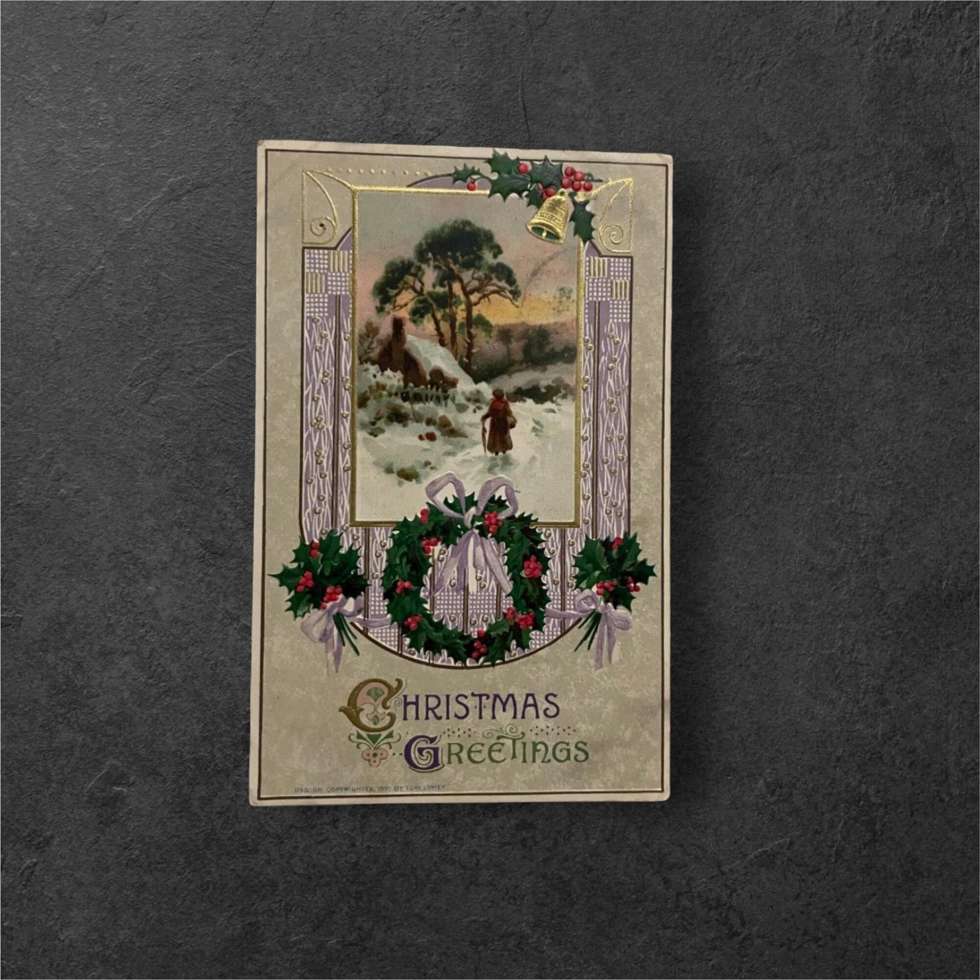 1900年代初頭、ドイツのB. DRESDEN社によって印刷されたアンティークのクリスマスポストカードです。表面には「CHRISTMAS GREETINGS」の文字とともに、美しい雪景色の中を歩く少女が描かれています。夕暮れ時の柔らかな空の色と雪原の静寂が調和し、遠くの家の煙突から立ちのぼる煙が温かな家庭のぬくもりを感じさせます。リースやベルの装飾、金彩が繊細に施され、アールヌーヴォー期らしい優雅な意匠が特徴です。印刷技術の高さと絵画的な構図が際立ち、当時のドイツ製ポストカードの品質を物語っています。