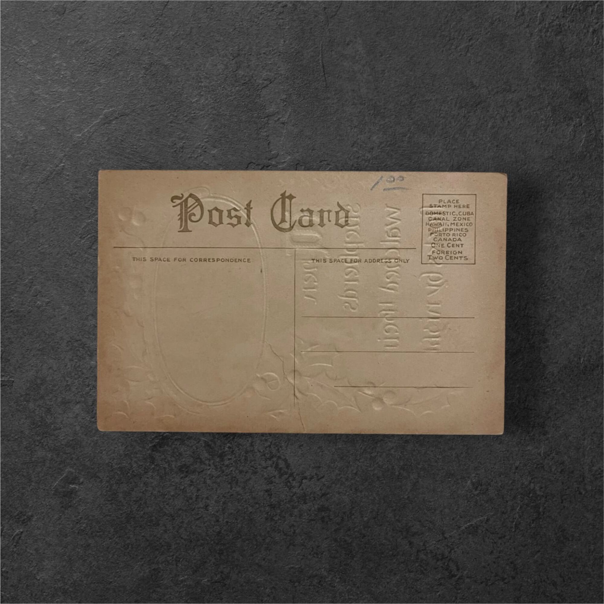 20世紀初頭のアメリカ製アンティークポストカードで、聖書の一節「When shepherds watched their flocks by night(羊飼いたちが夜、その群れを見守っていた時)」をテーマにしたクリスマスカードです。淡い水色の背景に、金の縁取りが施された楕円形のイラストが配置され、羊の群れを見守る牧羊人の姿が穏やかに描かれています。その情景は冬の静けさと信仰の温もりを感じさせ、時を越えて心に響くような荘厳さを湛えています。