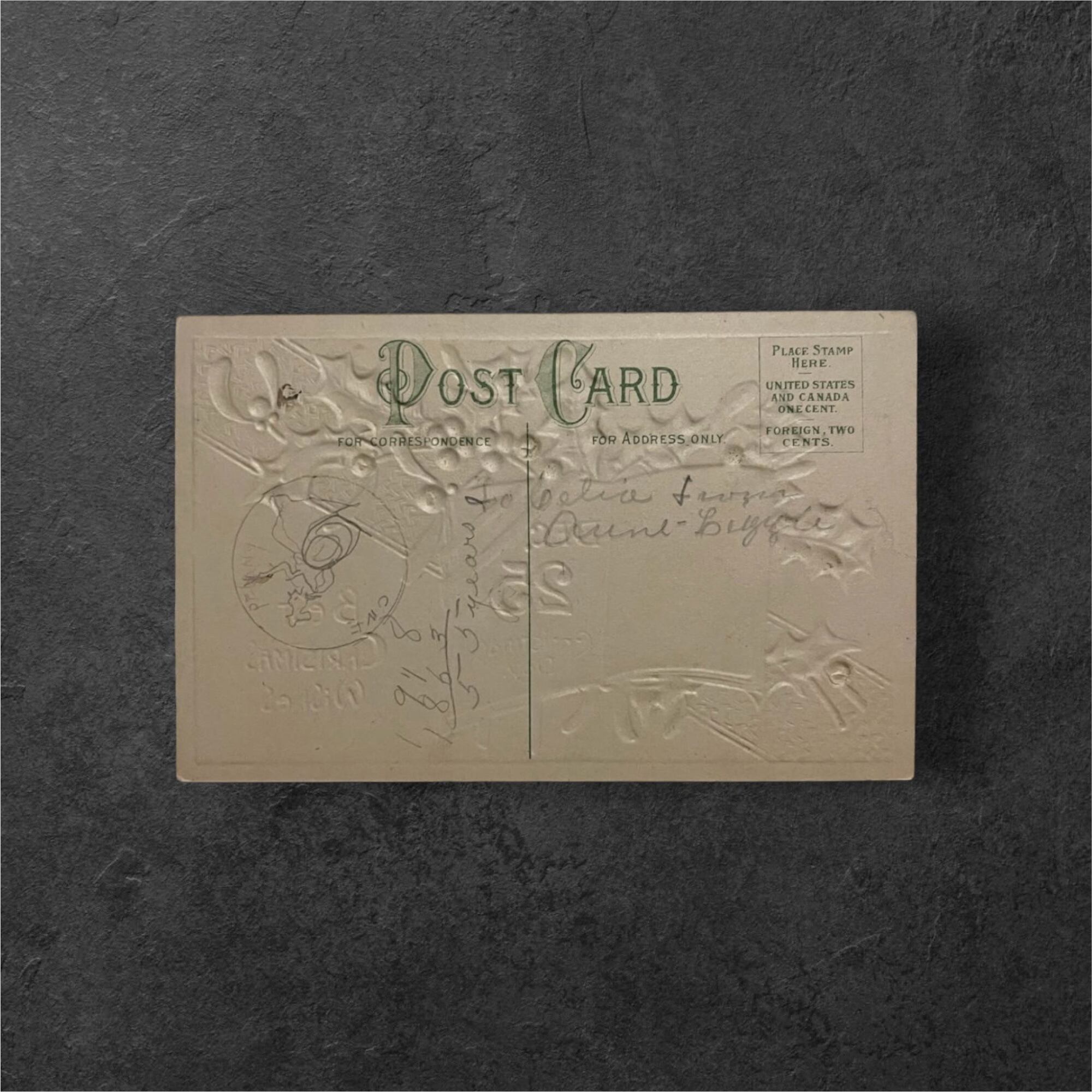 裏面にはグリーンの「POST CARD」ロゴと当時の消印が確認でき、筆記体のメッセージが残されています。消印の日付は1909年12月25日付近と読み取れ、まさにクリスマス当日に贈られたカードであることが伺えます。100年以上の年月を経てもなお、当時の紙質と印刷の美しさがしっかりと保たれています。