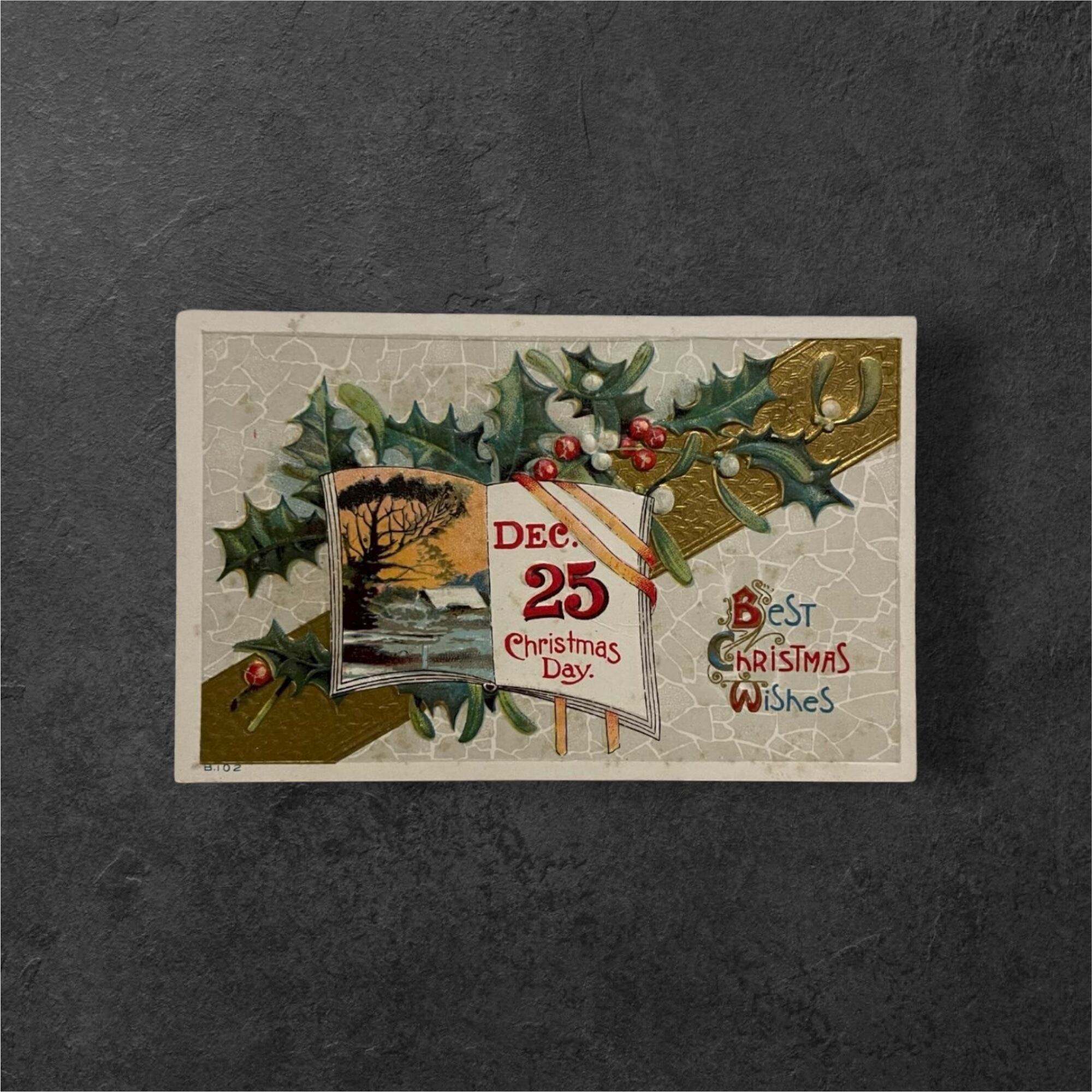 1910年前後のアメリカ製アンティーク・クリスマスポストカードです。中央には「Dec. 25 Christmas Day」の文字が赤く印刷され、金色に輝く枠の中には夕暮れの風景が小さな絵画のように収められています。背景にはヒイラギとヤドリギが絡み合い、赤い実と緑の葉が立体的なエンボス加工で表現されています。背景全体に施された細かなクラックル模様(ひび割れ調の加工)が、アンティーク特有の質感を引き立て、まるで陶器のような上品な輝きを放っています。