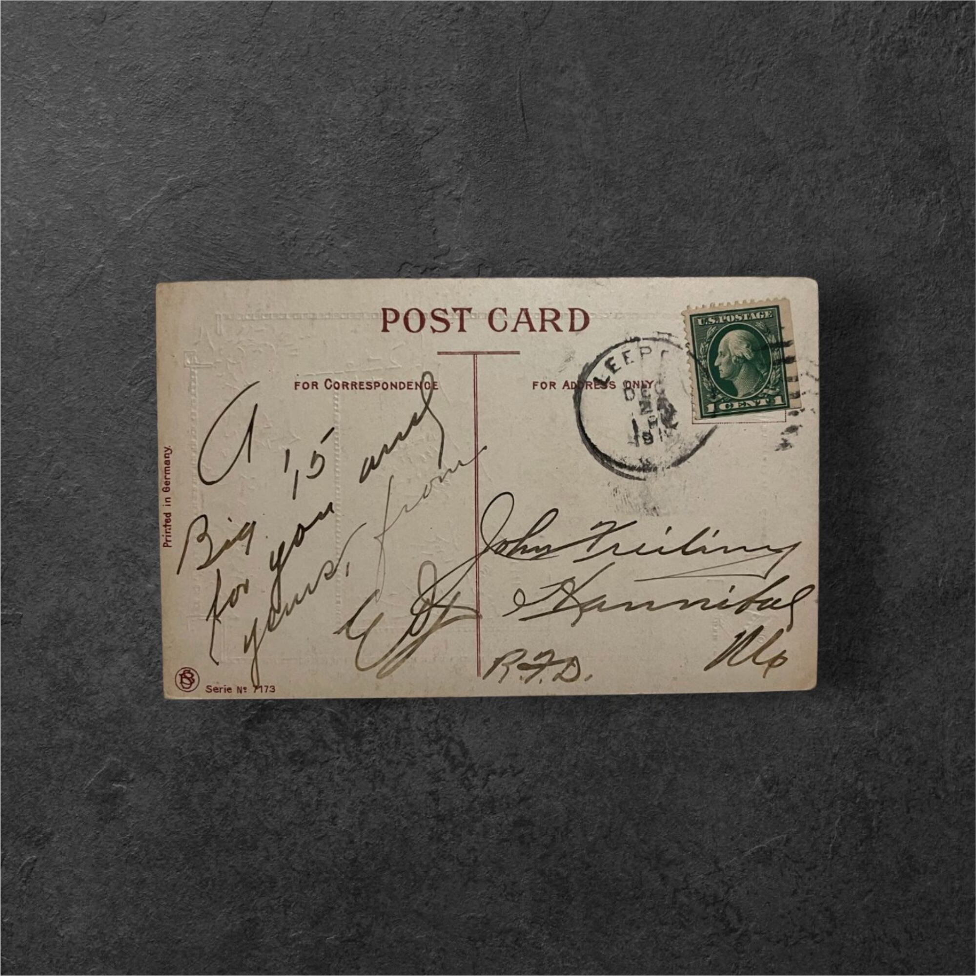裏面には当時の筆記体で直筆のメッセージが残されており、右上には1セント切手が貼付されています。消印には1912年頃の日付が見られ、100年以上前に実際に投函された実物であることがわかります。「Printed in Germany」の表記からも、当時アメリカで人気を博したドイツ製ポストカードの品質の高さがうかがえます。