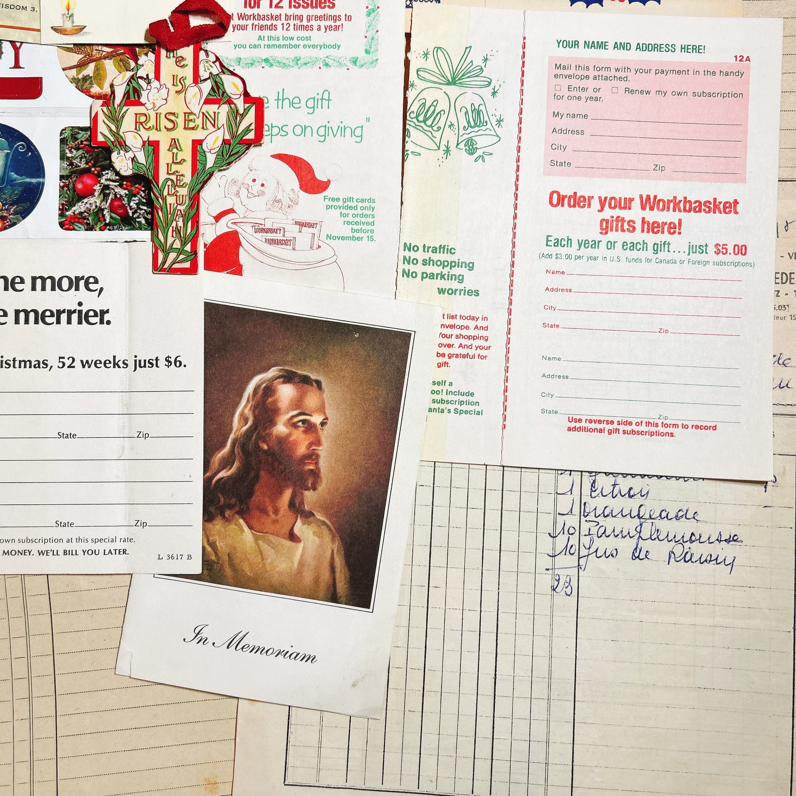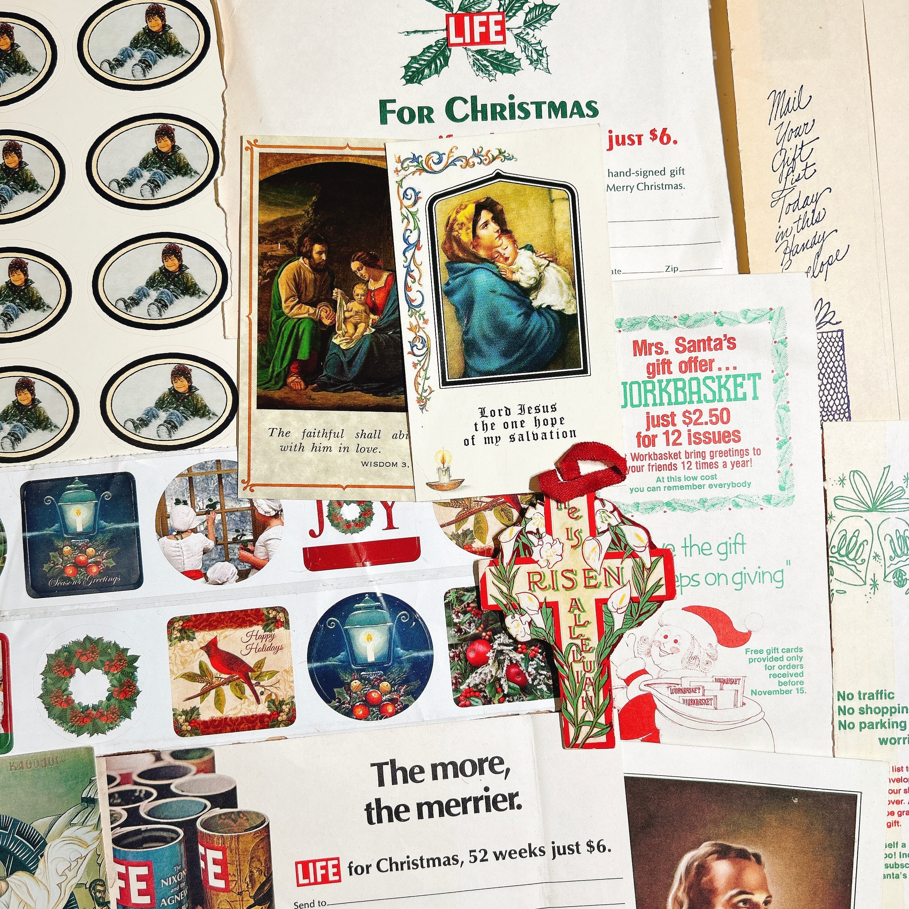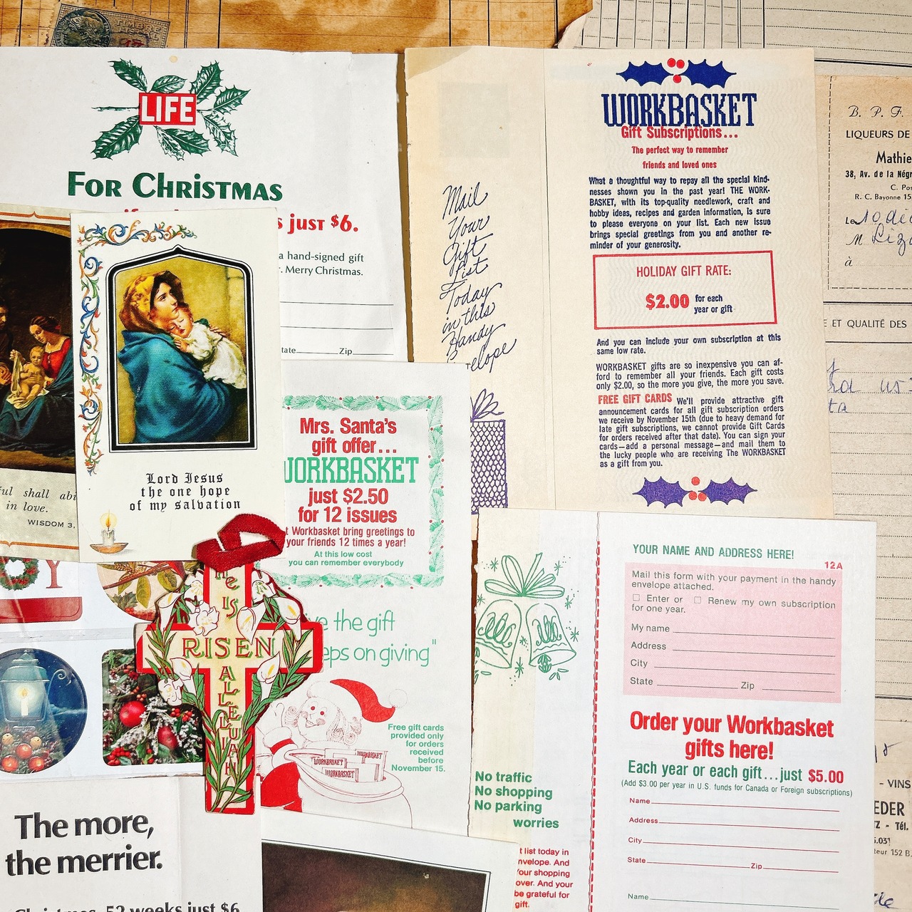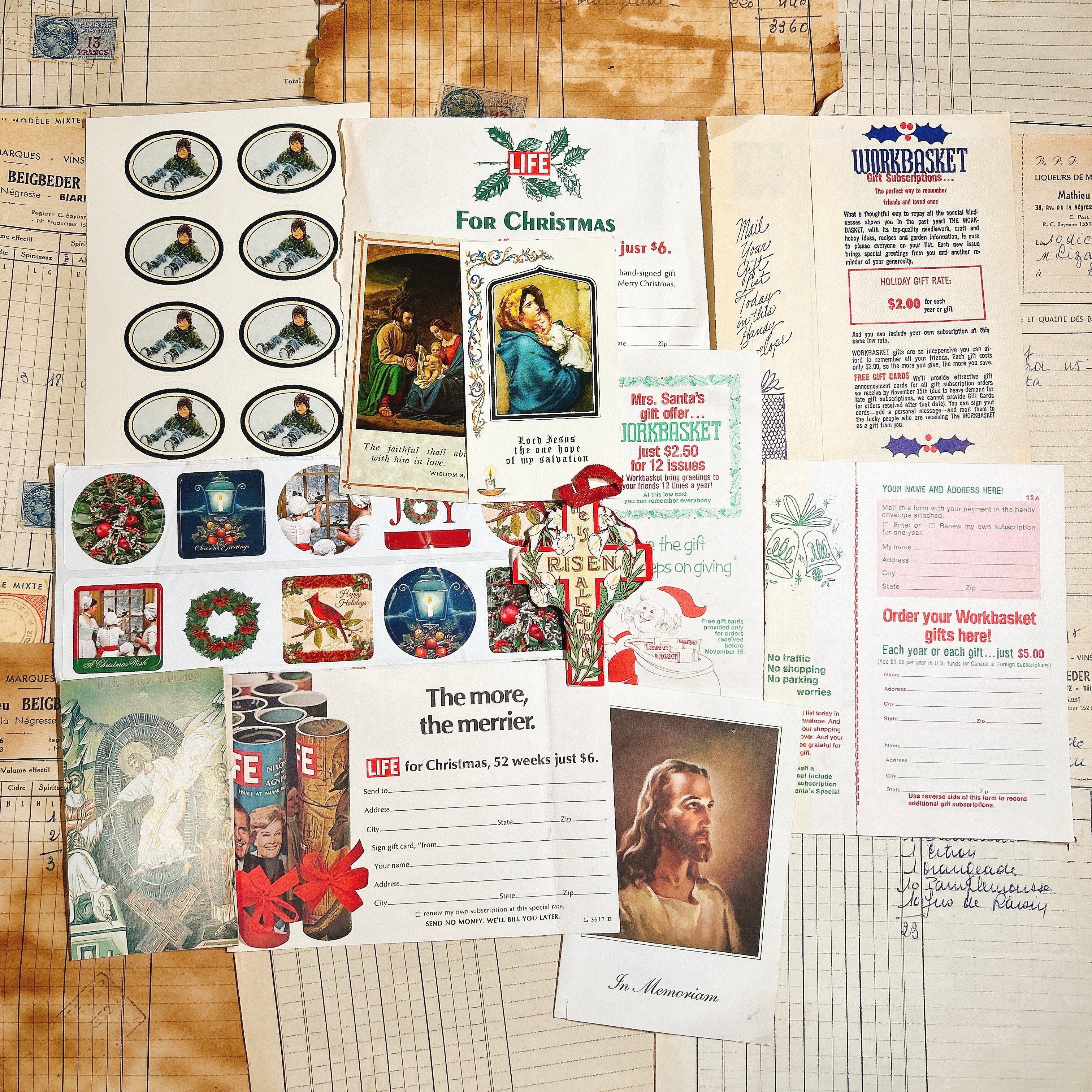1950〜70年代のアメリカで発行された、クリスマスにまつわる小さな紙ものを詰め合わせた12枚セットです。LIFE誌のギフト広告ページや“Workbasket”誌の購読申込用紙、聖母子の祈りカード、イエス・キリストの肖像カード、そしてクリスマスリースや灯りのステッカーなど、当時の温もりがそのまま残る紙片が揃っています。