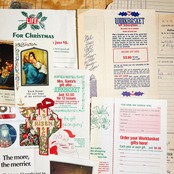 小さな十字架型のタグや、サンタクロースのイラスト入りのギフトオーダー用紙なども含まれ、ひとつひとつが異なる魅力を放ちます。どの紙片もすべて当時のオリジナルで、コピーやリプリントではありません。