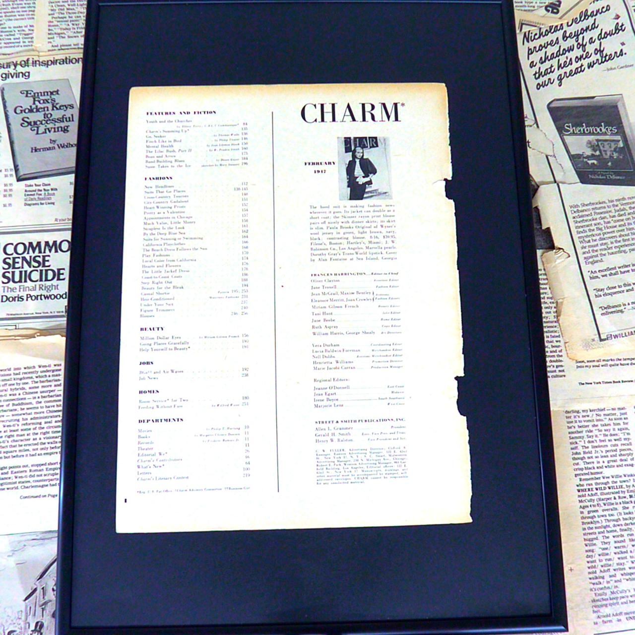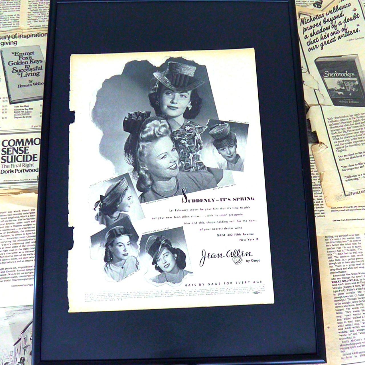 Jean Allenは、アメリカのファッション業界で知られる帽子ブランドです。特に1940年代から1950年代にかけて、洗練されたデザインと高品質な素材によるレディースハットの製造で人気を博しました。多彩なスタイルと時代のトレンドを巧みに取り入れたJean Allenの帽子は、都市部のファッショニスタたちに愛され、エレガンスと個性を演出するアイテムとして多くの女性に支持されてきました。この広告からも分かる通り、季節ごとの新作や流行を常に提案し続ける姿勢が特徴です。