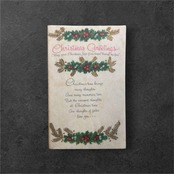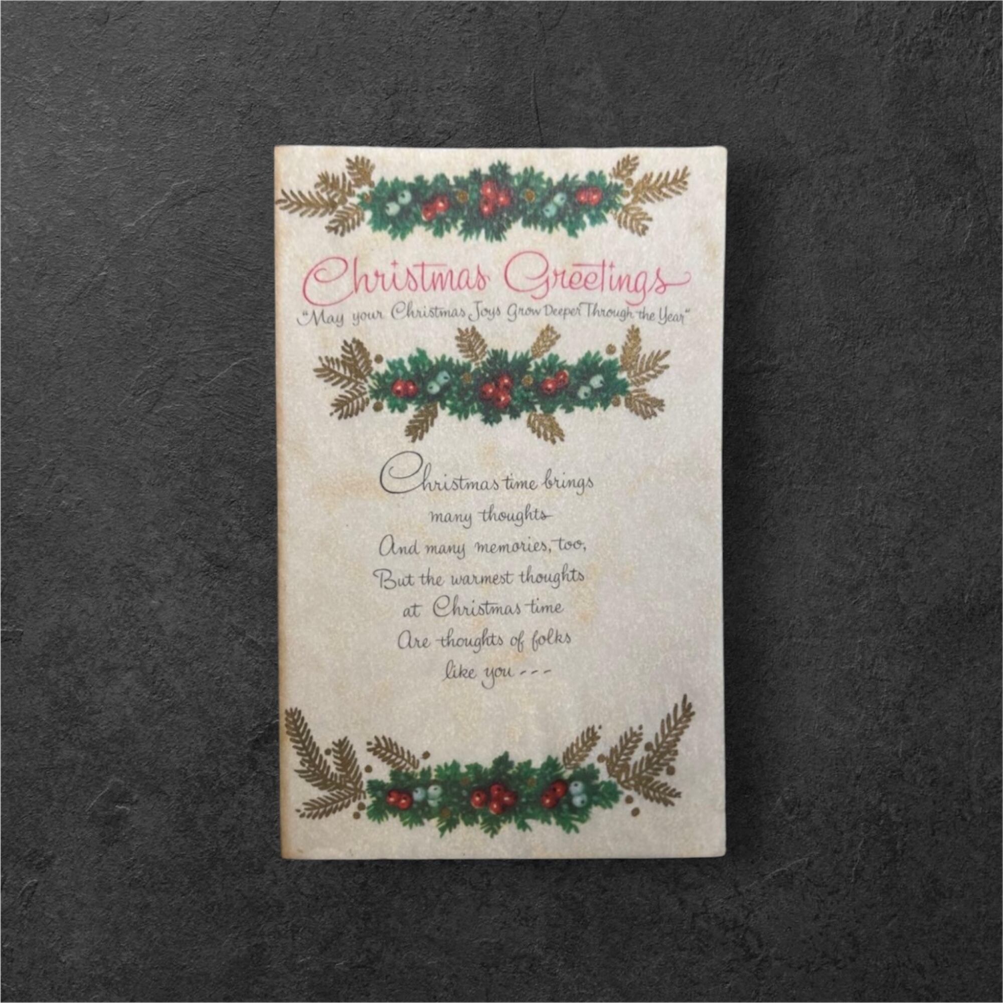 こちらは、アメリカの老舗カードメーカー「Rust Craft」社によるヴィンテージ・クリスマスカードです。優しい生成り色の紙に、深い緑と赤で描かれたリースと針葉樹のモチーフが上下に配され、中央には繊細な筆記体で温かいメッセージが綴られています。タイトルの「Christmas Greetings」がピンクのインクで浮かび上がり、まるで雪の中の灯りのように柔らかな印象を与えます。