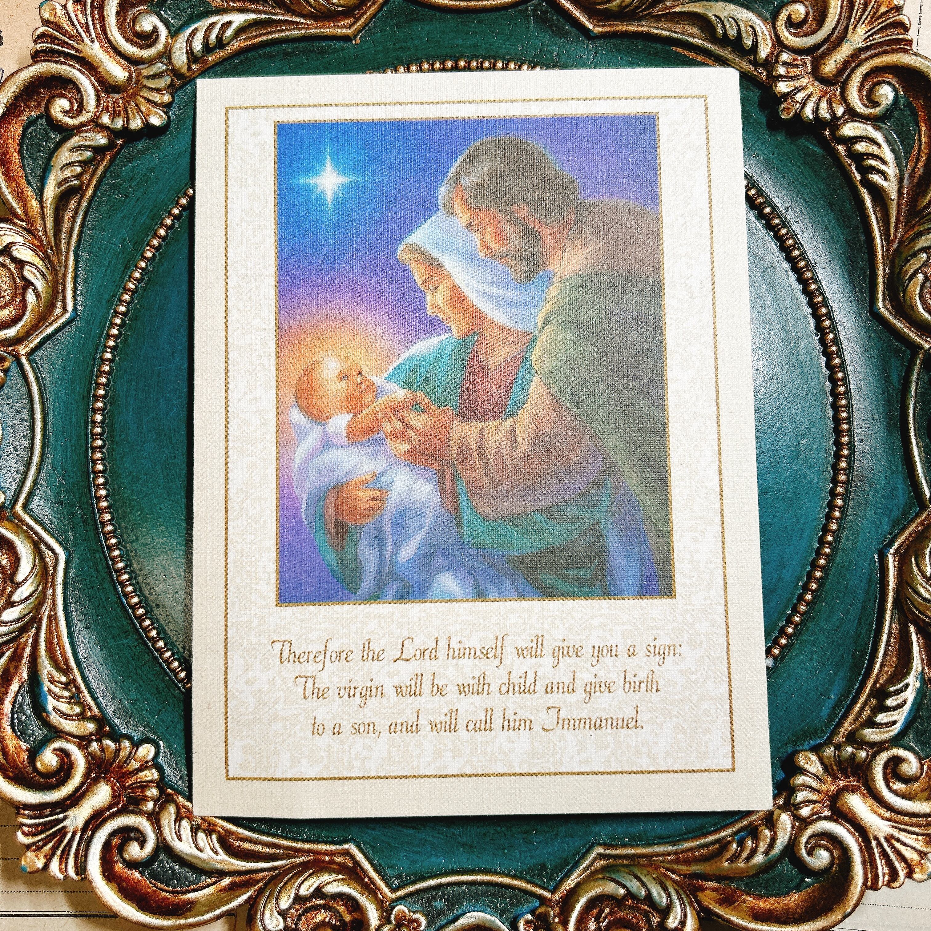 静かな祈りのような光に包まれた、聖家族の美しいイラストが描かれたアメリカ製のクリスマスカードです。表紙には「Therefore the Lord himself will give you a sign: The virgin will be with child and give birth to a son, and will call him Immanuel.(それゆえ主自らあなたにしるしを与えられる。処女は身ごもって男の子を産み、その名をインマヌエルと呼ぶ)」と聖書の一節が印刷され、神聖な静けさをたたえています。淡いゴールドの縁取りと柔らかなリネン調の紙質が、まるで一枚の絵画のような重厚感を演出します。