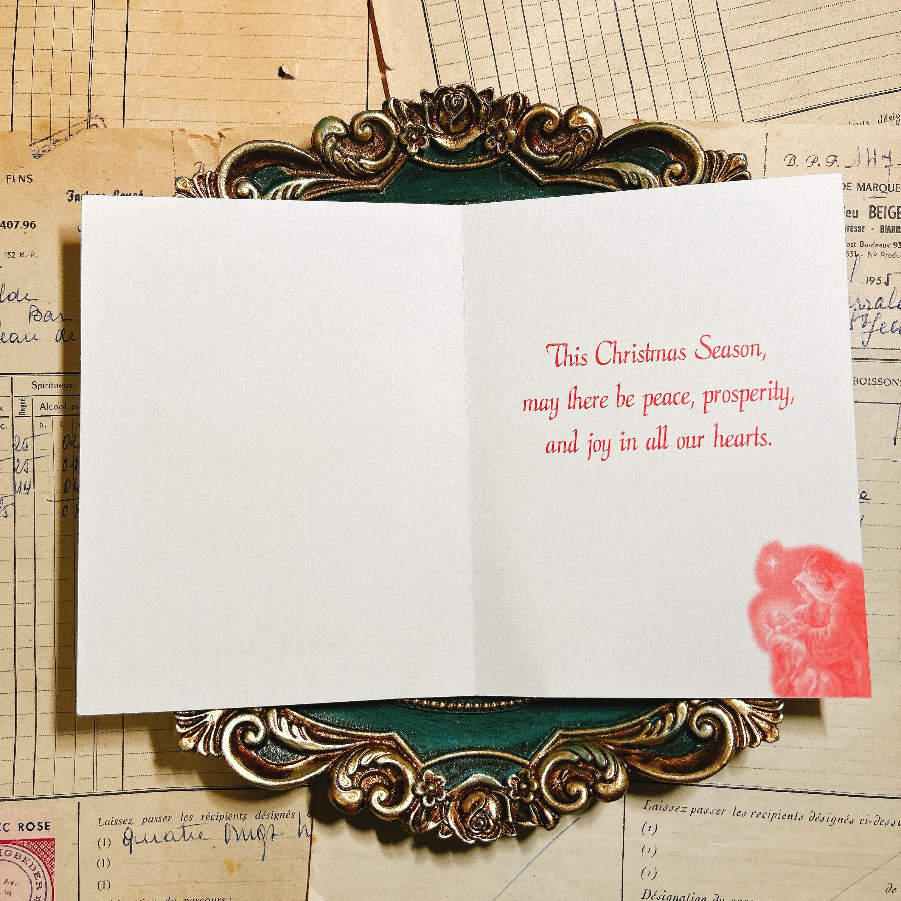内側には「This Christmas Season, may there be peace, prosperity, and joy in all our hearts.」という温かなメッセージが赤いインクで記され、ページの下には淡い赤で描かれた聖母子のシルエットが添えられています。そのシンプルな構成が、言葉以上に深い祈りの気持ちを伝えてくれます。裏面にはイラストレーターDouglas C. Westのサインが印刷されており、2003年に制作された作品であることがわかります。